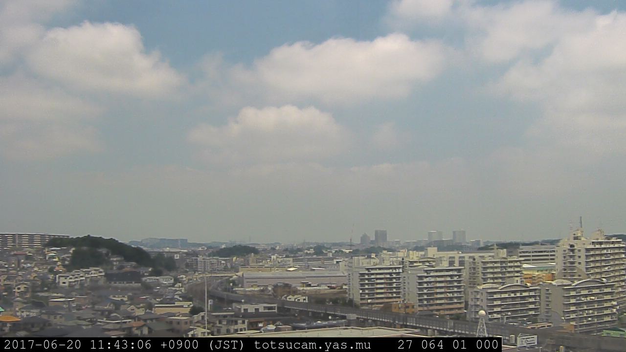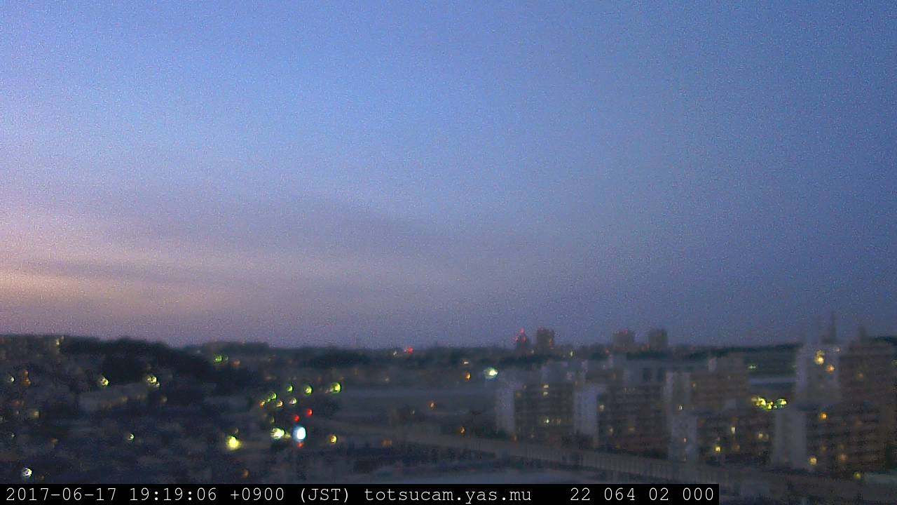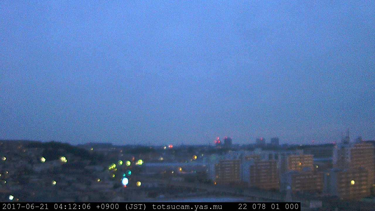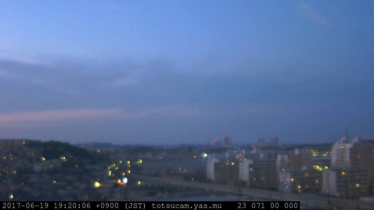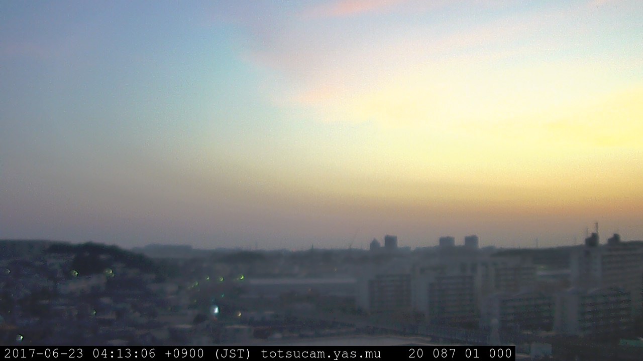 横浜市戸塚駅周辺から 東戸塚方面(北北東)を望む展望カメラの映像です。 左は現在の映像です。 下に並んでいるのは、 7日間に亘る日の出どき、昼間、夕暮れどきの写真(サムネイル)です。 それぞれ、日の出15分前、南中時、日没20分後の写真となっています。 各写真の下にはmpeg形式の動画へのリンクがあります。 それぞれ、日の出、南中、日没の前後1時間の画像です。 右欄にはその日24時間の動画へのリンクがあります。 この7日間以外は日付が一覧表示されています。 日付部分をクリックすると、 その日付から7日分が展開されて表示されます。