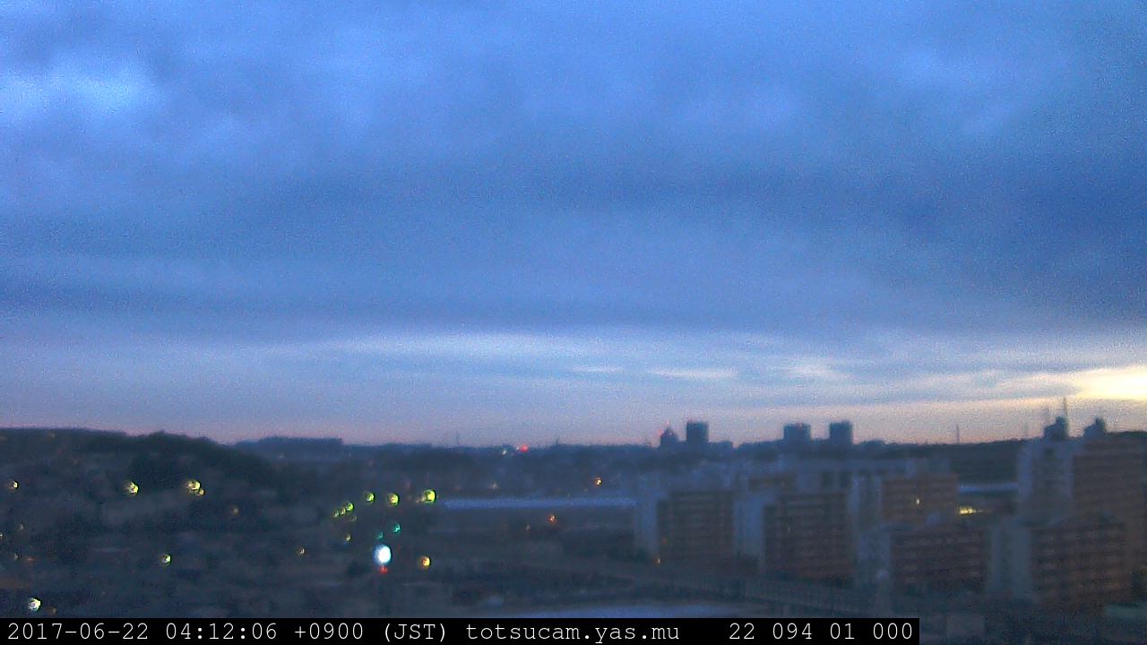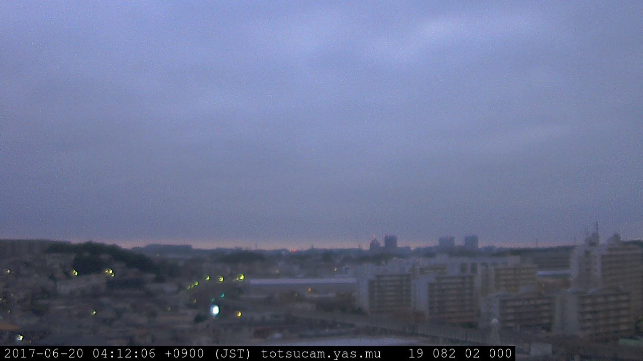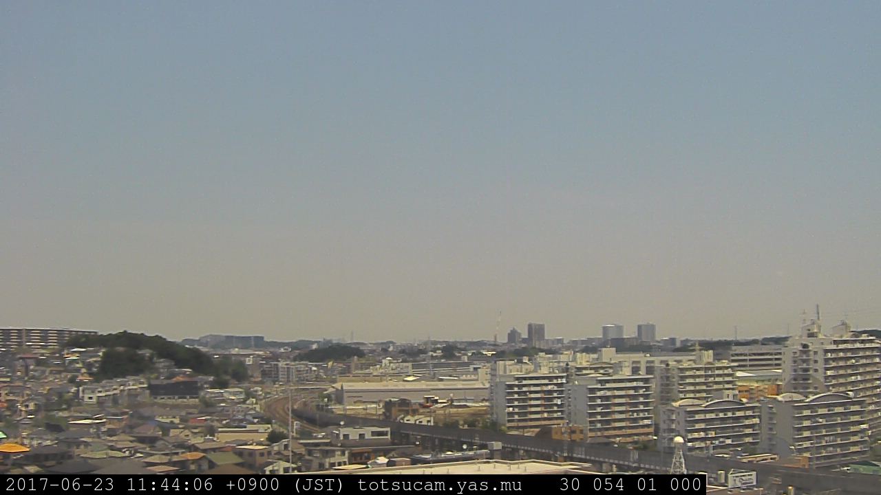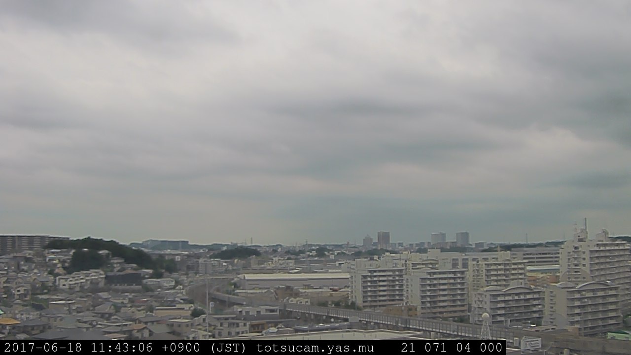 横浜市戸塚駅周辺から 東戸塚方面(北北東)を望む展望カメラの映像です。 左は現在の映像です。 下に並んでいるのは、 7日間に亘る日の出どき、昼間、夕暮れどきの写真(サムネイル)です。 それぞれ、日の出15分前、南中時、日没20分後の写真となっています。 各写真の下にはmpeg形式の動画へのリンクがあります。 それぞれ、日の出、南中、日没の前後1時間の画像です。 右欄にはその日24時間の動画へのリンクがあります。 この7日間以外は日付が一覧表示されています。 日付部分をクリックすると、 その日付から7日分が展開されて表示されます。