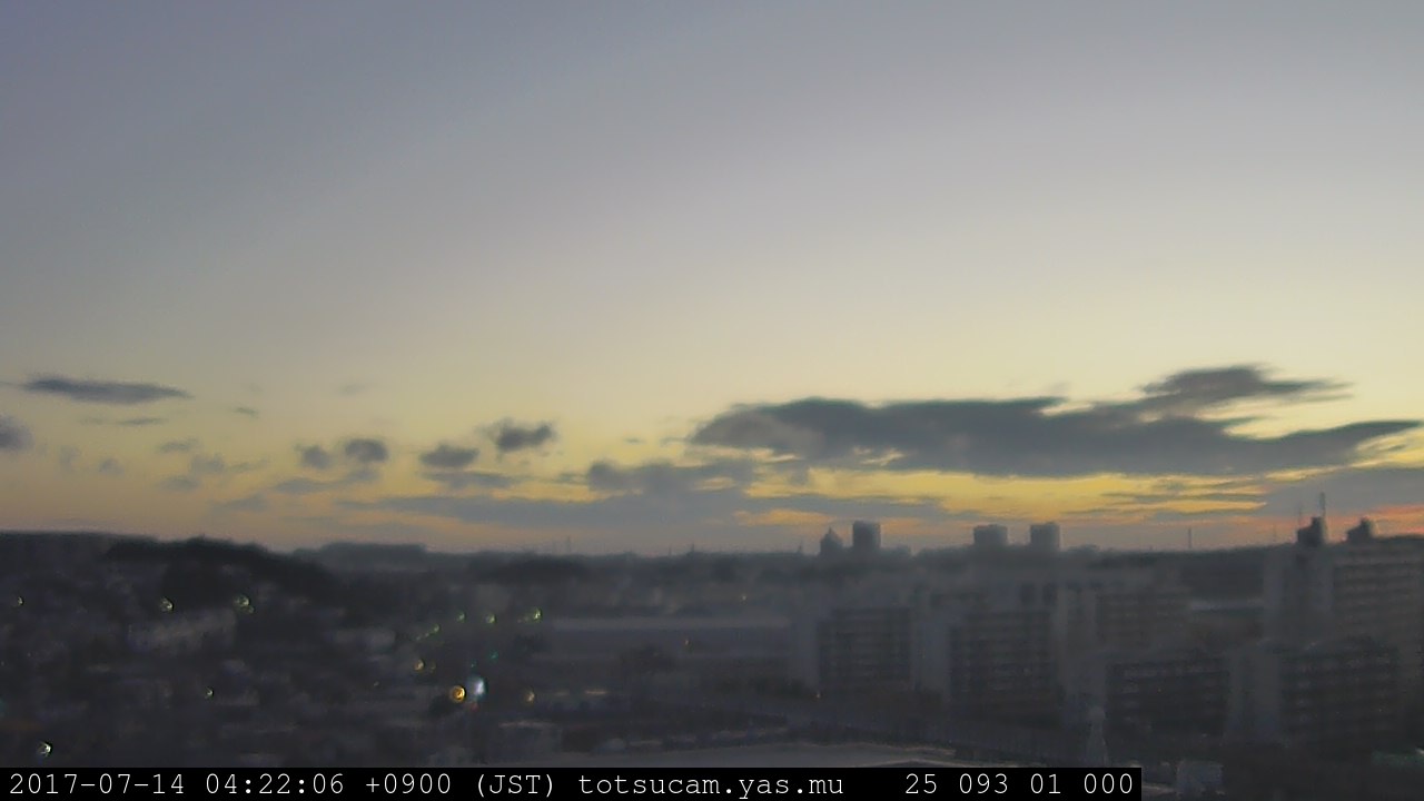 横浜市戸塚駅周辺から 東戸塚方面(北北東)を望む展望カメラの映像です。 左は現在の映像です。 下に並んでいるのは、 7日間に亘る日の出どき、昼間、夕暮れどきの写真(サムネイル)です。 それぞれ、日の出15分前、南中時、日没20分後の写真となっています。 各写真の下にはmpeg形式の動画へのリンクがあります。 それぞれ、日の出、南中、日没の前後1時間の画像です。 右欄にはその日24時間の動画へのリンクがあります。 この7日間以外は日付が一覧表示されています。 日付部分をクリックすると、 その日付から7日分が展開されて表示されます。
