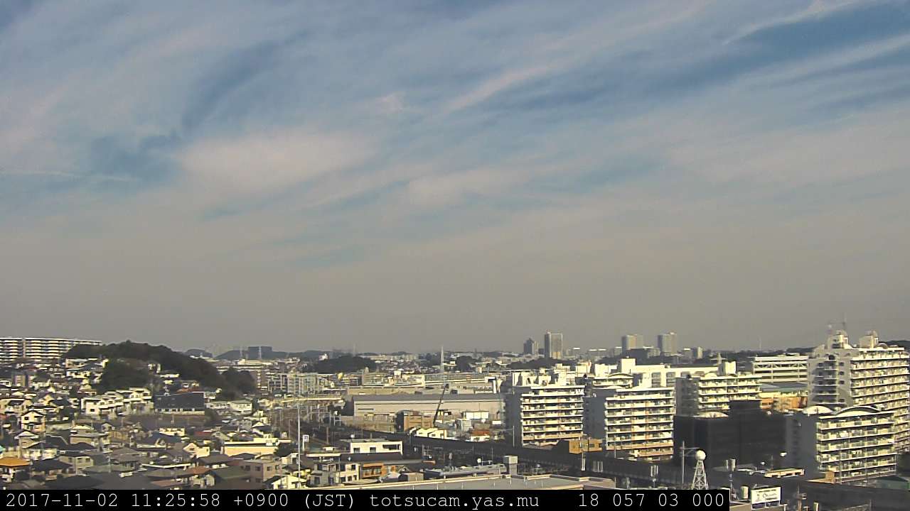 適度に曇った日の雲の動き (例: 2005-10-24) がとても楽しめます。 正面を横切っている高架は横須賀線下りです。 その下に横須賀線上り、東海道線、同貨物線が走っていますが、 高架に隠れていてよく見えません。 夜間は特に中央左寄りの車の動きがよく見えます。