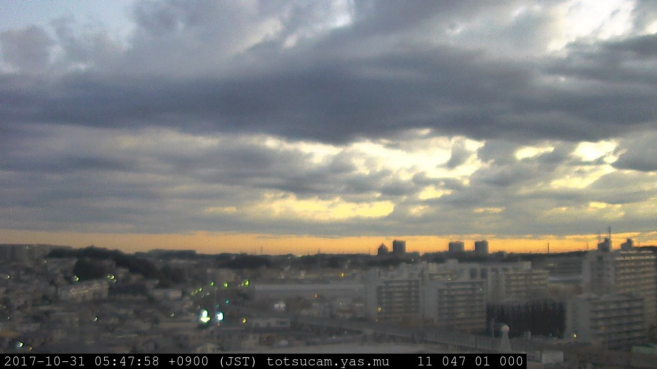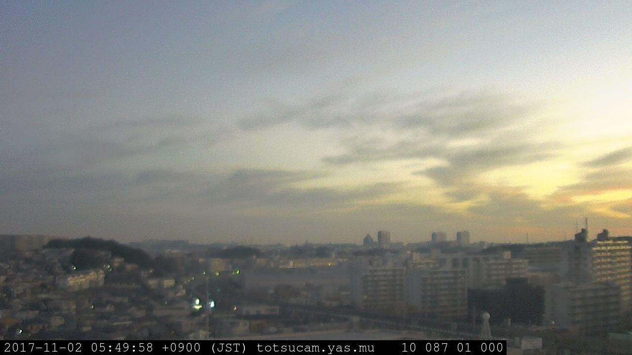 横浜市戸塚駅周辺から 東戸塚方面(北北東)を望む展望カメラの映像です。 左は現在の映像です。 下に並んでいるのは、 7日間に亘る日の出どき、昼間、夕暮れどきの写真(サムネイル)です。 それぞれ、日の出15分前、南中時、日没20分後の写真となっています。 各写真の下にはmpeg形式の動画へのリンクがあります。 それぞれ、日の出、南中、日没の前後1時間の画像です。 右欄にはその日24時間の動画へのリンクがあります。 この7日間以外は日付が一覧表示されています。 日付部分をクリックすると、 その日付から7日分が展開されて表示されます。