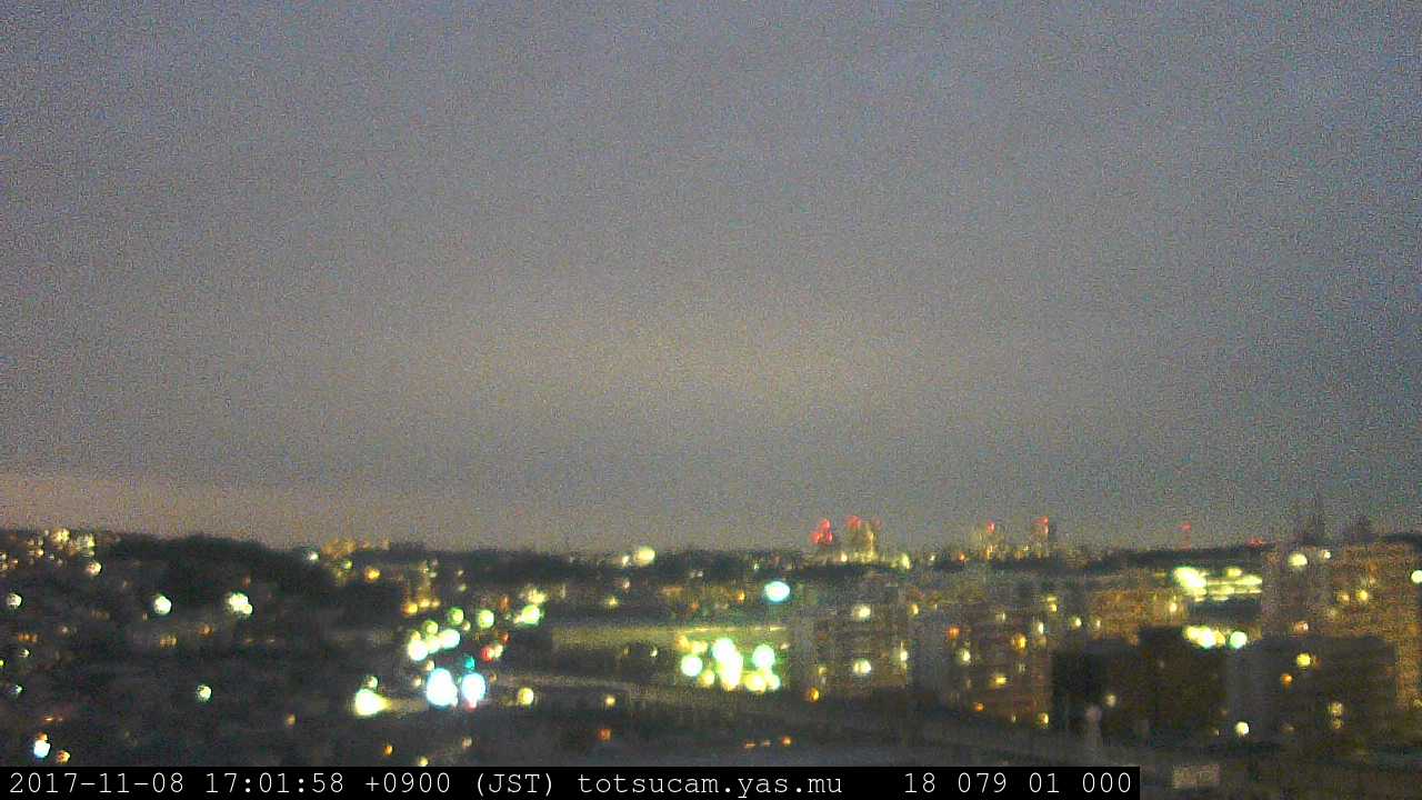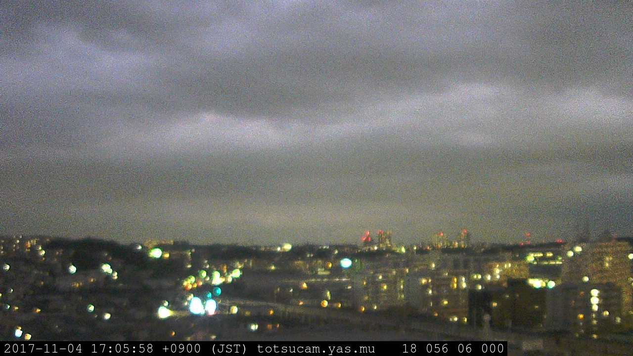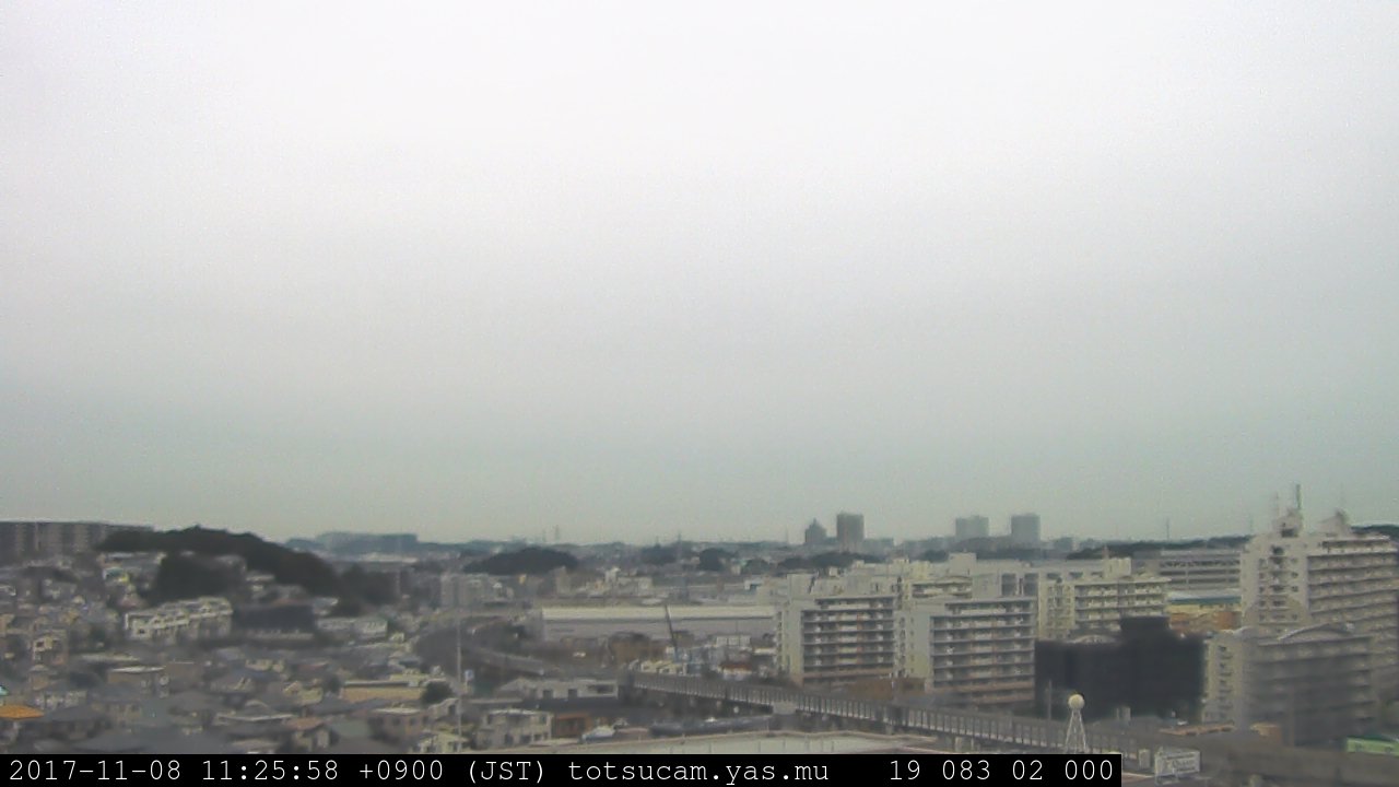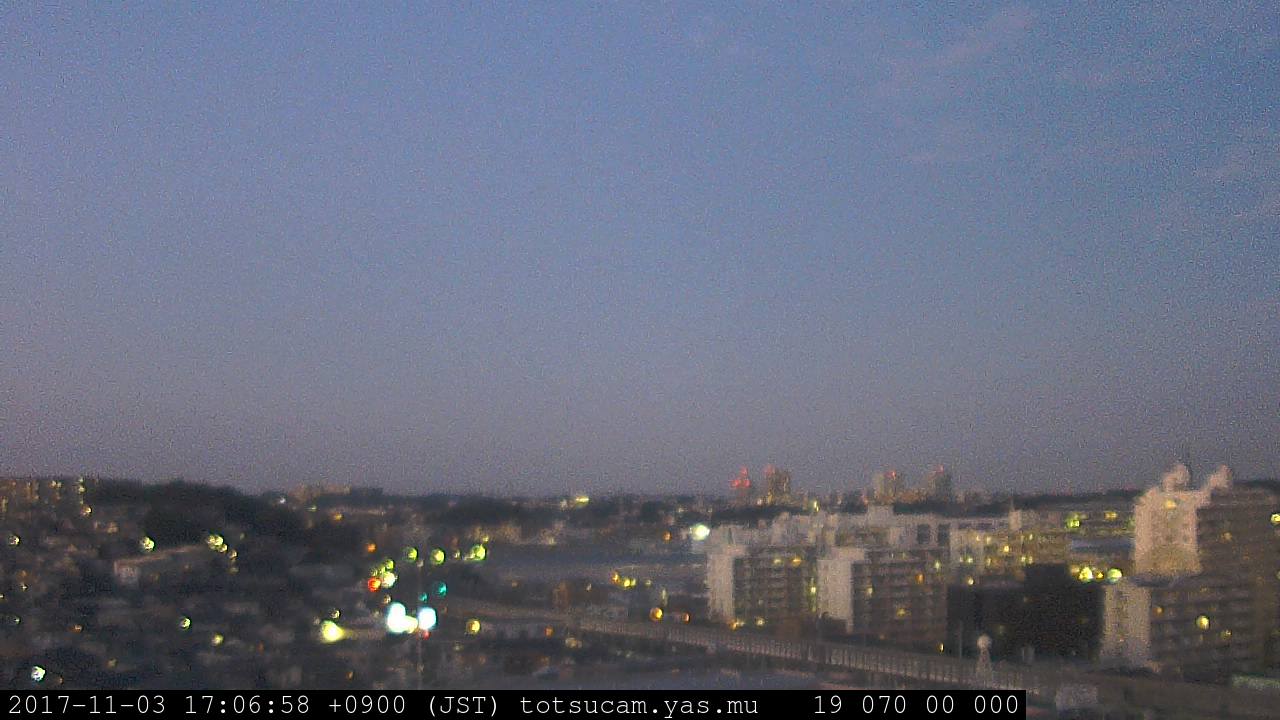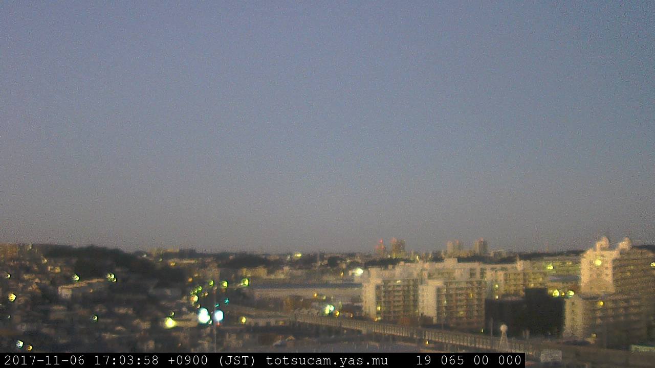 適度に曇った日の雲の動き (例: 2005-10-24) がとても楽しめます。 正面を横切っている高架は横須賀線下りです。 その下に横須賀線上り、東海道線、同貨物線が走っていますが、 高架に隠れていてよく見えません。 夜間は特に中央左寄りの車の動きがよく見えます。
