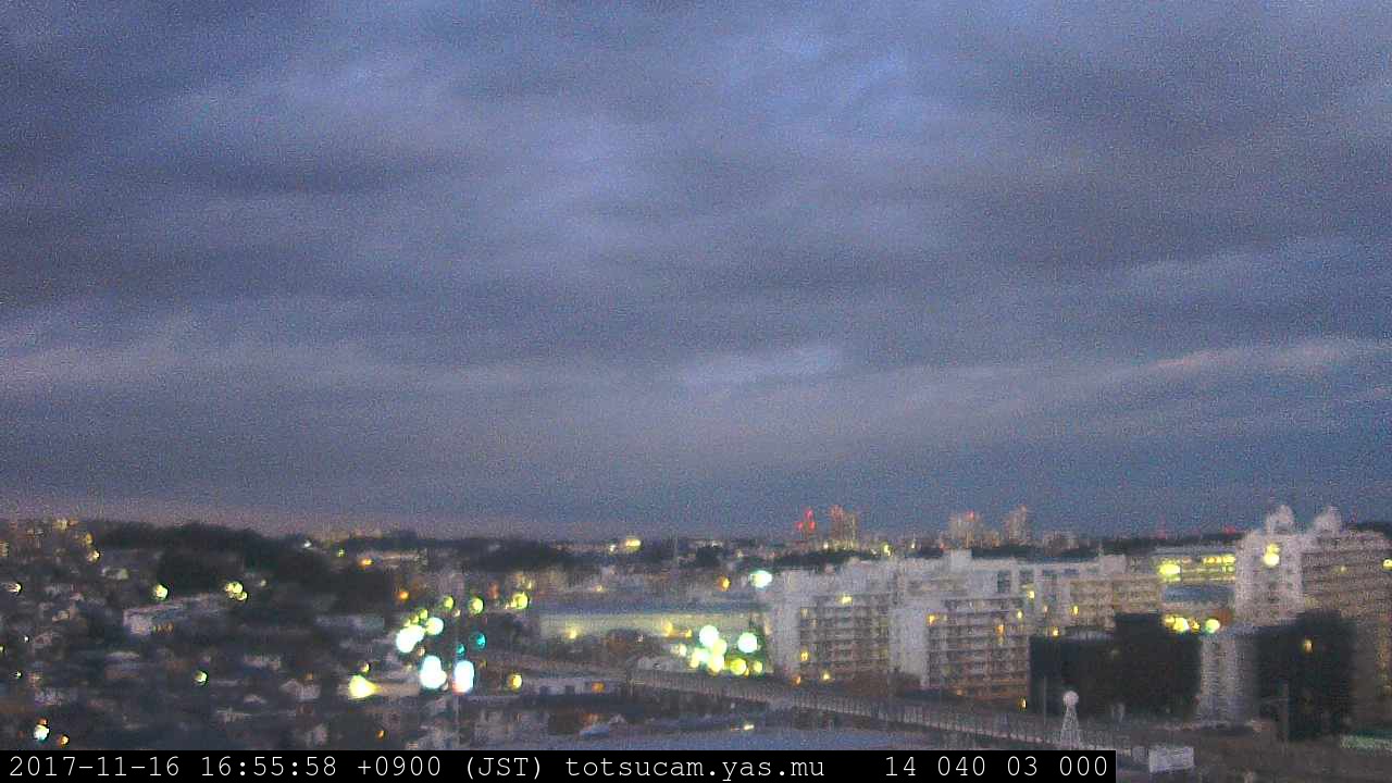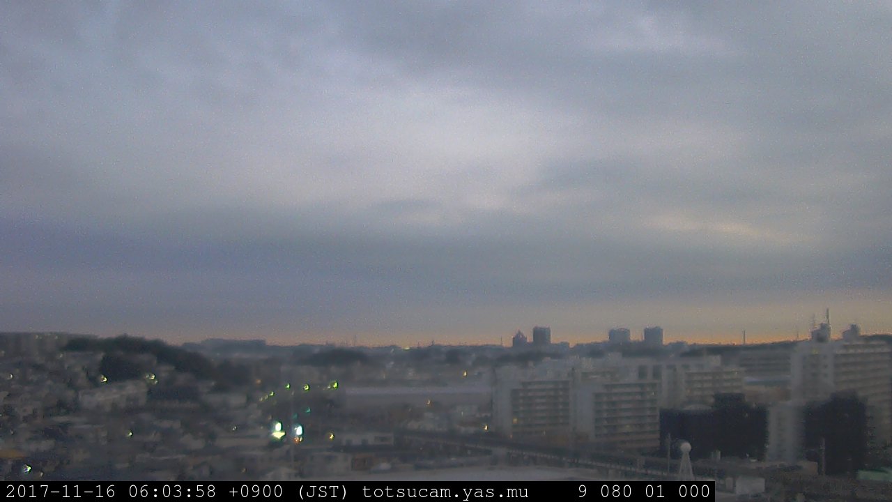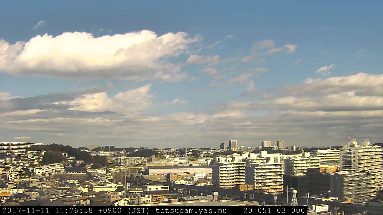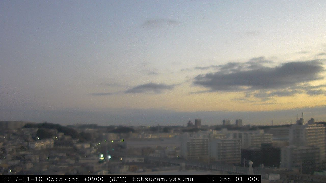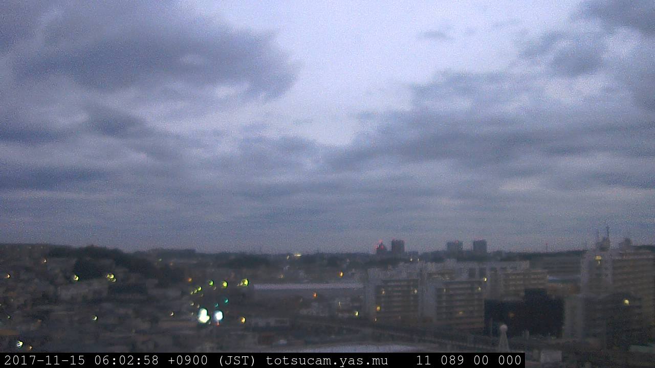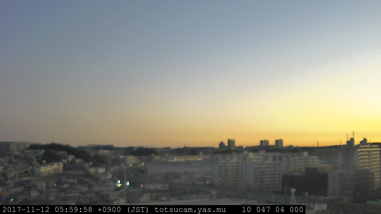 横浜市戸塚駅周辺から 東戸塚方面(北北東)を望む展望カメラの映像です。 左は現在の映像です。 下に並んでいるのは、 7日間に亘る日の出どき、昼間、夕暮れどきの写真(サムネイル)です。 それぞれ、日の出15分前、南中時、日没20分後の写真となっています。 各写真の下にはmpeg形式の動画へのリンクがあります。 それぞれ、日の出、南中、日没の前後1時間の画像です。 右欄にはその日24時間の動画へのリンクがあります。 この7日間以外は日付が一覧表示されています。 日付部分をクリックすると、 その日付から7日分が展開されて表示されます。