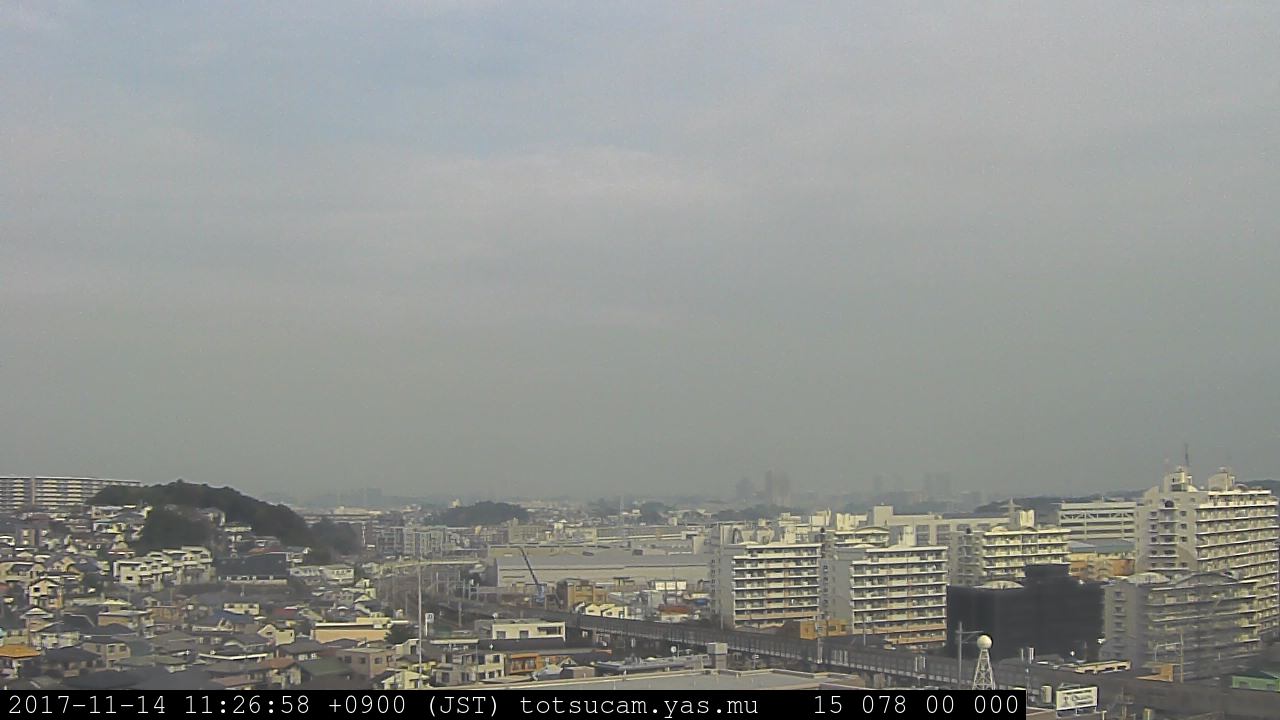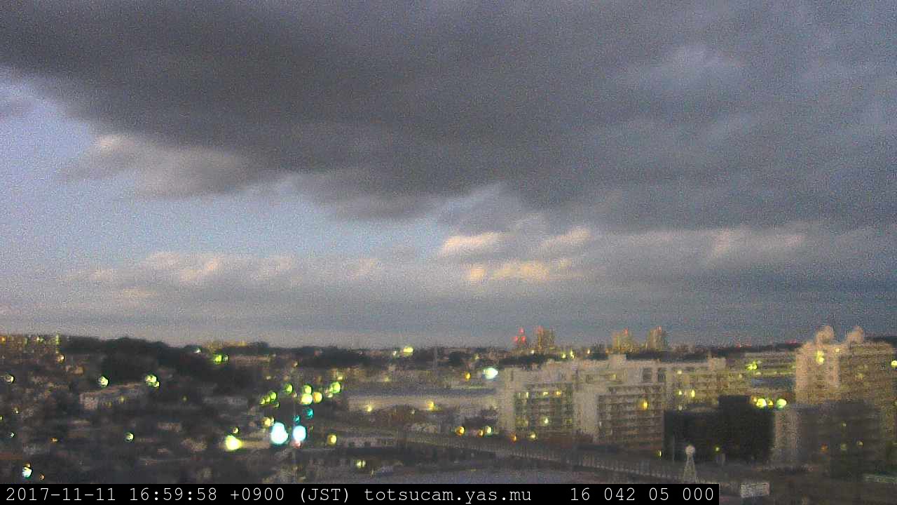 適度に曇った日の雲の動き (例: 2005-10-24) がとても楽しめます。 正面を横切っている高架は横須賀線下りです。 その下に横須賀線上り、東海道線、同貨物線が走っていますが、 高架に隠れていてよく見えません。 夜間は特に中央左寄りの車の動きがよく見えます。