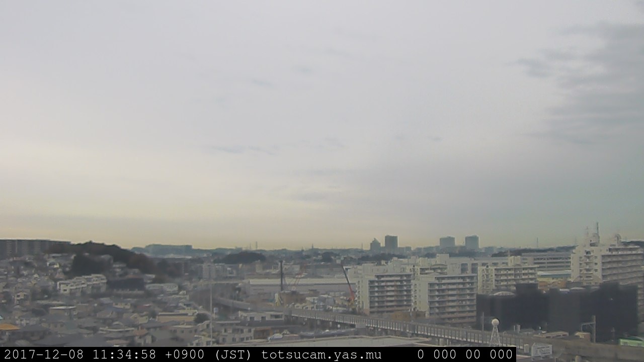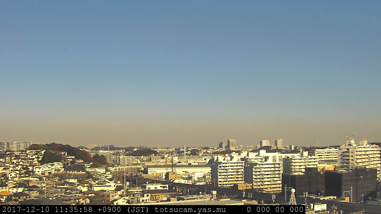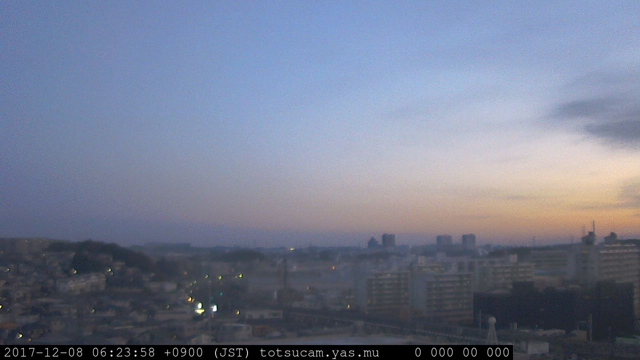 横浜市戸塚駅周辺から 東戸塚方面(北北東)を望む展望カメラの映像です。 左は現在の映像です。 下に並んでいるのは、 7日間に亘る日の出どき、昼間、夕暮れどきの写真(サムネイル)です。 それぞれ、日の出15分前、南中時、日没20分後の写真となっています。 各写真の下にはmpeg形式の動画へのリンクがあります。 それぞれ、日の出、南中、日没の前後1時間の画像です。 右欄にはその日24時間の動画へのリンクがあります。 この7日間以外は日付が一覧表示されています。 日付部分をクリックすると、 その日付から7日分が展開されて表示されます。