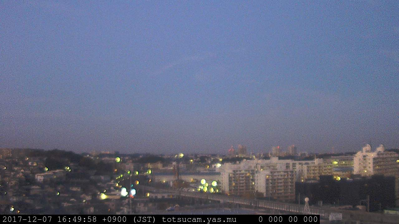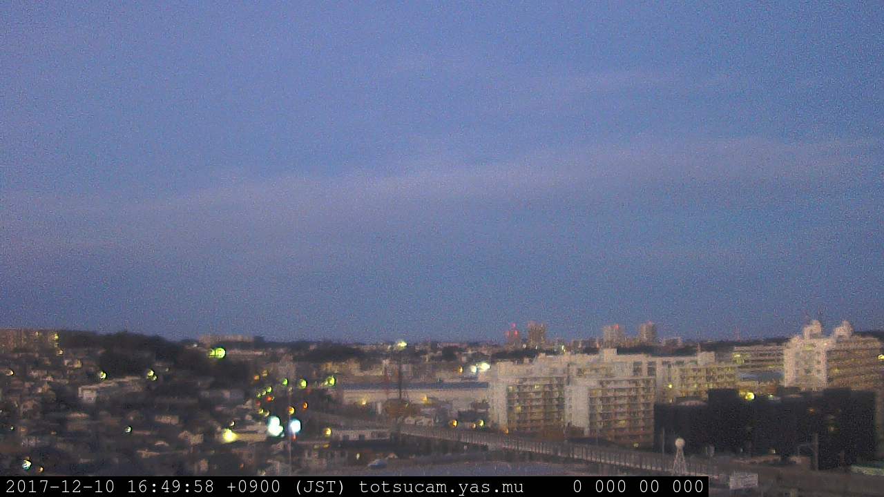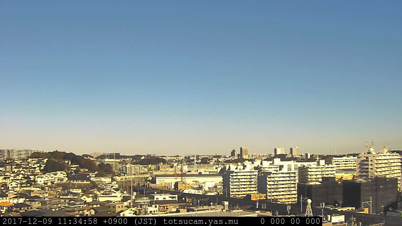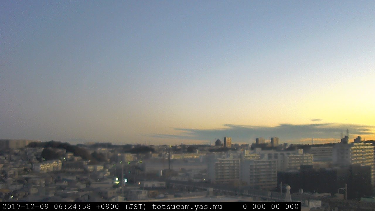 横浜市戸塚駅周辺から 東戸塚方面(北北東)を望む展望カメラの映像です。 左は現在の映像です。 下に並んでいるのは、 7日間に亘る日の出どき、昼間、夕暮れどきの写真(サムネイル)です。 それぞれ、日の出15分前、南中時、日没20分後の写真となっています。 各写真の下にはmpeg形式の動画へのリンクがあります。 それぞれ、日の出、南中、日没の前後1時間の画像です。 右欄にはその日24時間の動画へのリンクがあります。 この7日間以外は日付が一覧表示されています。 日付部分をクリックすると、 その日付から7日分が展開されて表示されます。