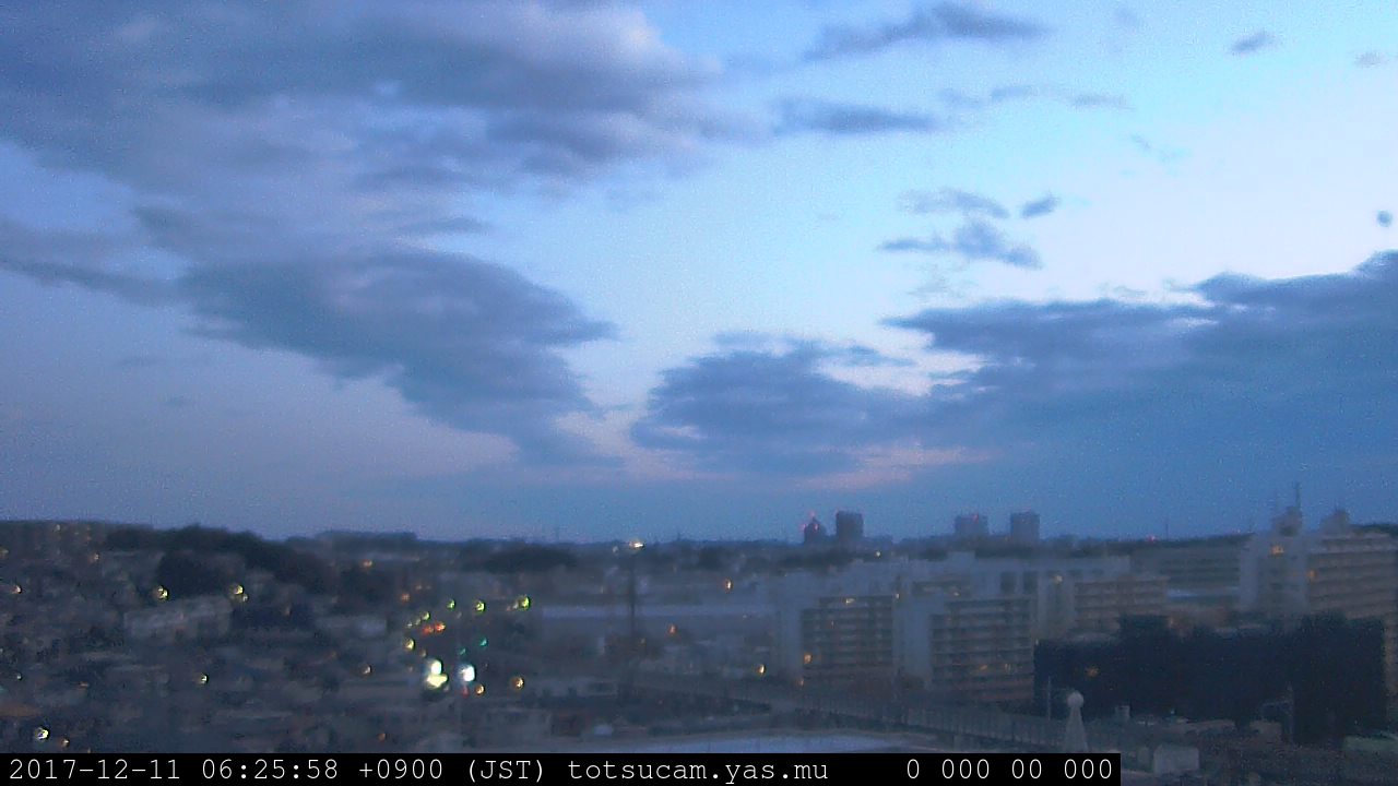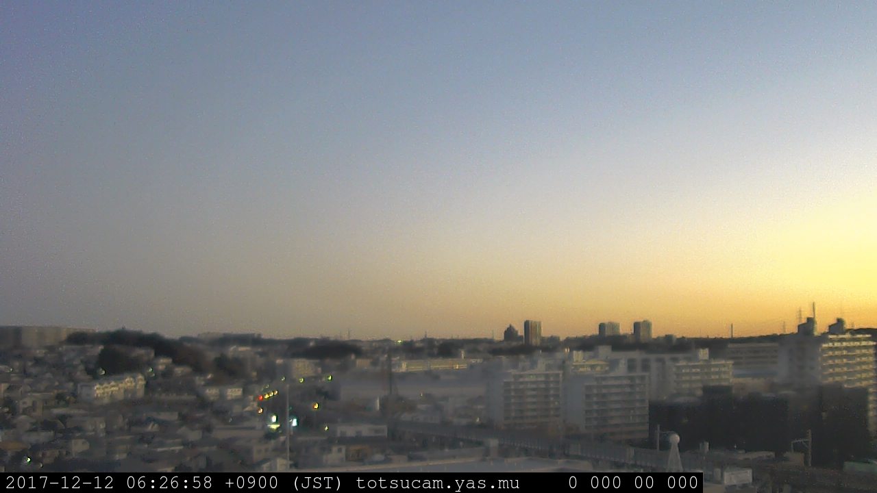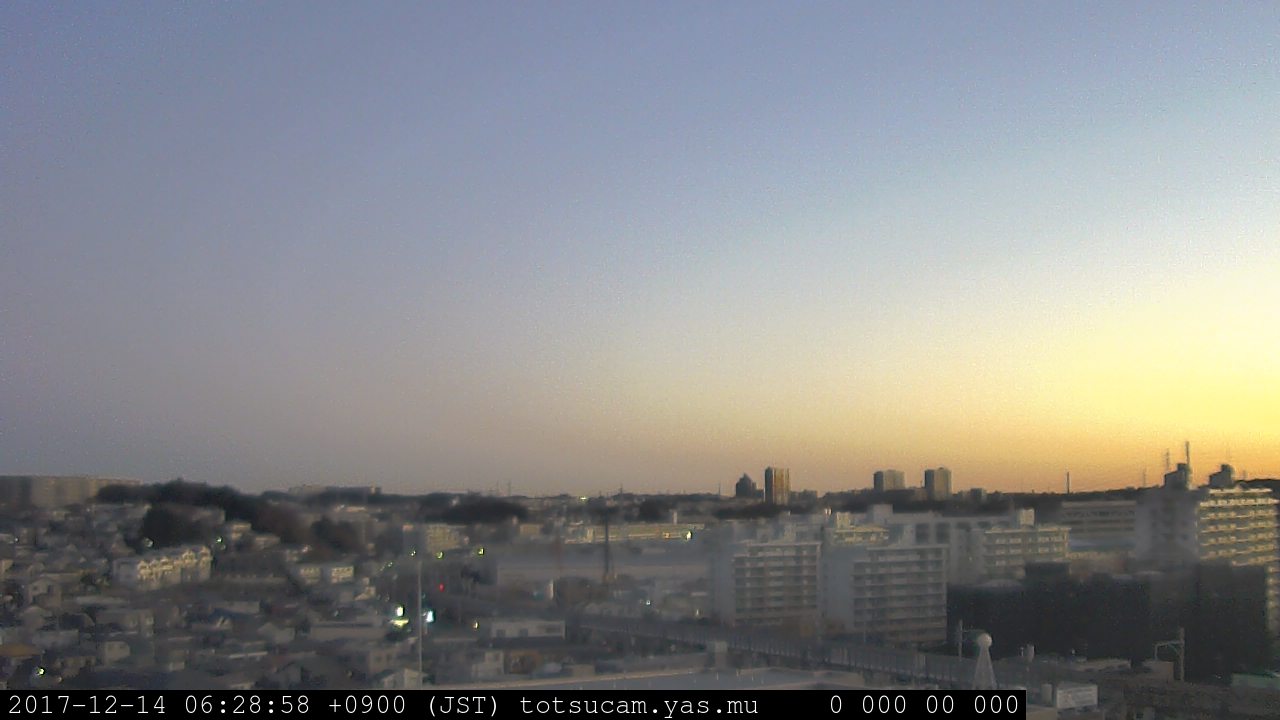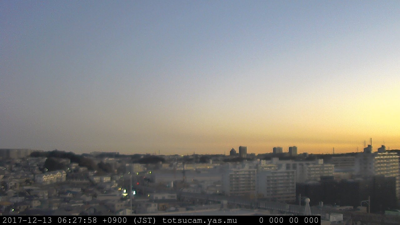 横浜市戸塚駅周辺から 東戸塚方面(北北東)を望む展望カメラの映像です。 左は現在の映像です。 下に並んでいるのは、 7日間に亘る日の出どき、昼間、夕暮れどきの写真(サムネイル)です。 それぞれ、日の出15分前、南中時、日没20分後の写真となっています。 各写真の下にはmpeg形式の動画へのリンクがあります。 それぞれ、日の出、南中、日没の前後1時間の画像です。 右欄にはその日24時間の動画へのリンクがあります。 この7日間以外は日付が一覧表示されています。 日付部分をクリックすると、 その日付から7日分が展開されて表示されます。
