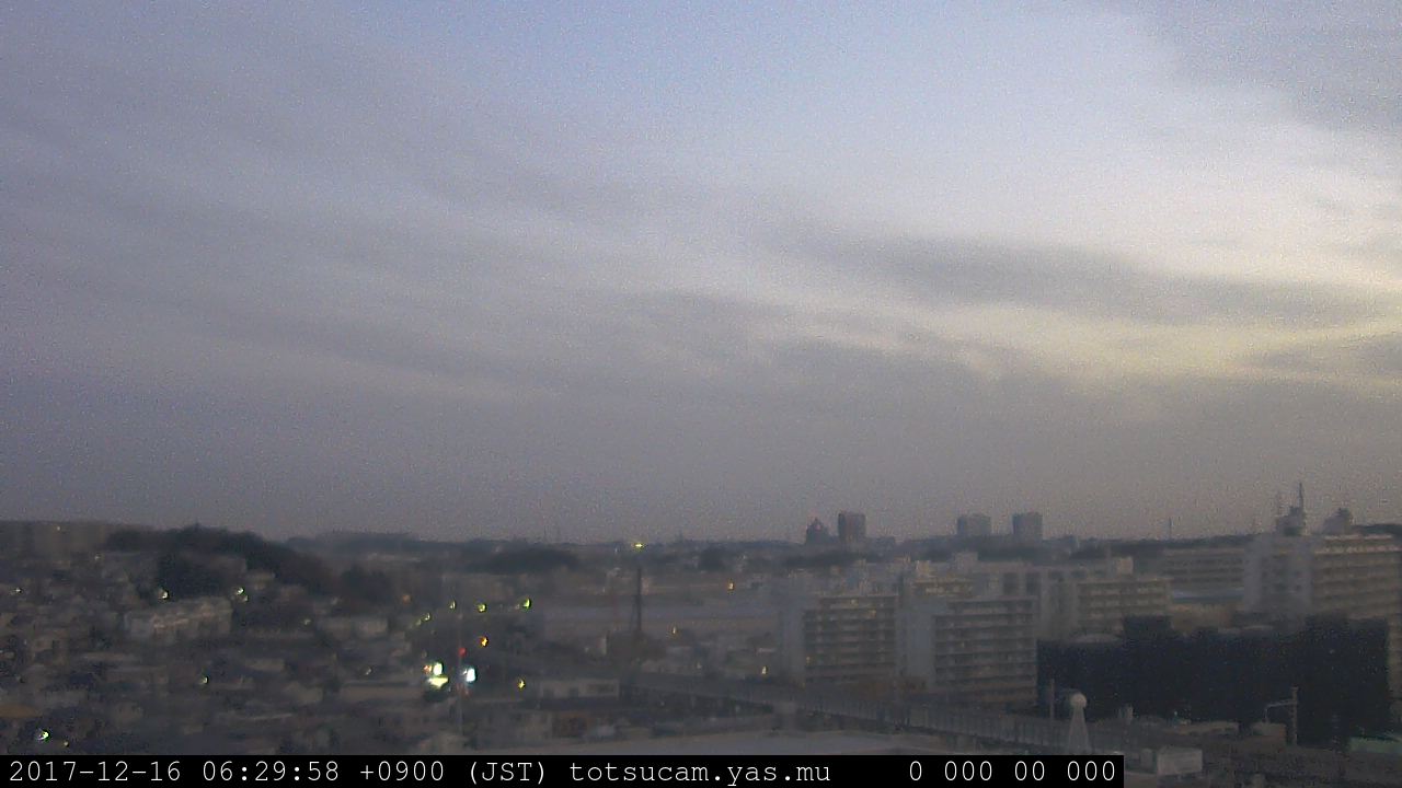 横浜市戸塚駅周辺から 東戸塚方面(北北東)を望む展望カメラの映像です。 左は現在の映像です。 下に並んでいるのは、 7日間に亘る日の出どき、昼間、夕暮れどきの写真(サムネイル)です。 それぞれ、日の出15分前、南中時、日没20分後の写真となっています。 各写真の下にはmpeg形式の動画へのリンクがあります。 それぞれ、日の出、南中、日没の前後1時間の画像です。 右欄にはその日24時間の動画へのリンクがあります。 この7日間以外は日付が一覧表示されています。 日付部分をクリックすると、 その日付から7日分が展開されて表示されます。