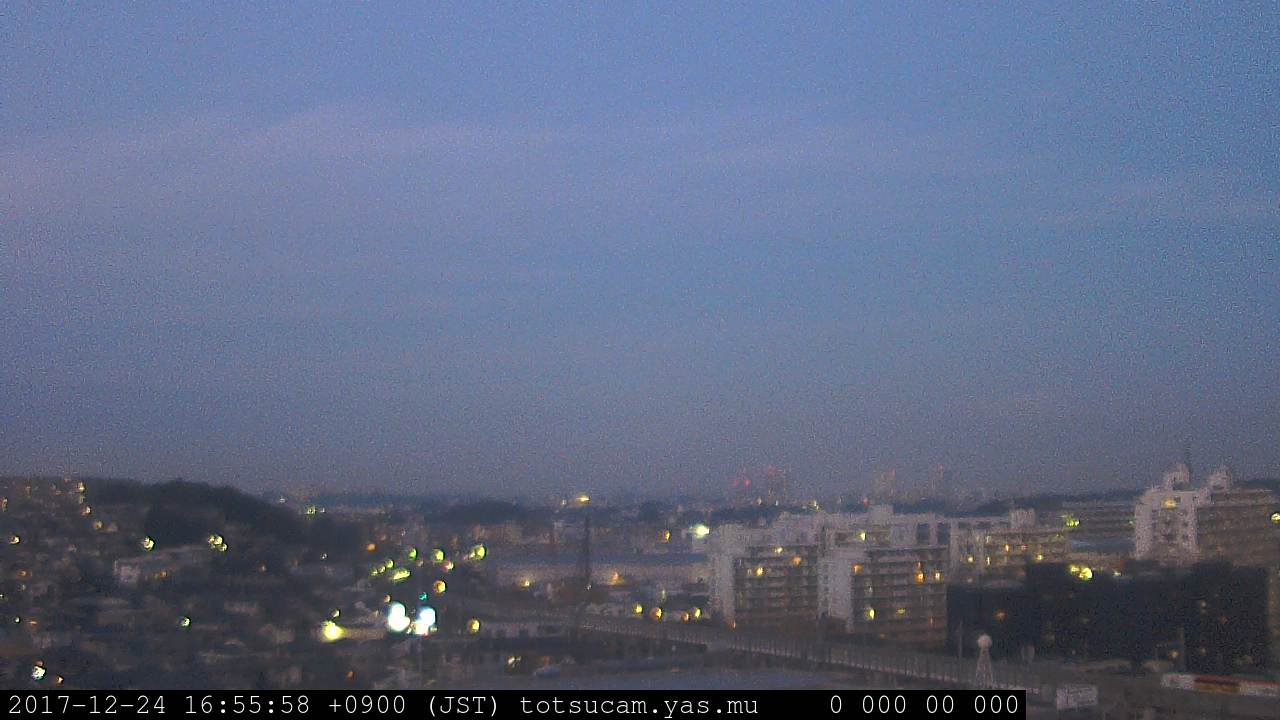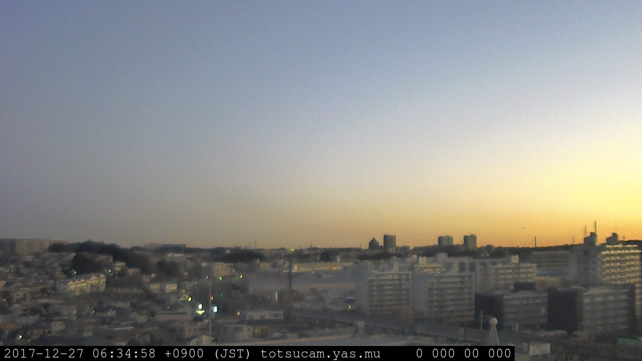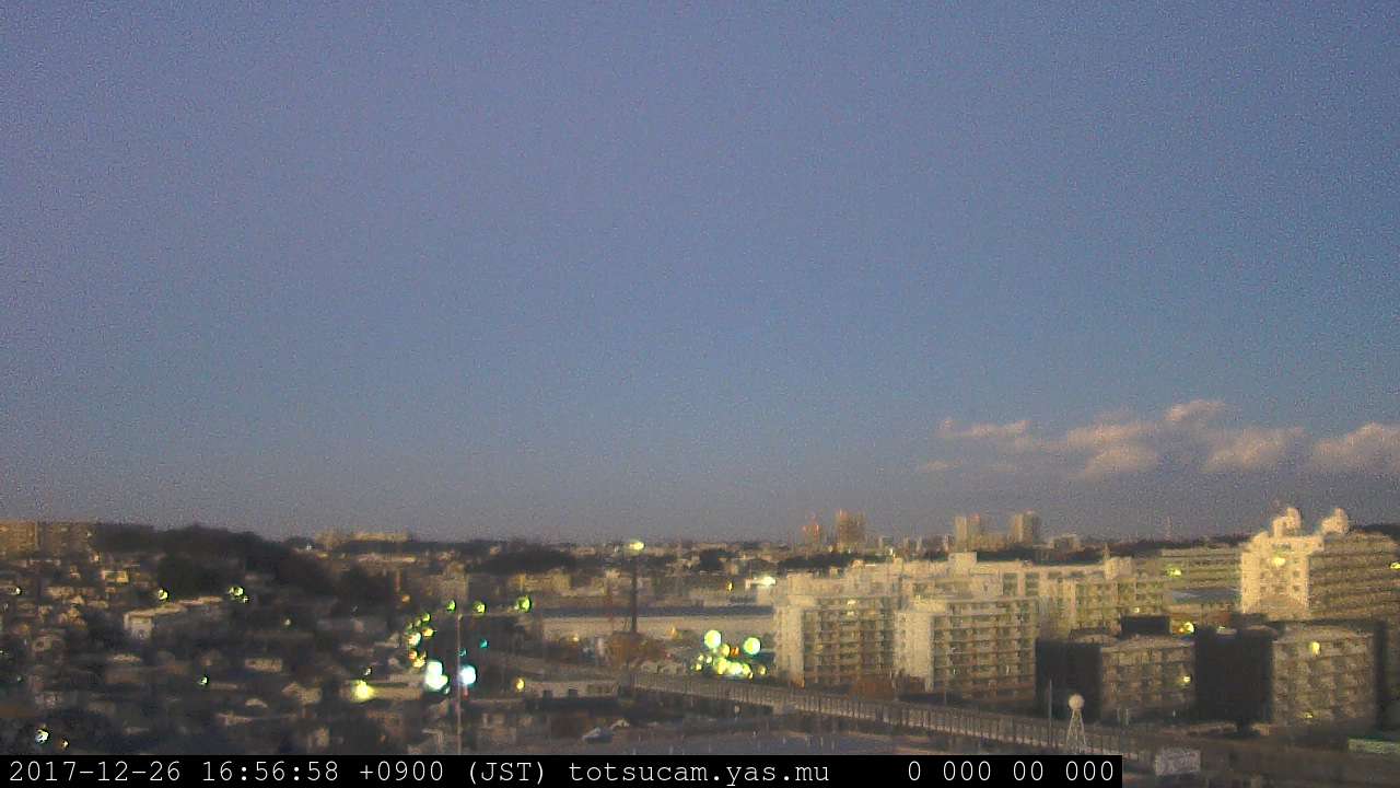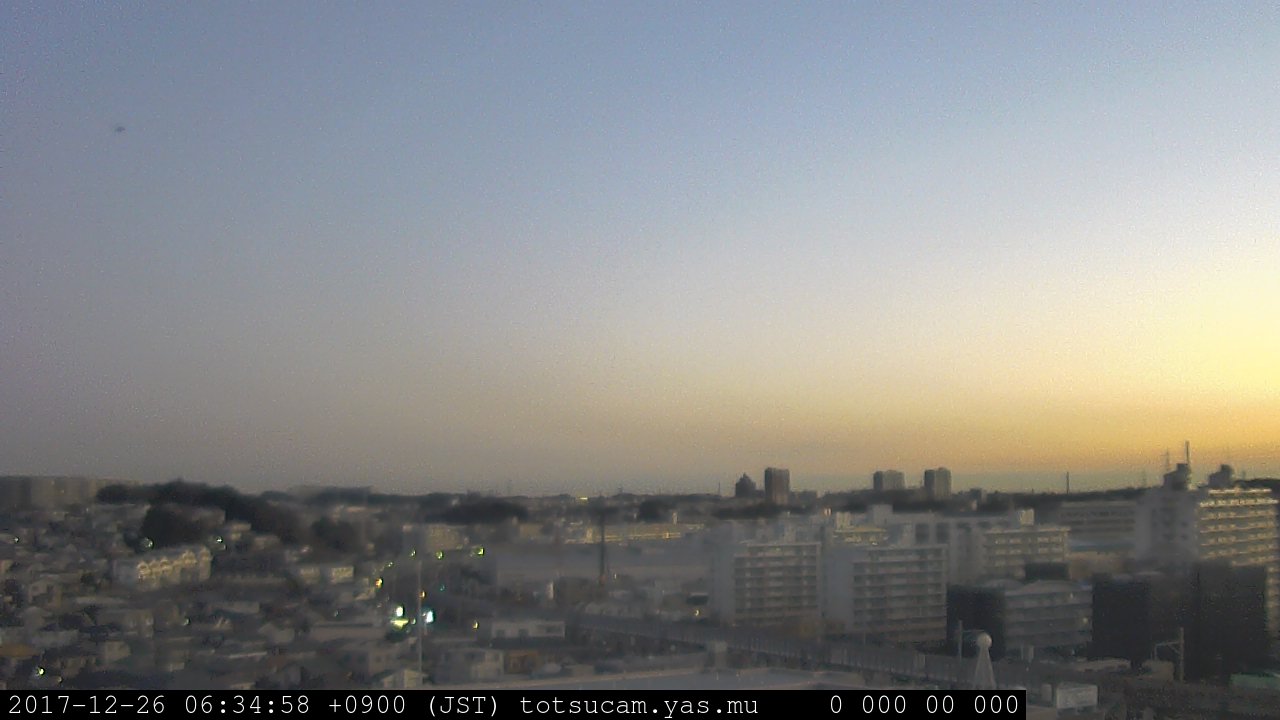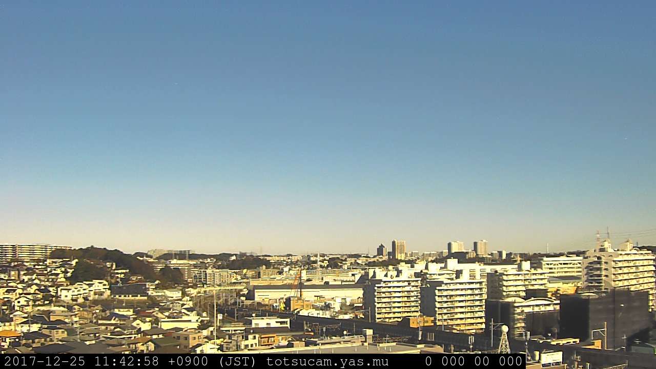 横浜市戸塚駅周辺から 東戸塚方面(北北東)を望む展望カメラの映像です。 左は現在の映像です。 下に並んでいるのは、 7日間に亘る日の出どき、昼間、夕暮れどきの写真(サムネイル)です。 それぞれ、日の出15分前、南中時、日没20分後の写真となっています。 各写真の下にはmpeg形式の動画へのリンクがあります。 それぞれ、日の出、南中、日没の前後1時間の画像です。 右欄にはその日24時間の動画へのリンクがあります。 この7日間以外は日付が一覧表示されています。 日付部分をクリックすると、 その日付から7日分が展開されて表示されます。