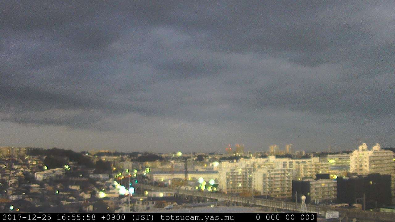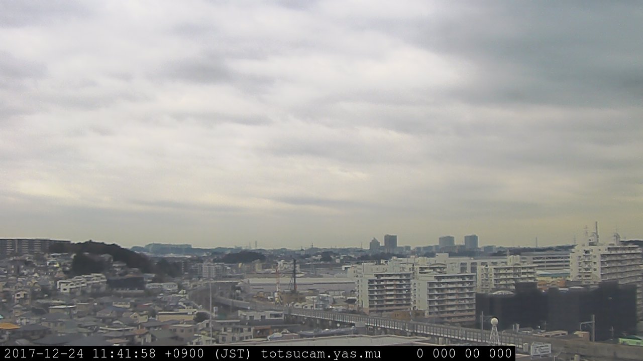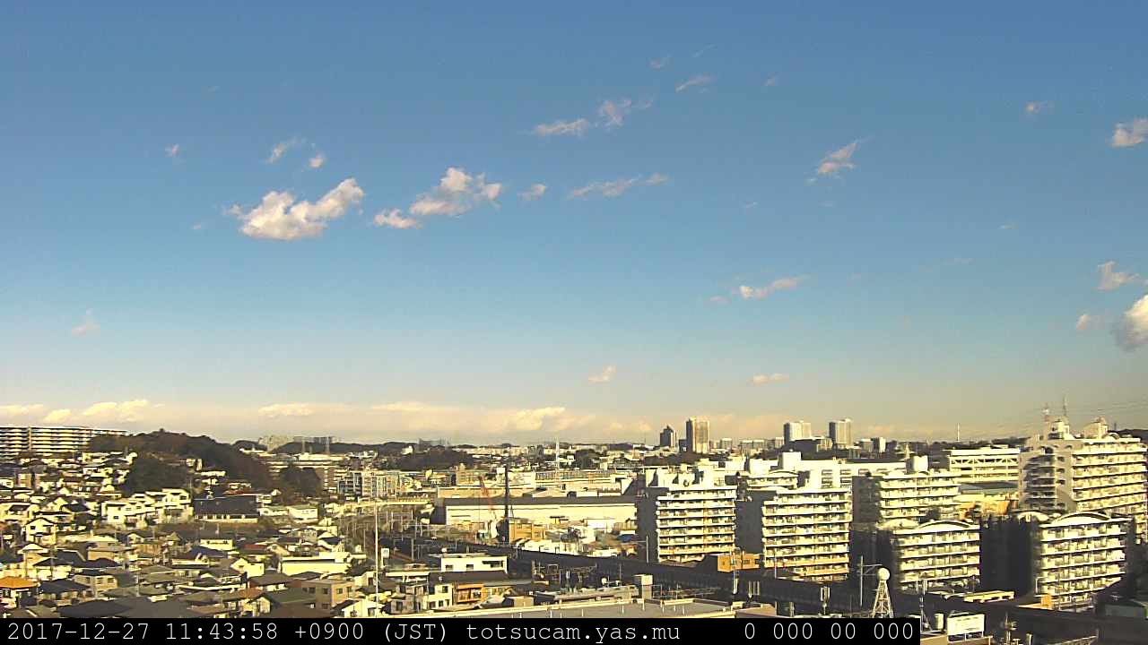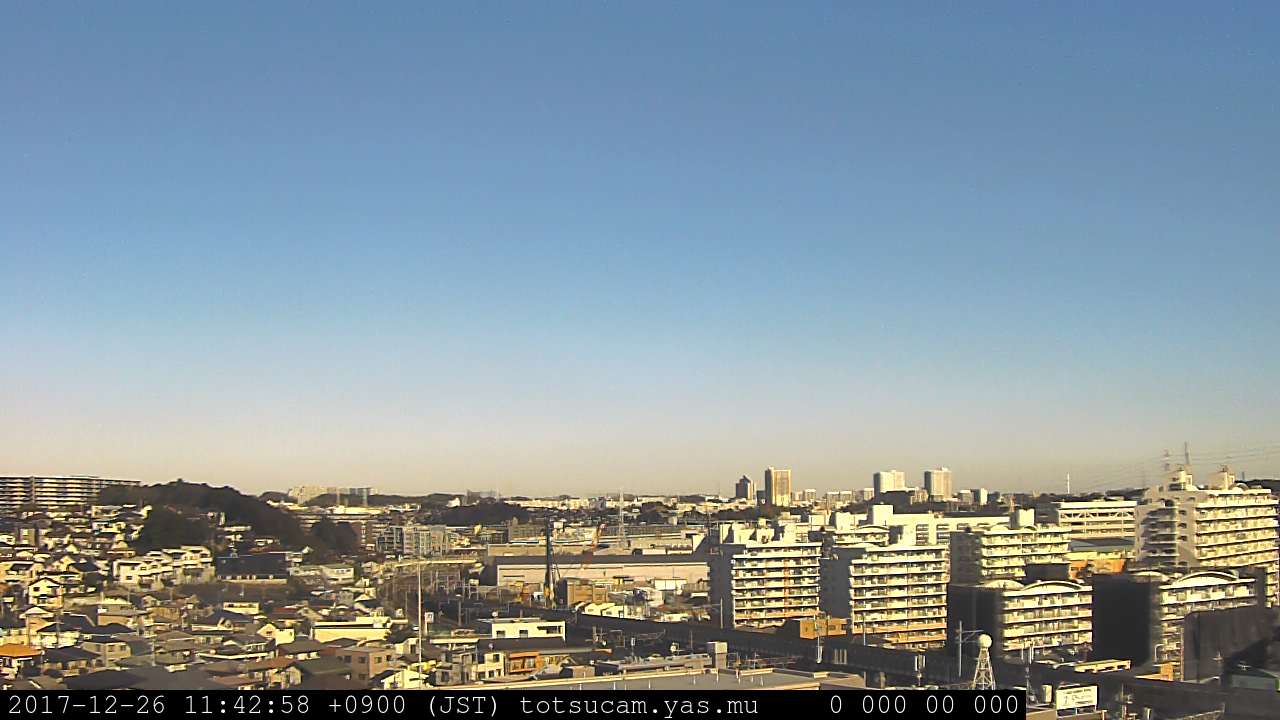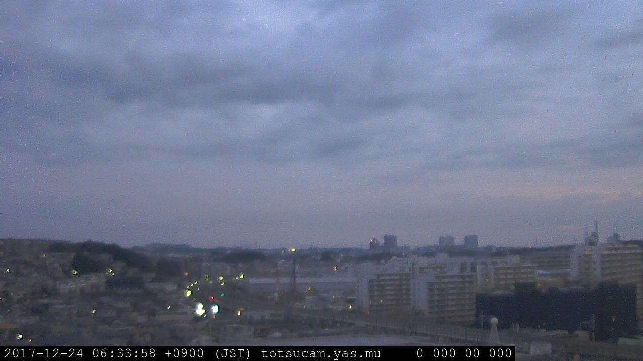 横浜市戸塚駅周辺から 東戸塚方面(北北東)を望む展望カメラの映像です。 左は現在の映像です。 下に並んでいるのは、 7日間に亘る日の出どき、昼間、夕暮れどきの写真(サムネイル)です。 それぞれ、日の出15分前、南中時、日没20分後の写真となっています。 各写真の下にはmpeg形式の動画へのリンクがあります。 それぞれ、日の出、南中、日没の前後1時間の画像です。 右欄にはその日24時間の動画へのリンクがあります。 この7日間以外は日付が一覧表示されています。 日付部分をクリックすると、 その日付から7日分が展開されて表示されます。
