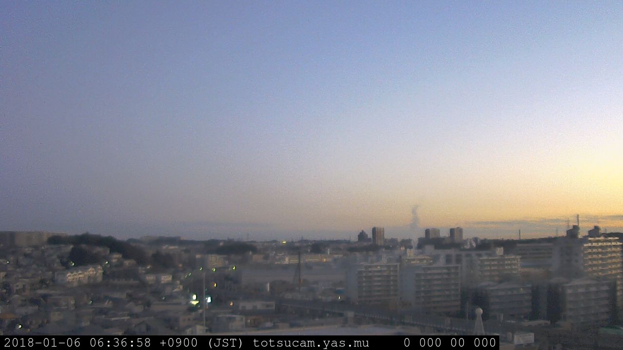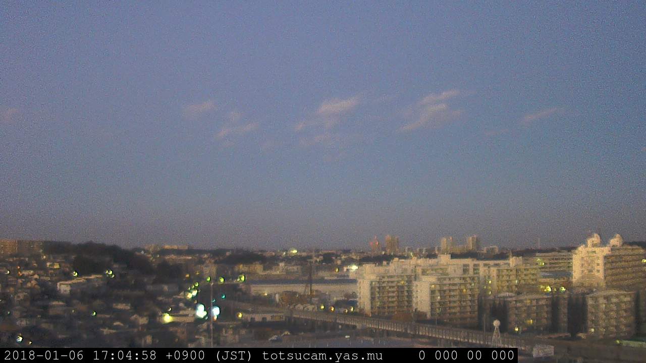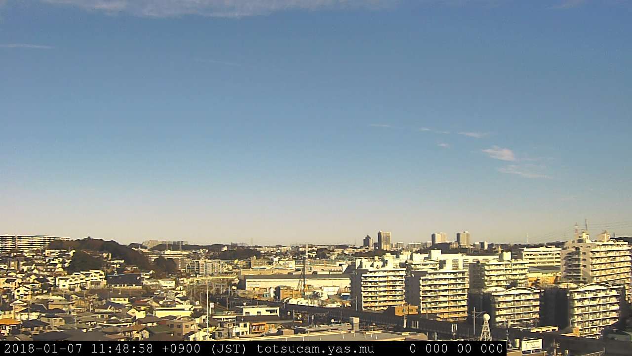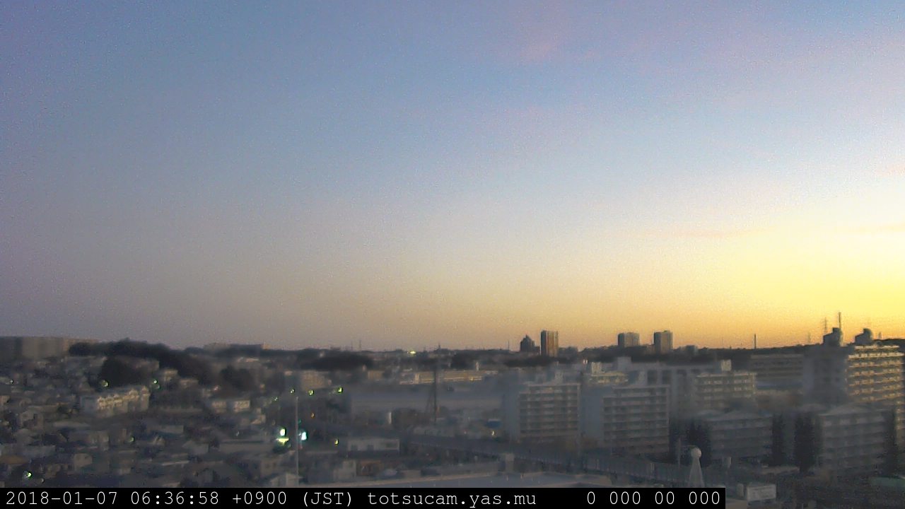 横浜市戸塚駅周辺から 東戸塚方面(北北東)を望む展望カメラの映像です。 左は現在の映像です。 下に並んでいるのは、 7日間に亘る日の出どき、昼間、夕暮れどきの写真(サムネイル)です。 それぞれ、日の出15分前、南中時、日没20分後の写真となっています。 各写真の下にはmpeg形式の動画へのリンクがあります。 それぞれ、日の出、南中、日没の前後1時間の画像です。 右欄にはその日24時間の動画へのリンクがあります。 この7日間以外は日付が一覧表示されています。 日付部分をクリックすると、 その日付から7日分が展開されて表示されます。