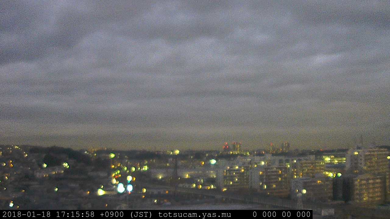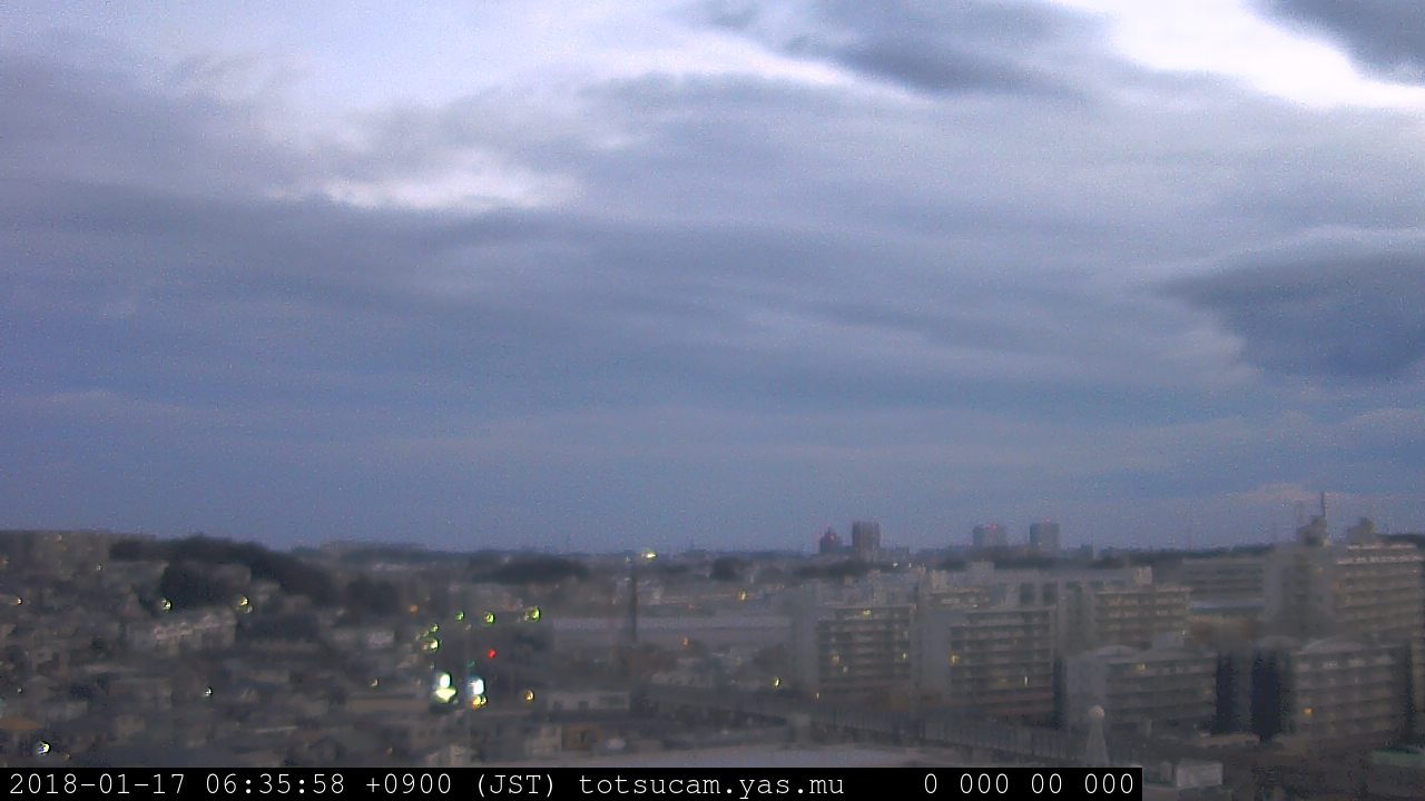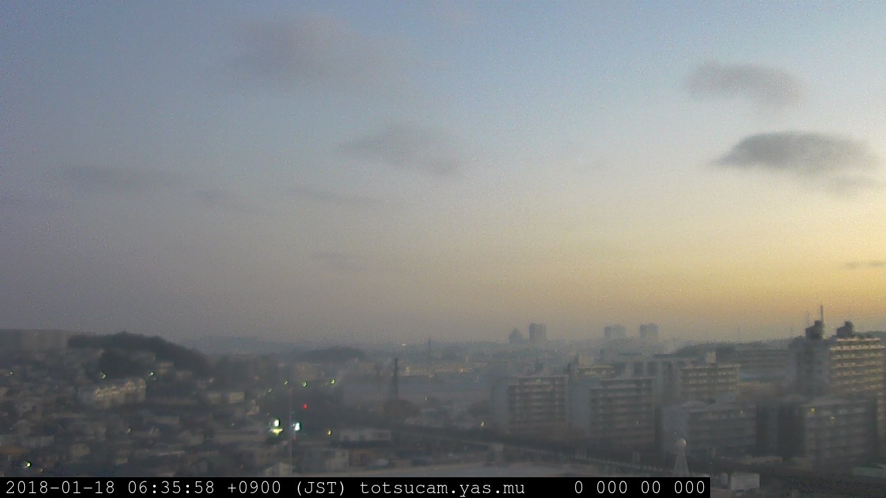 横浜市戸塚駅周辺から 東戸塚方面(北北東)を望む展望カメラの映像です。 左は現在の映像です。 下に並んでいるのは、 7日間に亘る日の出どき、昼間、夕暮れどきの写真(サムネイル)です。 それぞれ、日の出15分前、南中時、日没20分後の写真となっています。 各写真の下にはmpeg形式の動画へのリンクがあります。 それぞれ、日の出、南中、日没の前後1時間の画像です。 右欄にはその日24時間の動画へのリンクがあります。 この7日間以外は日付が一覧表示されています。 日付部分をクリックすると、 その日付から7日分が展開されて表示されます。