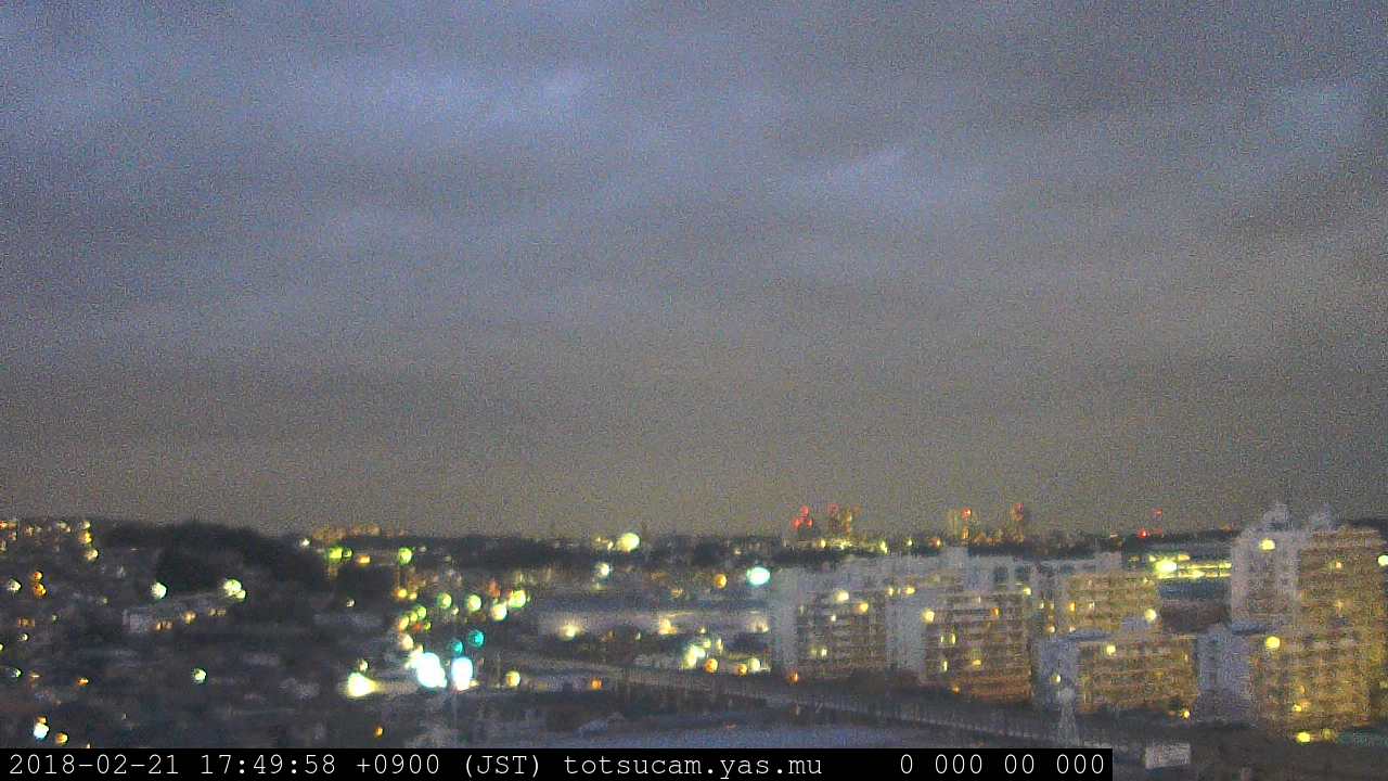 適度に曇った日の雲の動き (例: 2005-10-24) がとても楽しめます。 正面を横切っている高架は横須賀線下りです。 その下に横須賀線上り、東海道線、同貨物線が走っていますが、 高架に隠れていてよく見えません。 夜間は特に中央左寄りの車の動きがよく見えます。