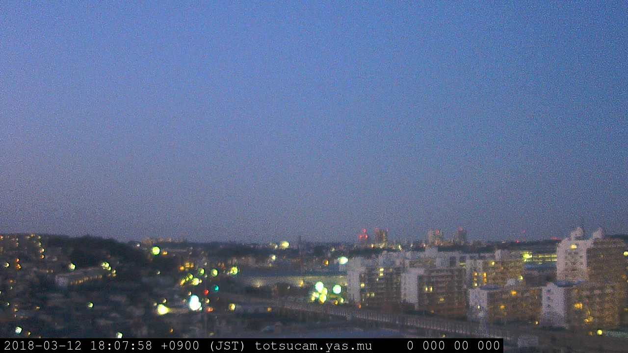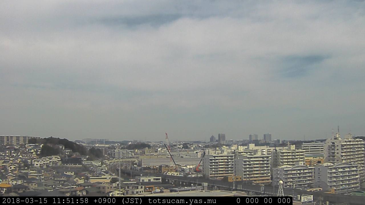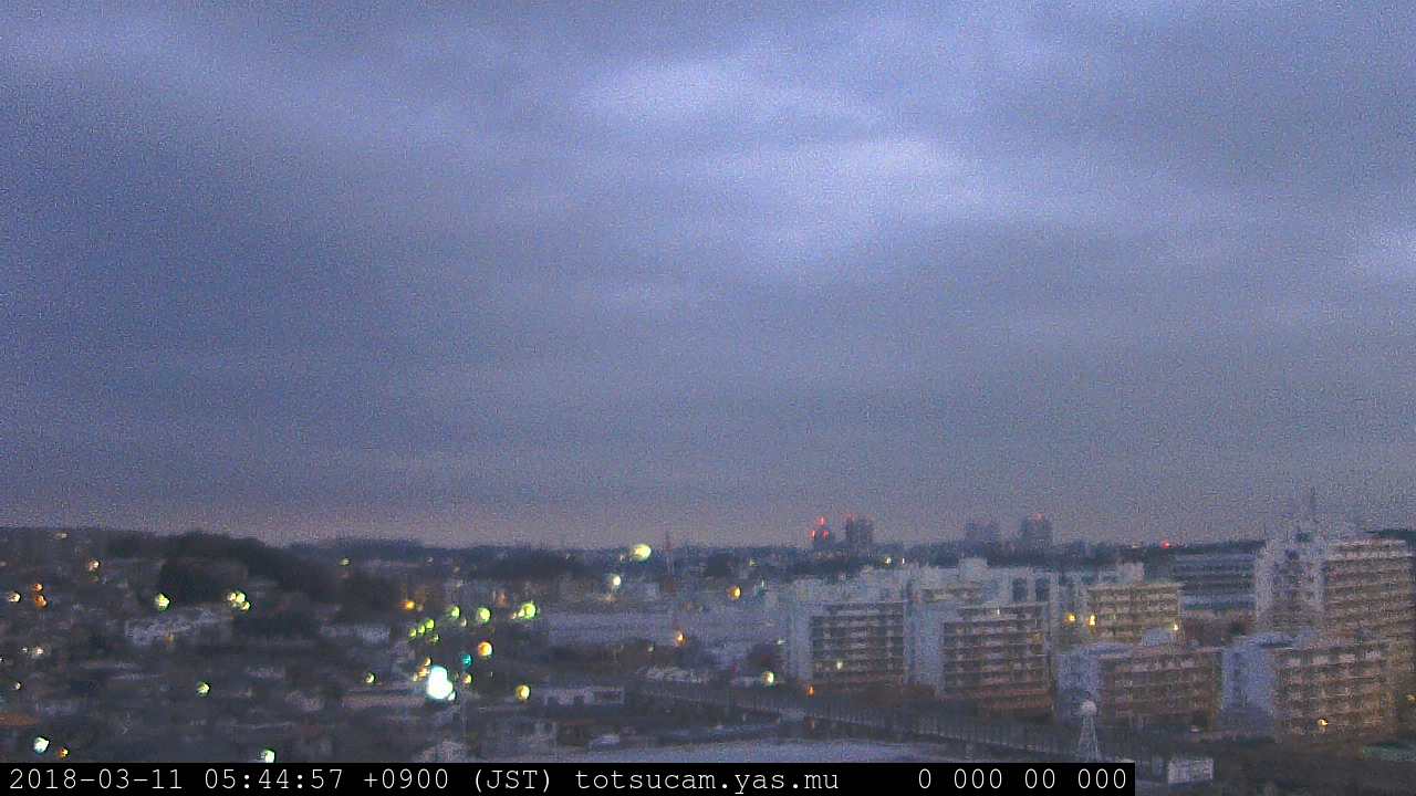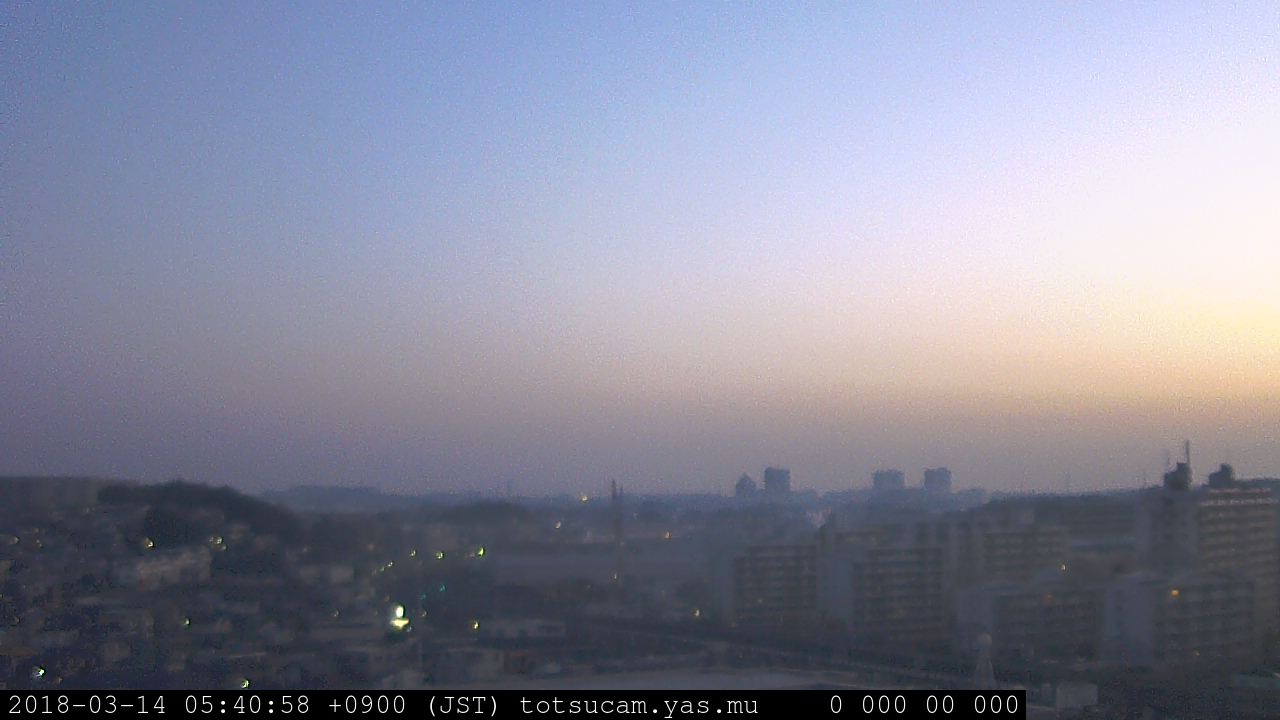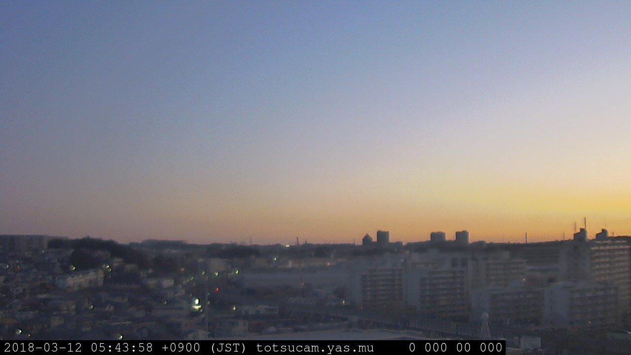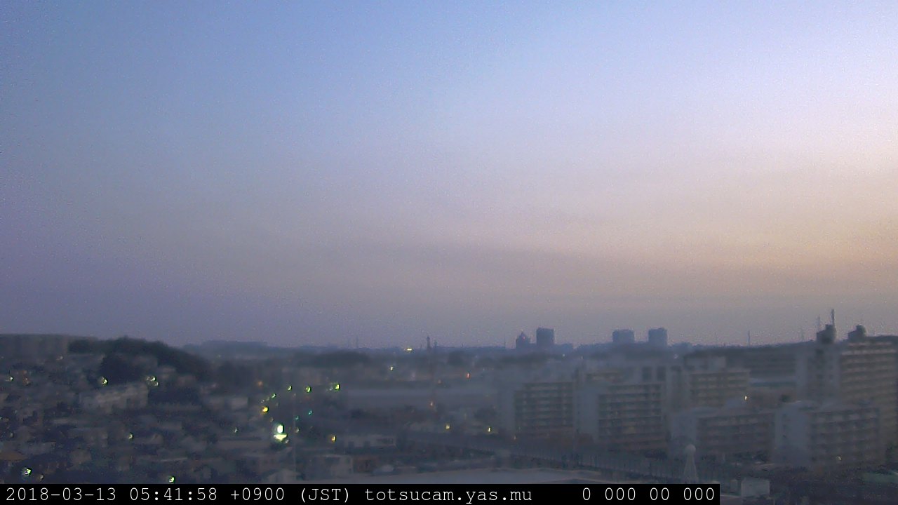 横浜市戸塚駅周辺から 東戸塚方面(北北東)を望む展望カメラの映像です。 左は現在の映像です。 下に並んでいるのは、 7日間に亘る日の出どき、昼間、夕暮れどきの写真(サムネイル)です。 それぞれ、日の出15分前、南中時、日没20分後の写真となっています。 各写真の下にはmpeg形式の動画へのリンクがあります。 それぞれ、日の出、南中、日没の前後1時間の画像です。 右欄にはその日24時間の動画へのリンクがあります。 この7日間以外は日付が一覧表示されています。 日付部分をクリックすると、 その日付から7日分が展開されて表示されます。