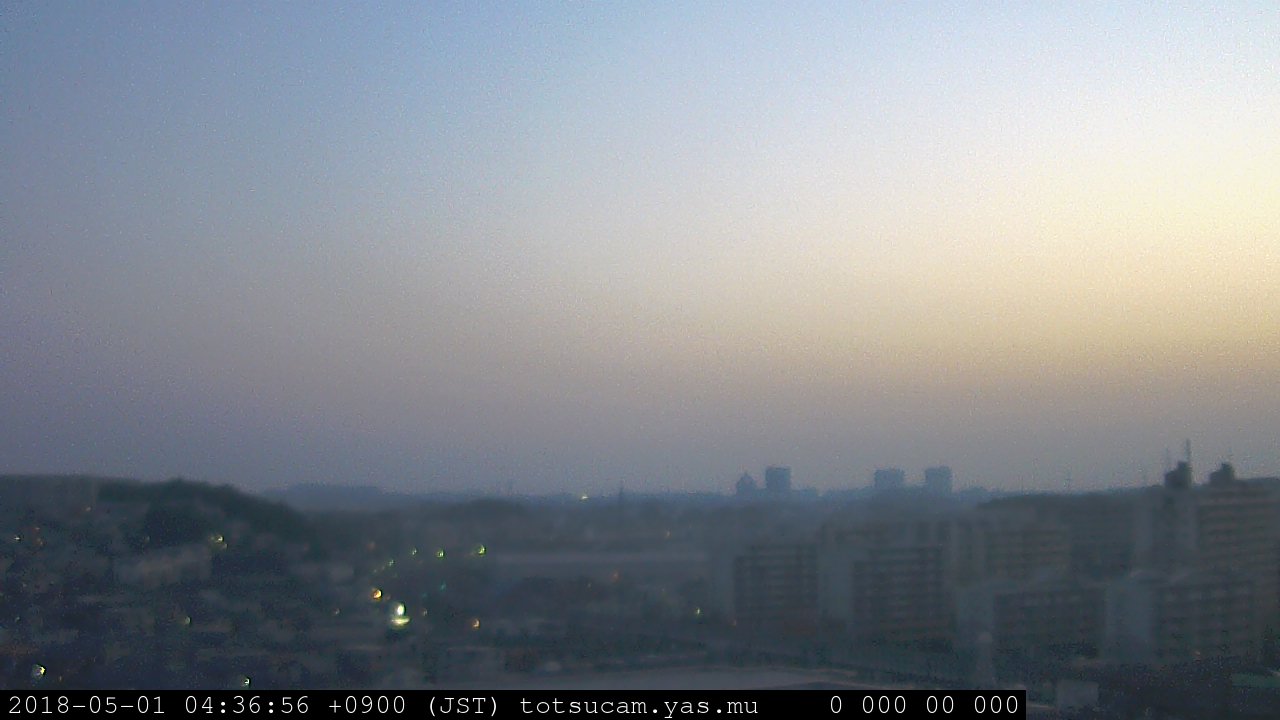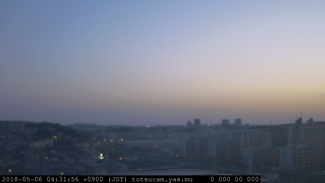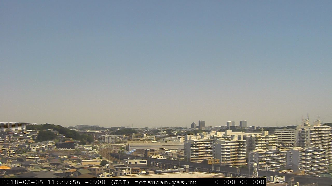 横浜市戸塚駅周辺から 東戸塚方面(北北東)を望む展望カメラの映像です。 左は現在の映像です。 下に並んでいるのは、 7日間に亘る日の出どき、昼間、夕暮れどきの写真(サムネイル)です。 それぞれ、日の出15分前、南中時、日没20分後の写真となっています。 各写真の下にはmpeg形式の動画へのリンクがあります。 それぞれ、日の出、南中、日没の前後1時間の画像です。 右欄にはその日24時間の動画へのリンクがあります。 この7日間以外は日付が一覧表示されています。 日付部分をクリックすると、 その日付から7日分が展開されて表示されます。