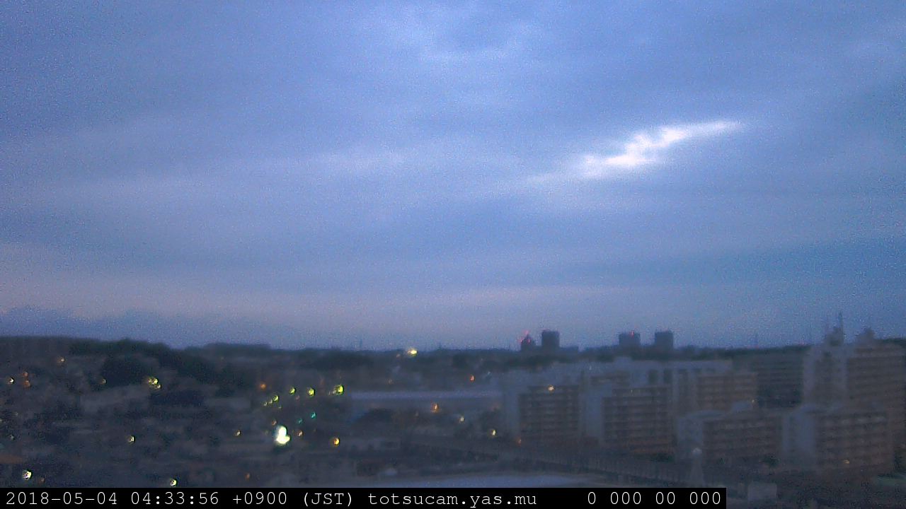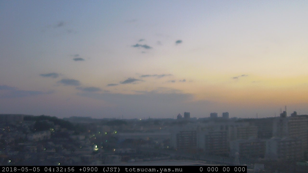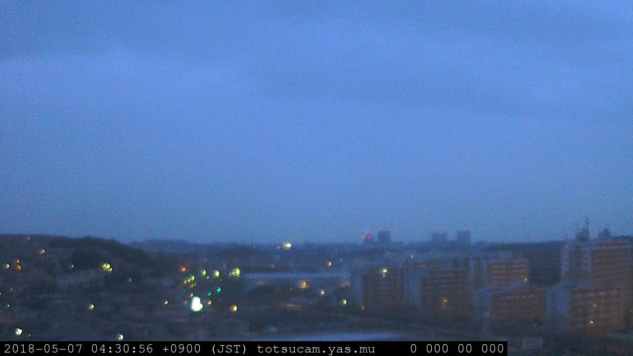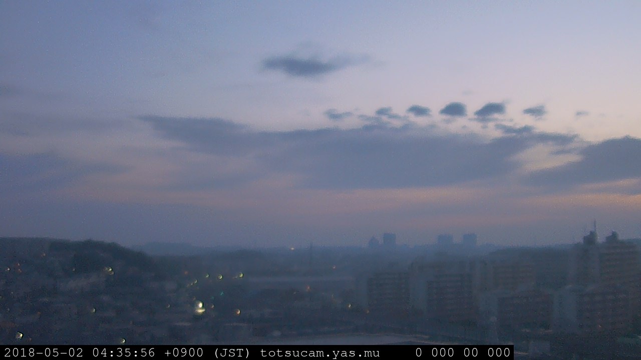 横浜市戸塚駅周辺から 東戸塚方面(北北東)を望む展望カメラの映像です。 左は現在の映像です。 下に並んでいるのは、 7日間に亘る日の出どき、昼間、夕暮れどきの写真(サムネイル)です。 それぞれ、日の出15分前、南中時、日没20分後の写真となっています。 各写真の下にはmpeg形式の動画へのリンクがあります。 それぞれ、日の出、南中、日没の前後1時間の画像です。 右欄にはその日24時間の動画へのリンクがあります。 この7日間以外は日付が一覧表示されています。 日付部分をクリックすると、 その日付から7日分が展開されて表示されます。