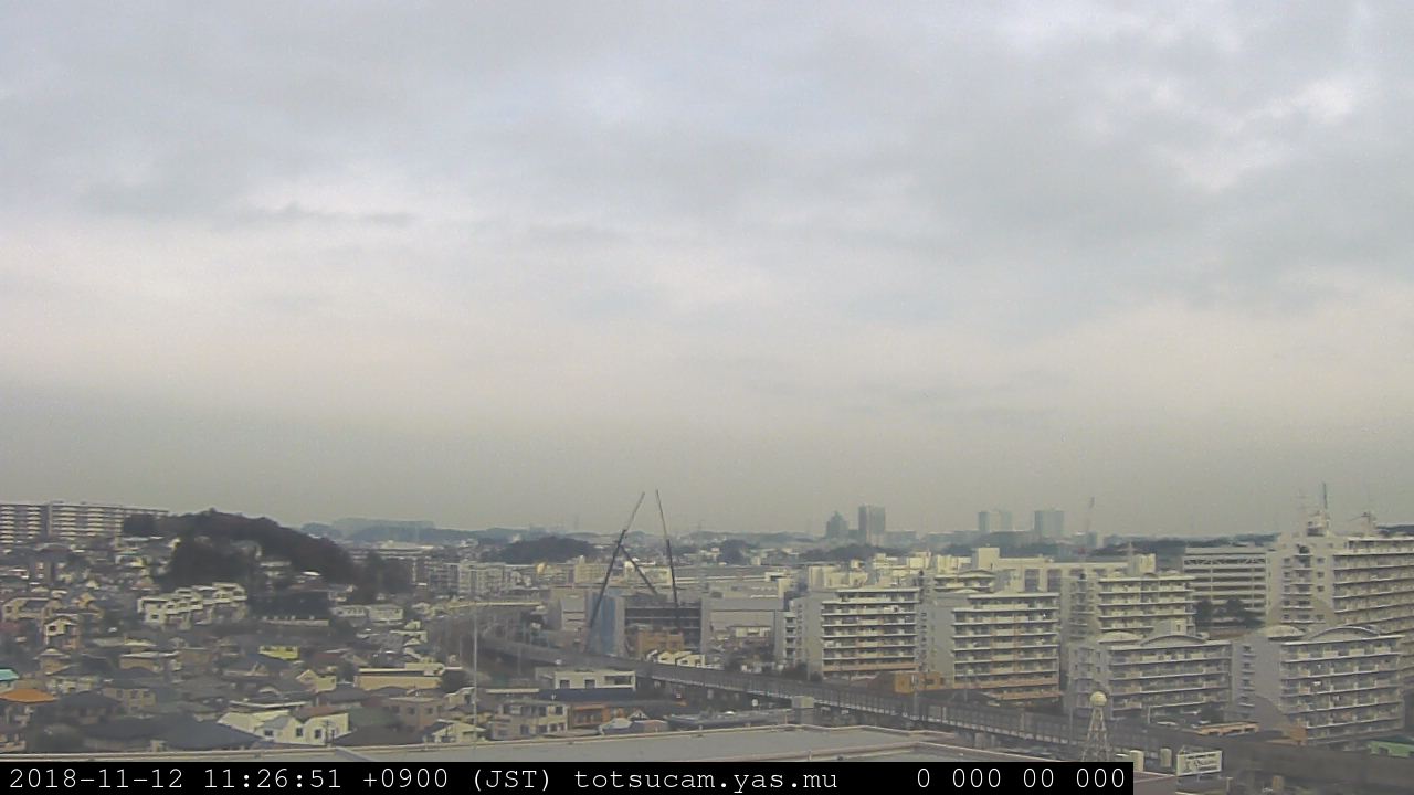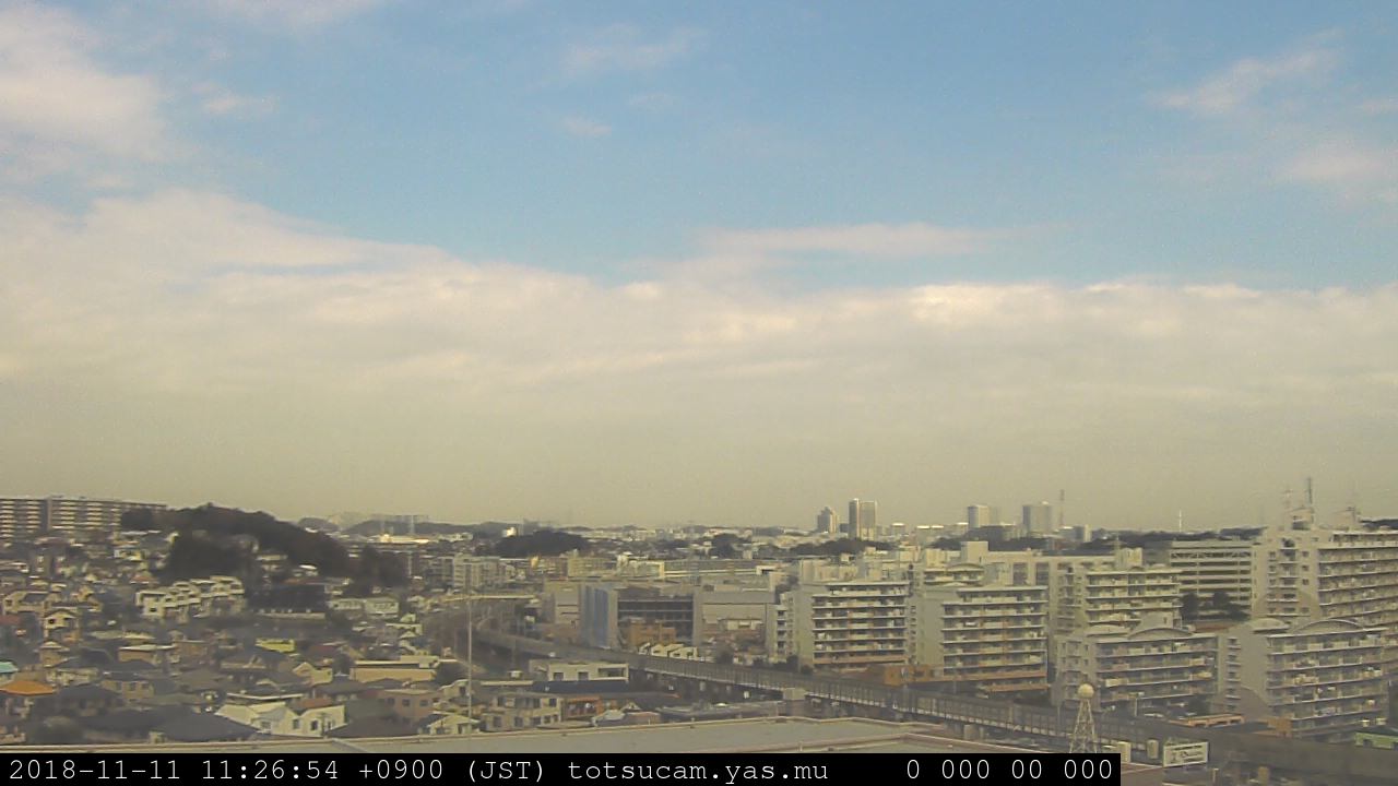 適度に曇った日の雲の動き (例: 2005-10-24) がとても楽しめます。 正面を横切っている高架は横須賀線下りです。 その下に横須賀線上り、東海道線、同貨物線が走っていますが、 高架に隠れていてよく見えません。 夜間は特に中央左寄りの車の動きがよく見えます。