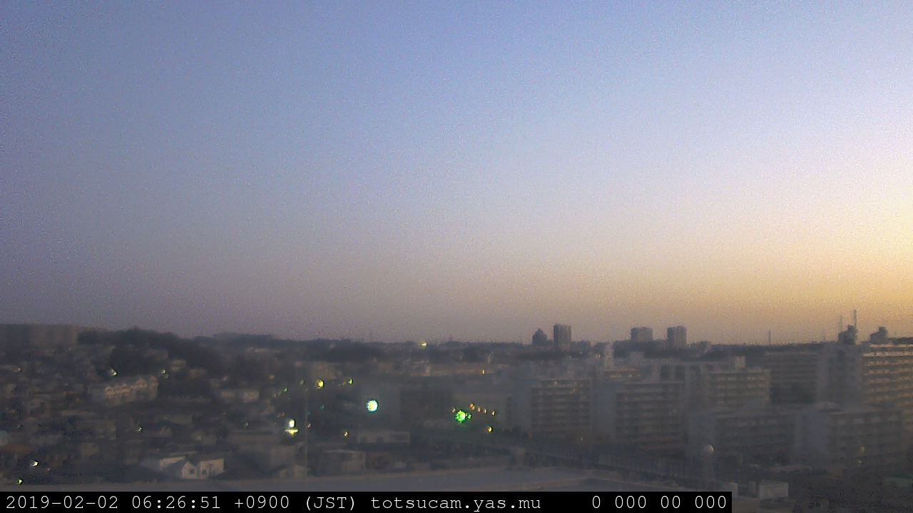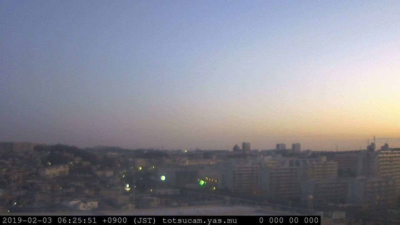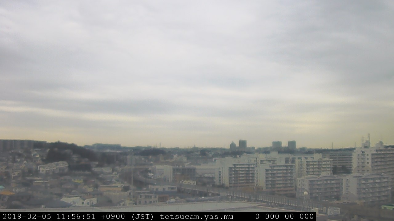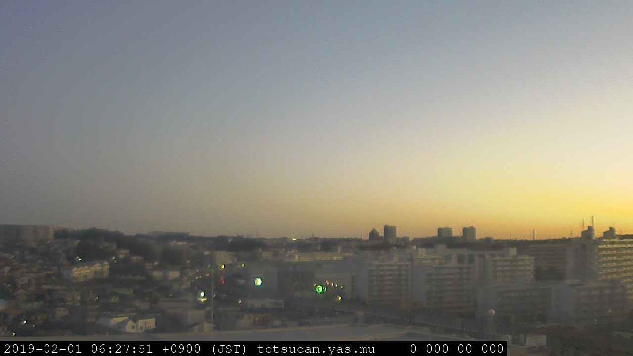 横浜市戸塚駅周辺から 東戸塚方面(北北東)を望む展望カメラの映像です。 左は現在の映像です。 下に並んでいるのは、 7日間に亘る日の出どき、昼間、夕暮れどきの写真(サムネイル)です。 それぞれ、日の出15分前、南中時、日没20分後の写真となっています。 各写真の下にはmpeg形式の動画へのリンクがあります。 それぞれ、日の出、南中、日没の前後1時間の画像です。 右欄にはその日24時間の動画へのリンクがあります。 この7日間以外は日付が一覧表示されています。 日付部分をクリックすると、 その日付から7日分が展開されて表示されます。