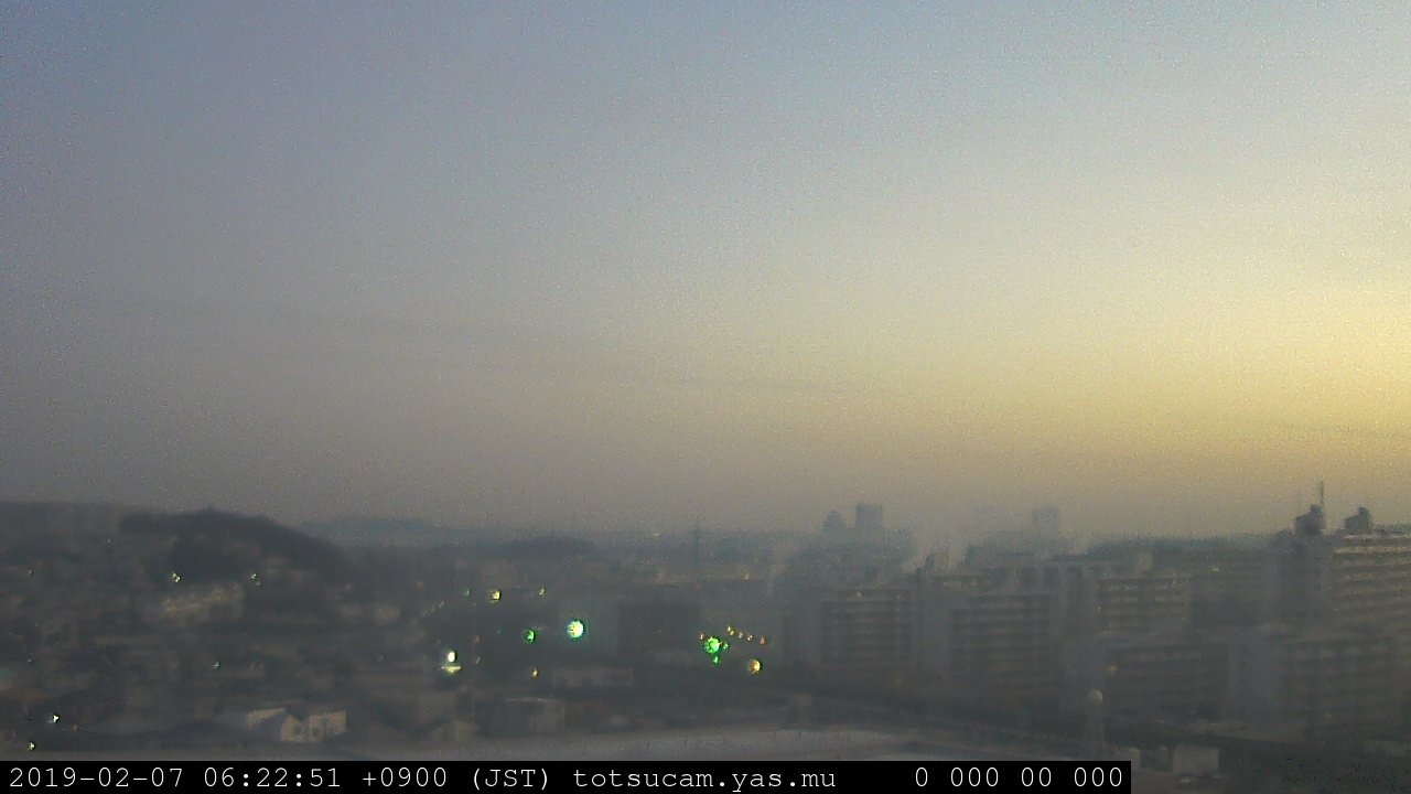 横浜市戸塚駅周辺から 東戸塚方面(北北東)を望む展望カメラの映像です。 左は現在の映像です。 下に並んでいるのは、 7日間に亘る日の出どき、昼間、夕暮れどきの写真(サムネイル)です。 それぞれ、日の出15分前、南中時、日没20分後の写真となっています。 各写真の下にはmpeg形式の動画へのリンクがあります。 それぞれ、日の出、南中、日没の前後1時間の画像です。 右欄にはその日24時間の動画へのリンクがあります。 この7日間以外は日付が一覧表示されています。 日付部分をクリックすると、 その日付から7日分が展開されて表示されます。