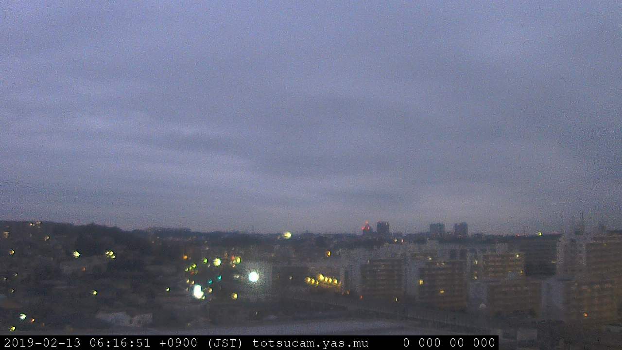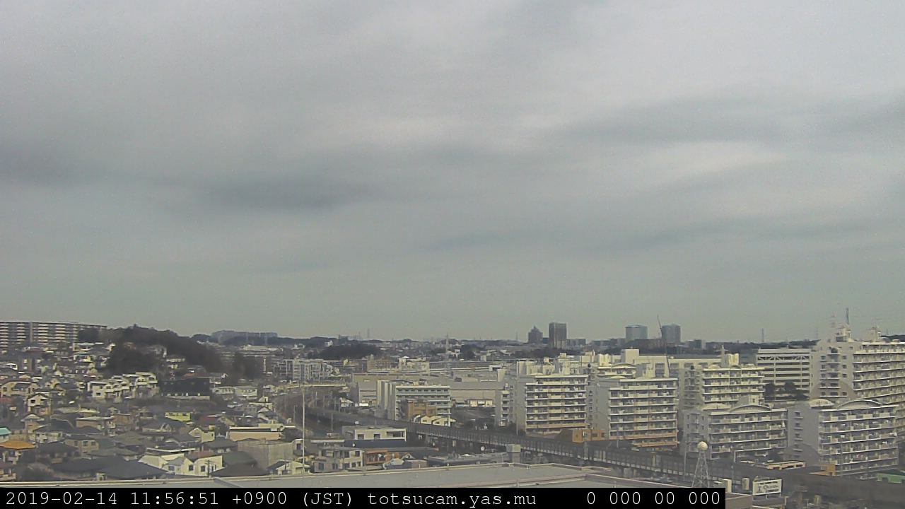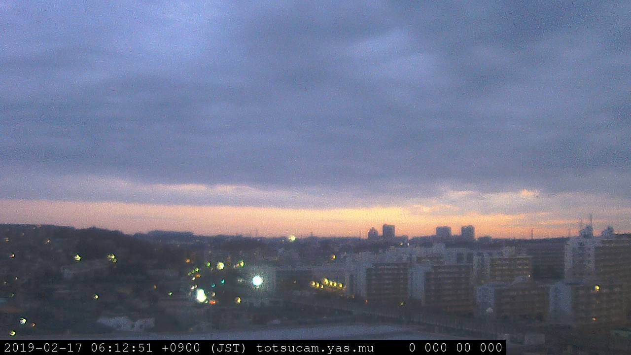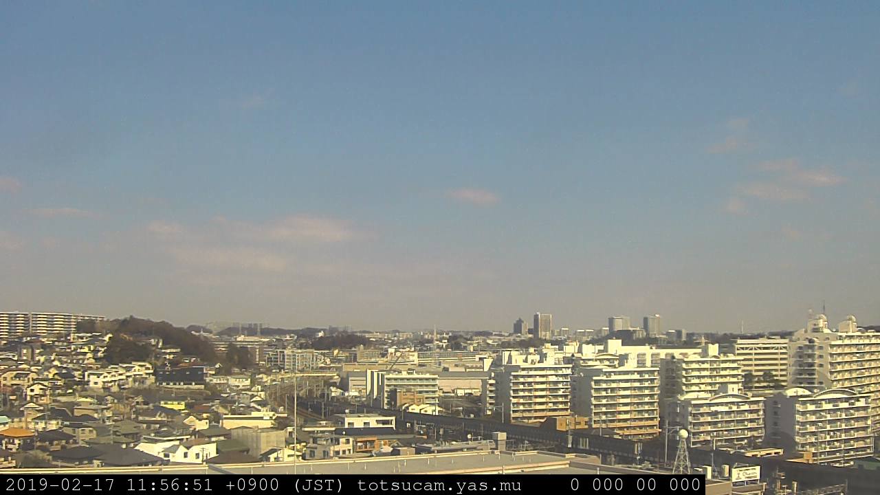 横浜市戸塚駅周辺から 東戸塚方面(北北東)を望む展望カメラの映像です。 左は現在の映像です。 下に並んでいるのは、 7日間に亘る日の出どき、昼間、夕暮れどきの写真(サムネイル)です。 それぞれ、日の出15分前、南中時、日没20分後の写真となっています。 各写真の下にはmpeg形式の動画へのリンクがあります。 それぞれ、日の出、南中、日没の前後1時間の画像です。 右欄にはその日24時間の動画へのリンクがあります。 この7日間以外は日付が一覧表示されています。 日付部分をクリックすると、 その日付から7日分が展開されて表示されます。