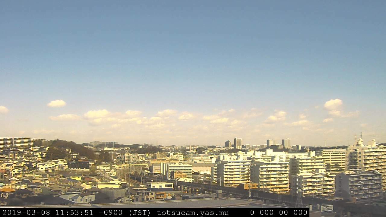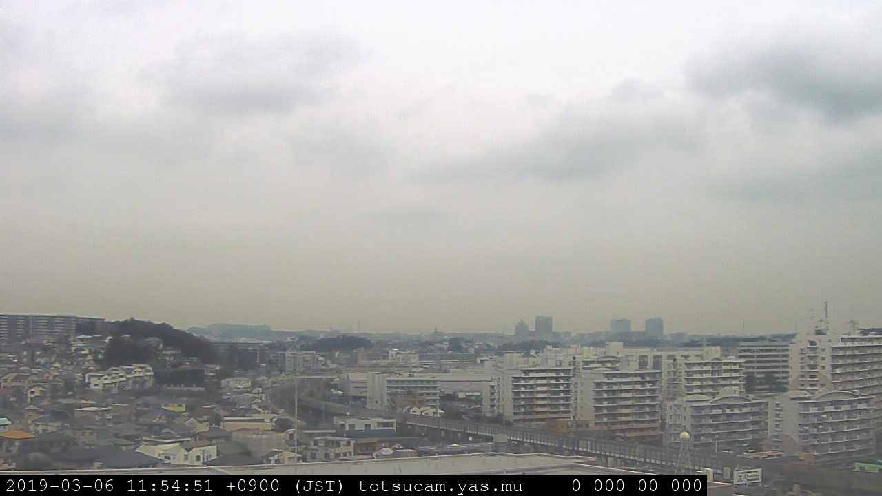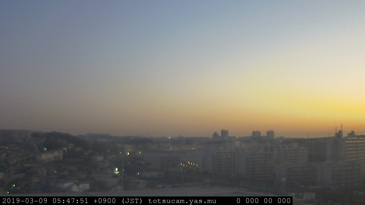 横浜市戸塚駅周辺から 東戸塚方面(北北東)を望む展望カメラの映像です。 左は現在の映像です。 下に並んでいるのは、 7日間に亘る日の出どき、昼間、夕暮れどきの写真(サムネイル)です。 それぞれ、日の出15分前、南中時、日没20分後の写真となっています。 各写真の下にはmpeg形式の動画へのリンクがあります。 それぞれ、日の出、南中、日没の前後1時間の画像です。 右欄にはその日24時間の動画へのリンクがあります。 この7日間以外は日付が一覧表示されています。 日付部分をクリックすると、 その日付から7日分が展開されて表示されます。