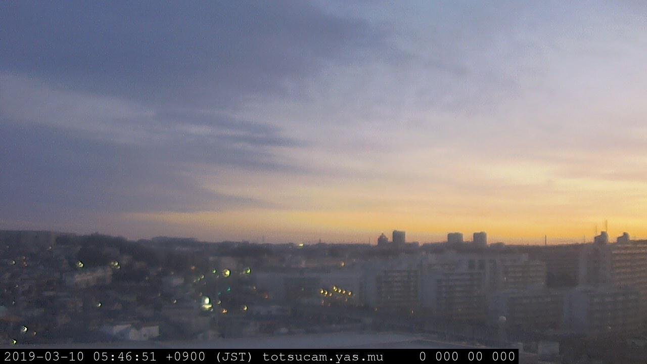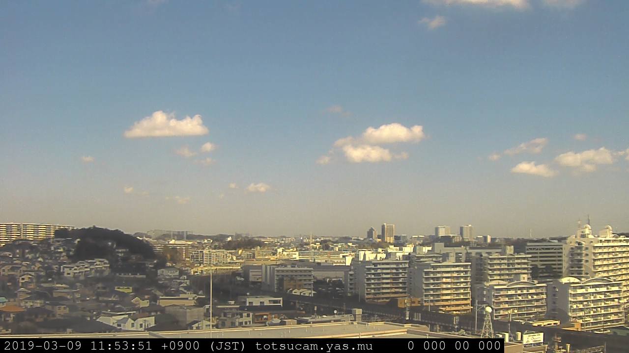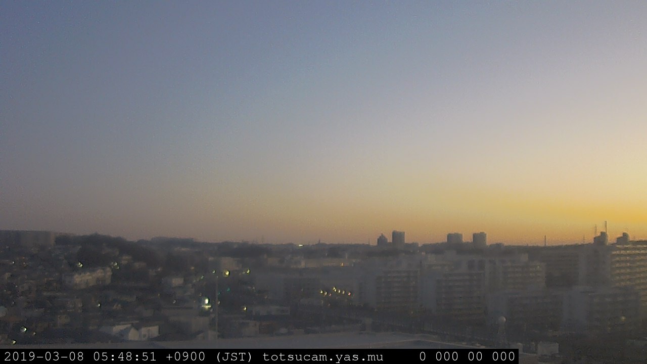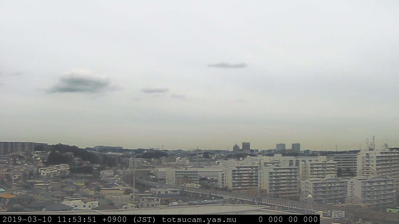 横浜市戸塚駅周辺から 東戸塚方面(北北東)を望む展望カメラの映像です。 左は現在の映像です。 下に並んでいるのは、 7日間に亘る日の出どき、昼間、夕暮れどきの写真(サムネイル)です。 それぞれ、日の出15分前、南中時、日没20分後の写真となっています。 各写真の下にはmpeg形式の動画へのリンクがあります。 それぞれ、日の出、南中、日没の前後1時間の画像です。 右欄にはその日24時間の動画へのリンクがあります。 この7日間以外は日付が一覧表示されています。 日付部分をクリックすると、 その日付から7日分が展開されて表示されます。