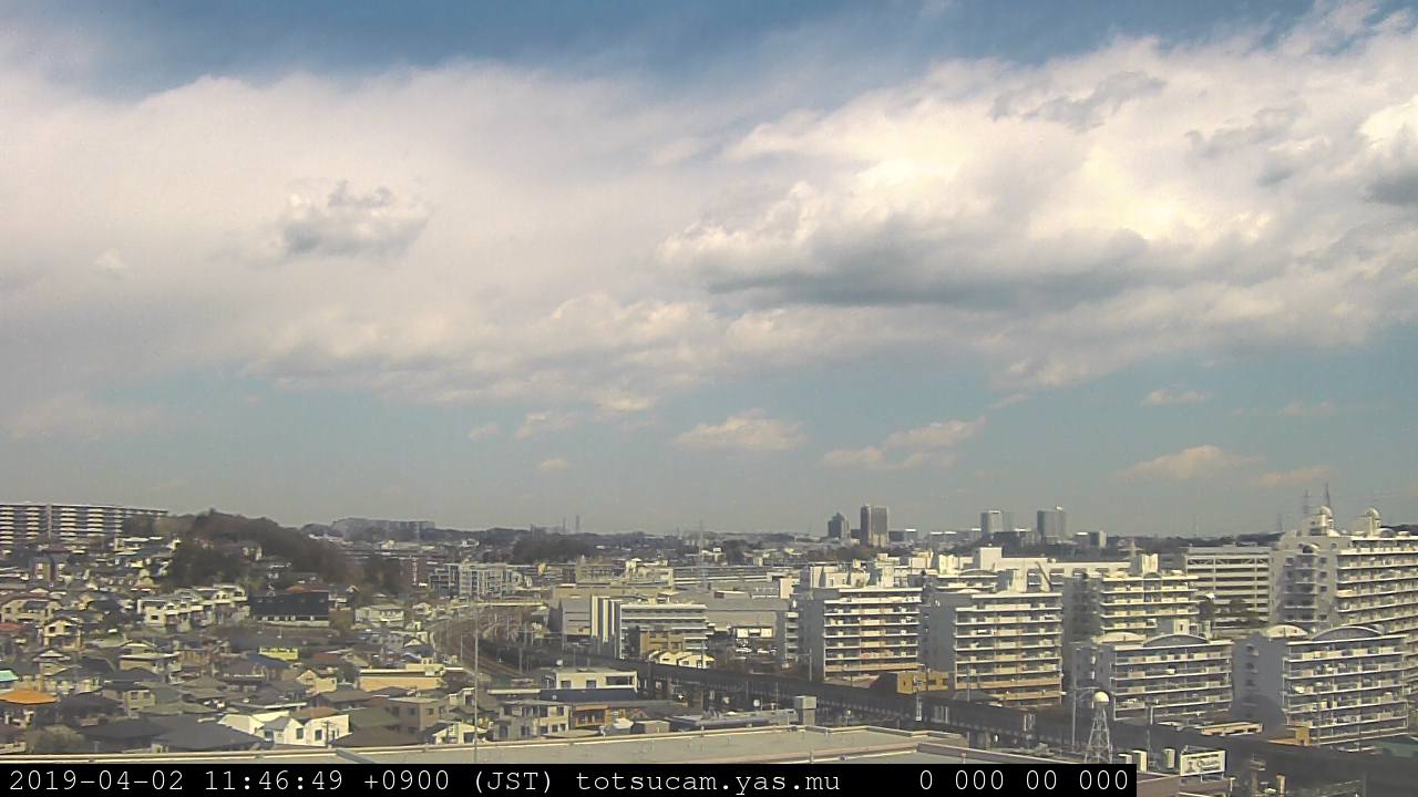適度に曇った日の雲の動き (例: 2005-10-24) がとても楽しめます。 正面を横切っている高架は横須賀線下りです。 その下に横須賀線上り、東海道線、同貨物線が走っていますが、 高架に隠れていてよく見えません。 夜間は特に中央左寄りの車の動きがよく見えます。