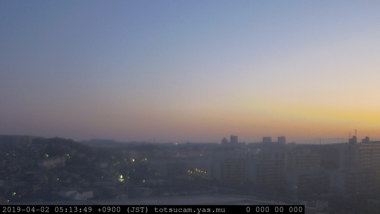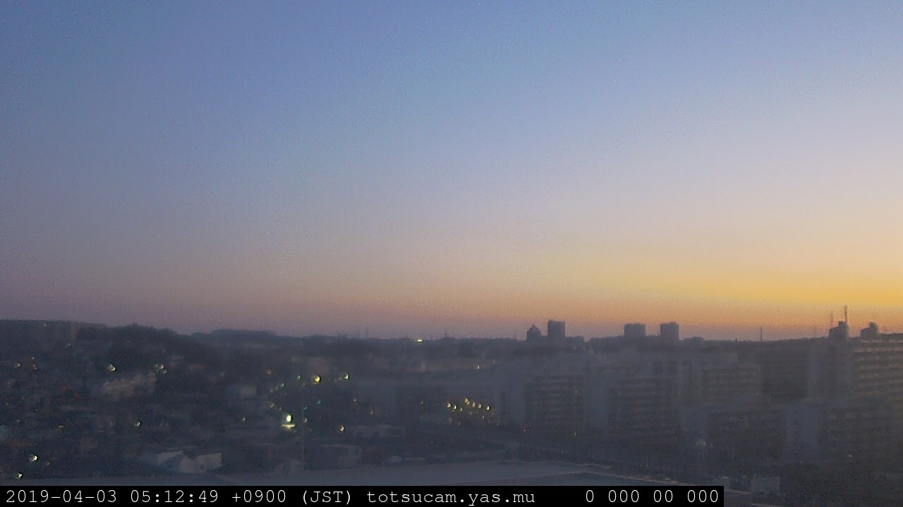 横浜市戸塚駅周辺から 東戸塚方面(北北東)を望む展望カメラの映像です。 左は現在の映像です。 下に並んでいるのは、 7日間に亘る日の出どき、昼間、夕暮れどきの写真(サムネイル)です。 それぞれ、日の出15分前、南中時、日没20分後の写真となっています。 各写真の下にはmpeg形式の動画へのリンクがあります。 それぞれ、日の出、南中、日没の前後1時間の画像です。 右欄にはその日24時間の動画へのリンクがあります。 この7日間以外は日付が一覧表示されています。 日付部分をクリックすると、 その日付から7日分が展開されて表示されます。