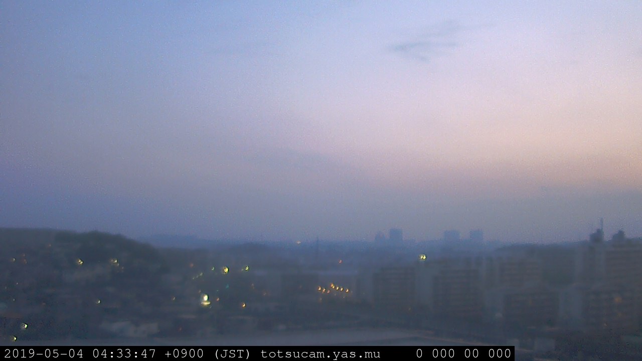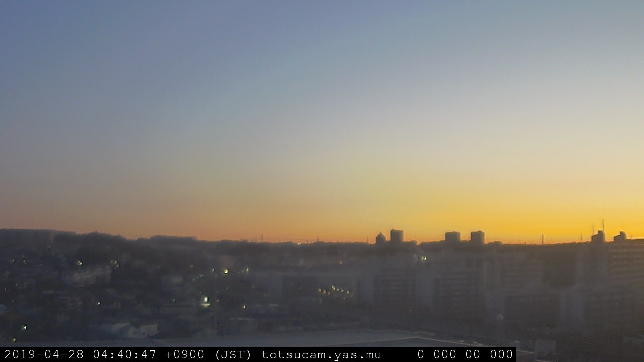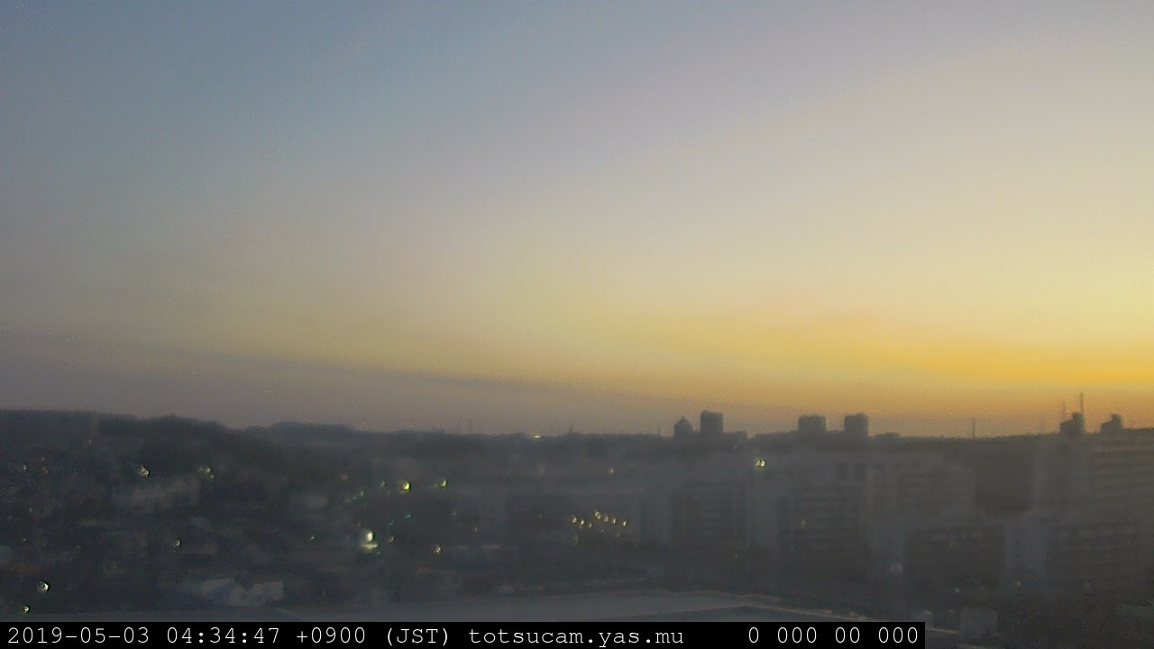 横浜市戸塚駅周辺から 東戸塚方面(北北東)を望む展望カメラの映像です。 左は現在の映像です。 下に並んでいるのは、 7日間に亘る日の出どき、昼間、夕暮れどきの写真(サムネイル)です。 それぞれ、日の出15分前、南中時、日没20分後の写真となっています。 各写真の下にはmpeg形式の動画へのリンクがあります。 それぞれ、日の出、南中、日没の前後1時間の画像です。 右欄にはその日24時間の動画へのリンクがあります。 この7日間以外は日付が一覧表示されています。 日付部分をクリックすると、 その日付から7日分が展開されて表示されます。