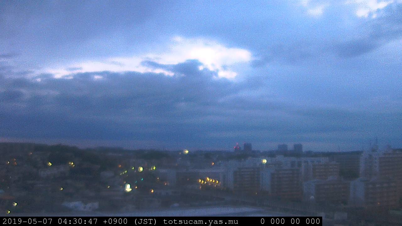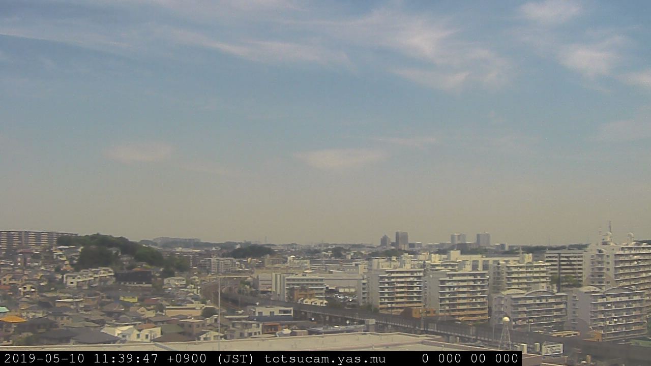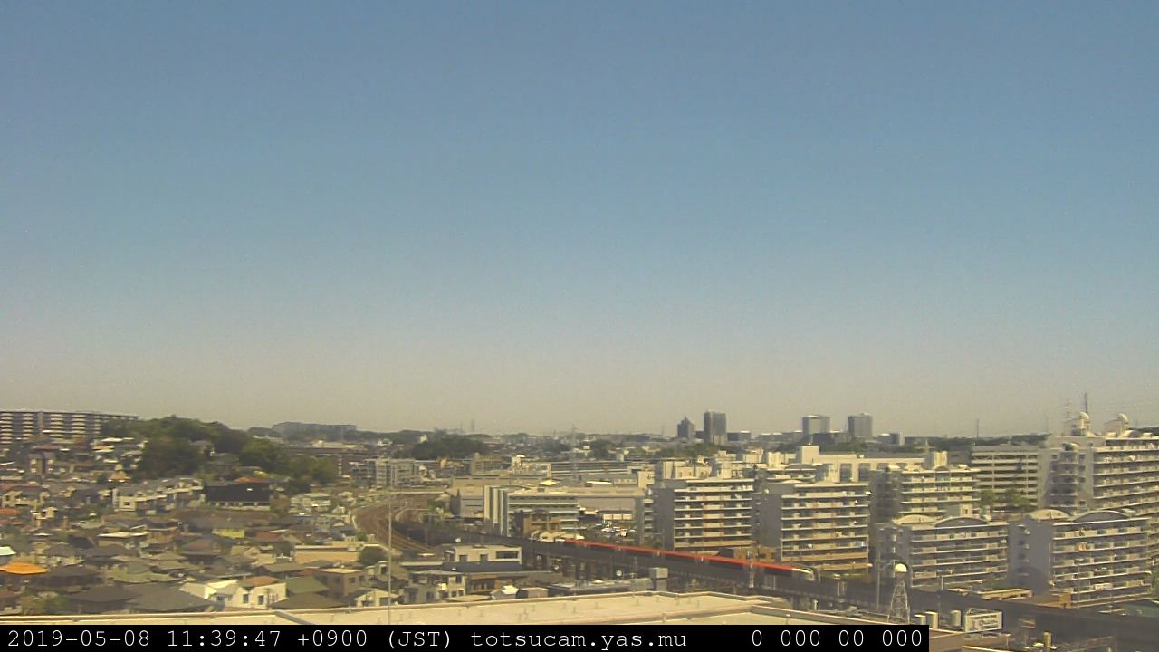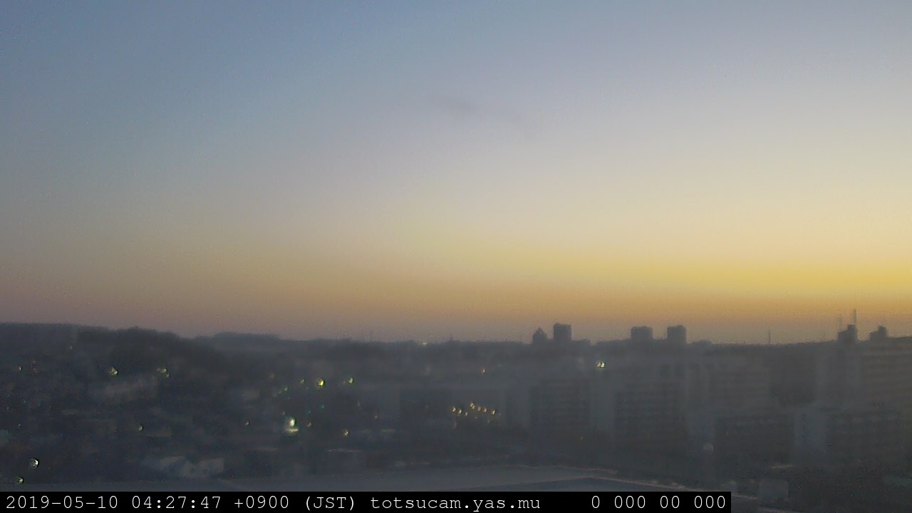 横浜市戸塚駅周辺から 東戸塚方面(北北東)を望む展望カメラの映像です。 左は現在の映像です。 下に並んでいるのは、 7日間に亘る日の出どき、昼間、夕暮れどきの写真(サムネイル)です。 それぞれ、日の出15分前、南中時、日没20分後の写真となっています。 各写真の下にはmpeg形式の動画へのリンクがあります。 それぞれ、日の出、南中、日没の前後1時間の画像です。 右欄にはその日24時間の動画へのリンクがあります。 この7日間以外は日付が一覧表示されています。 日付部分をクリックすると、 その日付から7日分が展開されて表示されます。