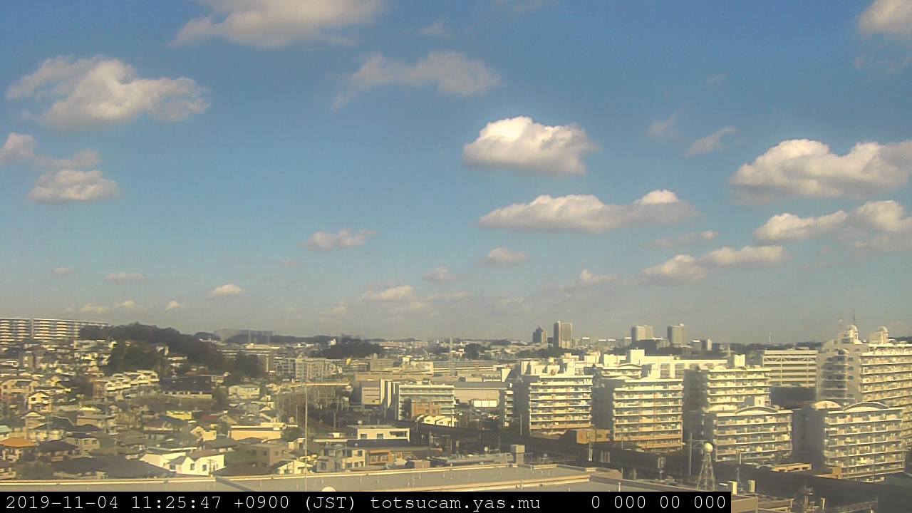 適度に曇った日の雲の動き (例: 2005-10-24) がとても楽しめます。 正面を横切っている高架は横須賀線下りです。 その下に横須賀線上り、東海道線、同貨物線が走っていますが、 高架に隠れていてよく見えません。 夜間は特に中央左寄りの車の動きがよく見えます。