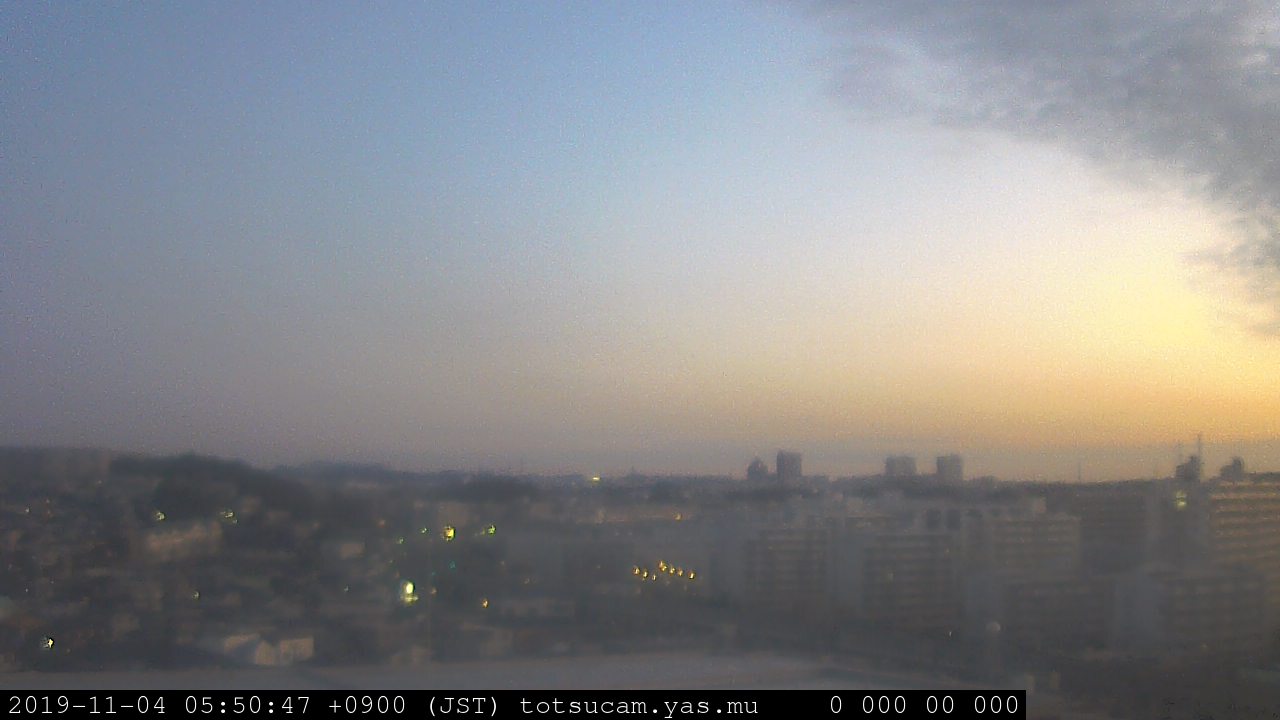 横浜市戸塚駅周辺から 東戸塚方面(北北東)を望む展望カメラの映像です。 左は現在の映像です。 下に並んでいるのは、 7日間に亘る日の出どき、昼間、夕暮れどきの写真(サムネイル)です。 それぞれ、日の出15分前、南中時、日没20分後の写真となっています。 各写真の下にはmpeg形式の動画へのリンクがあります。 それぞれ、日の出、南中、日没の前後1時間の画像です。 右欄にはその日24時間の動画へのリンクがあります。 この7日間以外は日付が一覧表示されています。 日付部分をクリックすると、 その日付から7日分が展開されて表示されます。