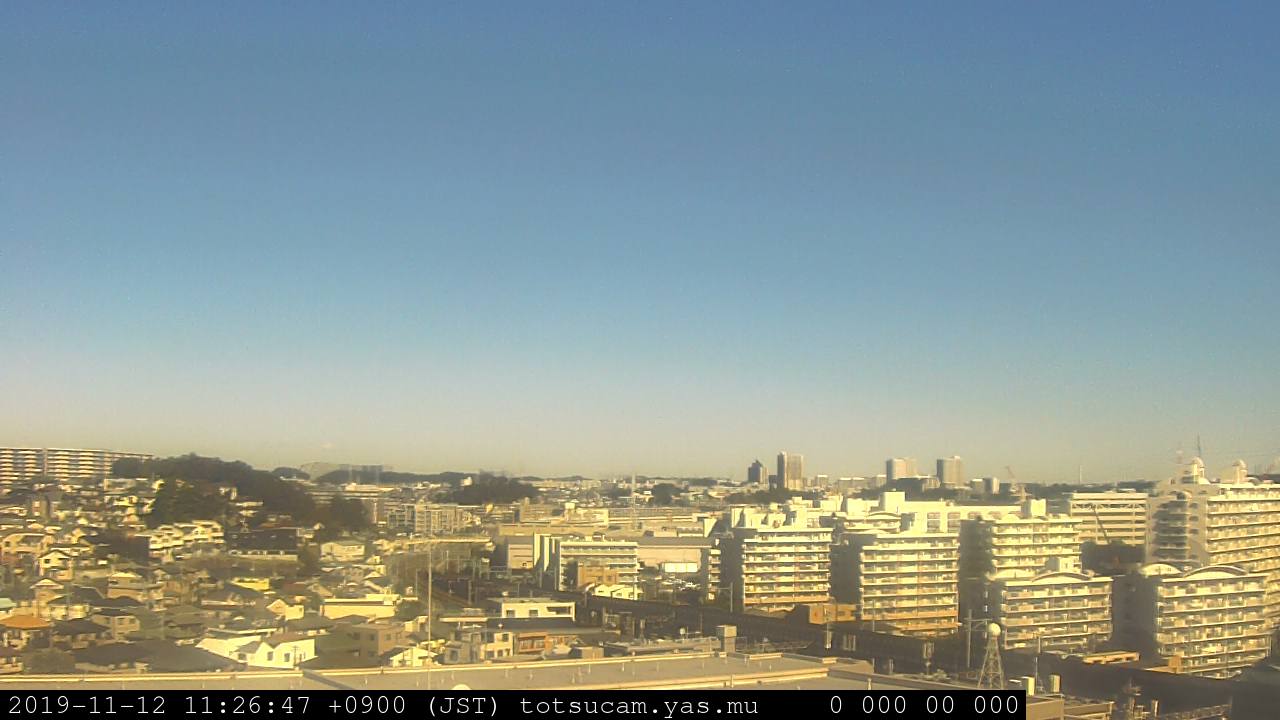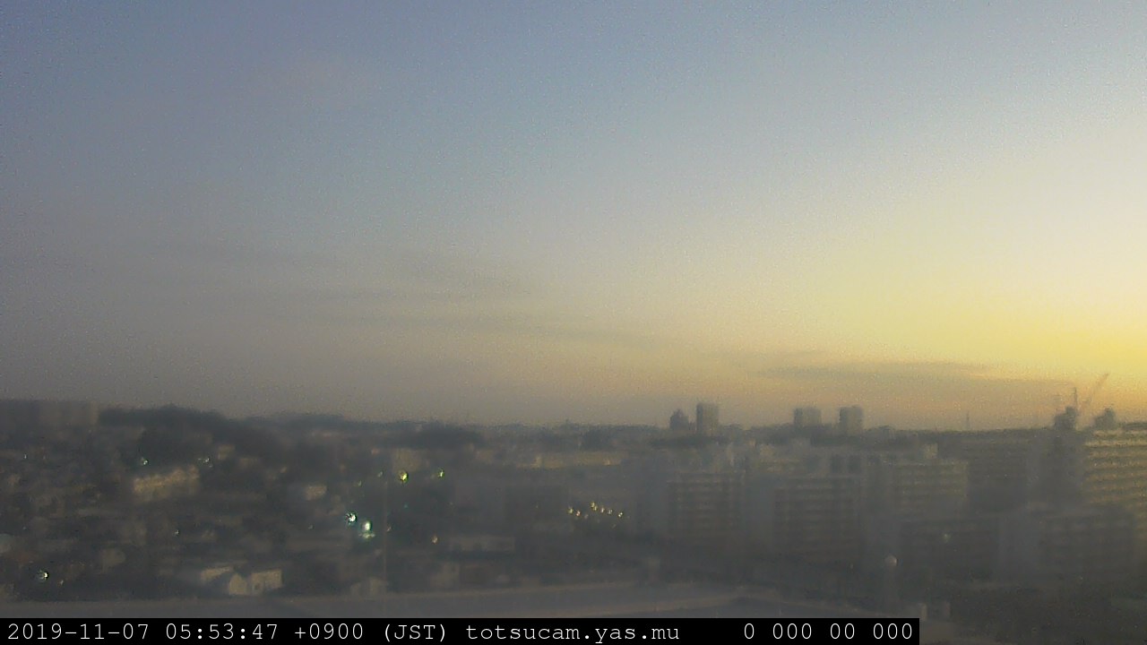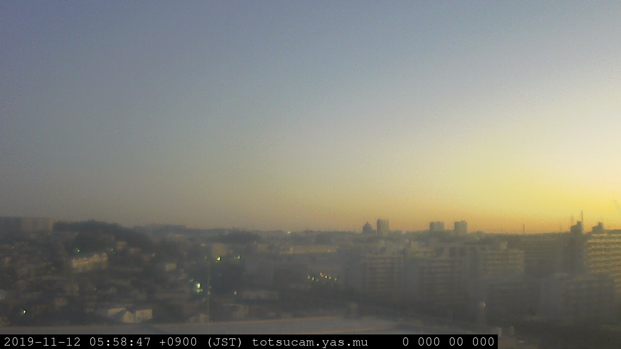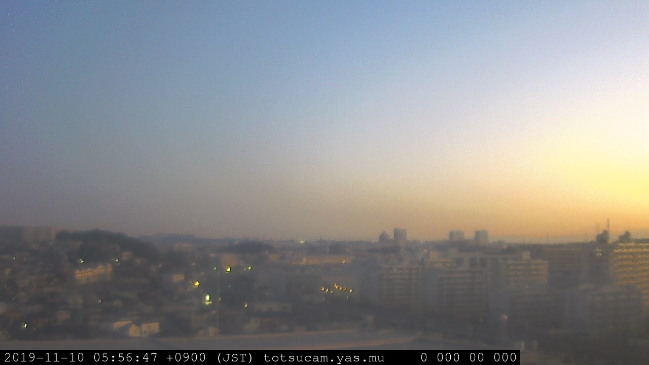 横浜市戸塚駅周辺から 東戸塚方面(北北東)を望む展望カメラの映像です。 左は現在の映像です。 下に並んでいるのは、 7日間に亘る日の出どき、昼間、夕暮れどきの写真(サムネイル)です。 それぞれ、日の出15分前、南中時、日没20分後の写真となっています。 各写真の下にはmpeg形式の動画へのリンクがあります。 それぞれ、日の出、南中、日没の前後1時間の画像です。 右欄にはその日24時間の動画へのリンクがあります。 この7日間以外は日付が一覧表示されています。 日付部分をクリックすると、 その日付から7日分が展開されて表示されます。