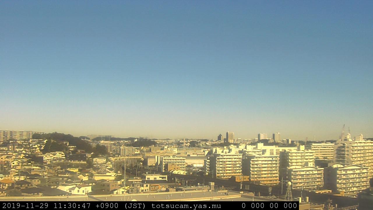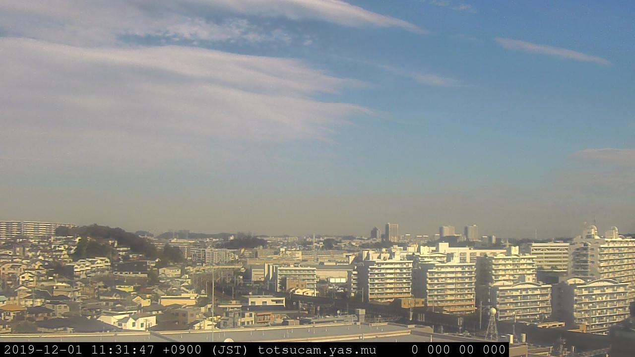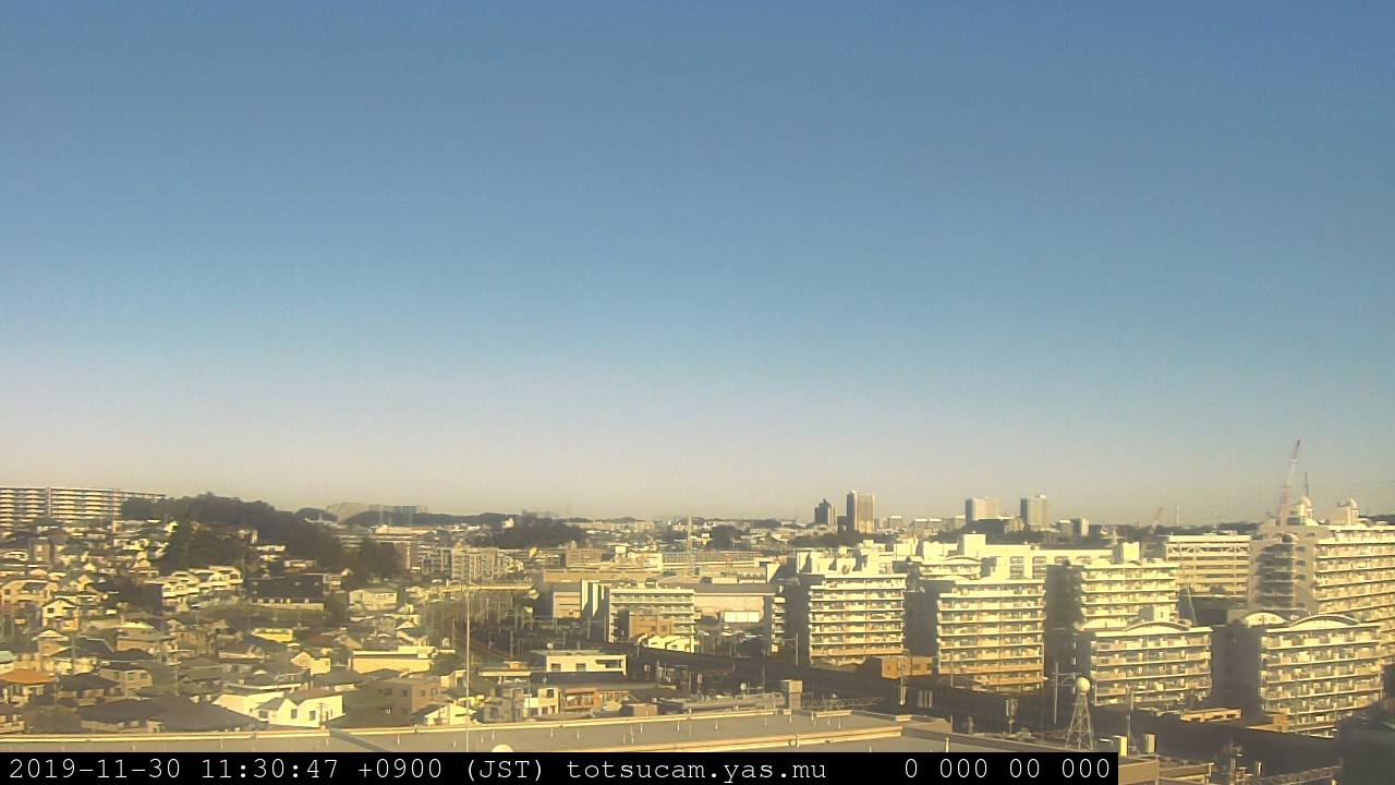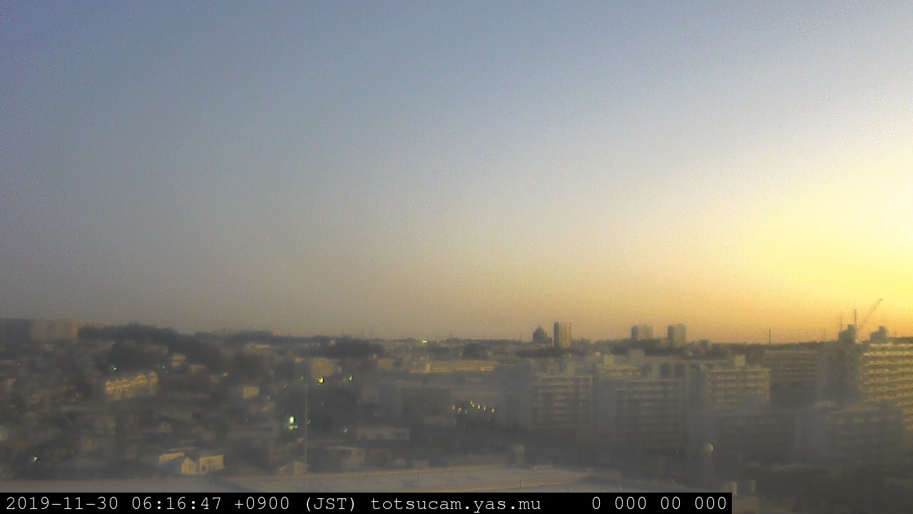 横浜市戸塚駅周辺から 東戸塚方面(北北東)を望む展望カメラの映像です。 左は現在の映像です。 下に並んでいるのは、 7日間に亘る日の出どき、昼間、夕暮れどきの写真(サムネイル)です。 それぞれ、日の出15分前、南中時、日没20分後の写真となっています。 各写真の下にはmpeg形式の動画へのリンクがあります。 それぞれ、日の出、南中、日没の前後1時間の画像です。 右欄にはその日24時間の動画へのリンクがあります。 この7日間以外は日付が一覧表示されています。 日付部分をクリックすると、 その日付から7日分が展開されて表示されます。