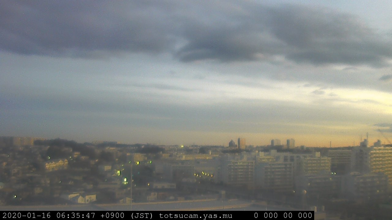 横浜市戸塚駅周辺から 東戸塚方面(北北東)を望む展望カメラの映像です。 左は現在の映像です。 下に並んでいるのは、 7日間に亘る日の出どき、昼間、夕暮れどきの写真(サムネイル)です。 それぞれ、日の出15分前、南中時、日没20分後の写真となっています。 各写真の下にはmpeg形式の動画へのリンクがあります。 それぞれ、日の出、南中、日没の前後1時間の画像です。 右欄にはその日24時間の動画へのリンクがあります。 この7日間以外は日付が一覧表示されています。 日付部分をクリックすると、 その日付から7日分が展開されて表示されます。