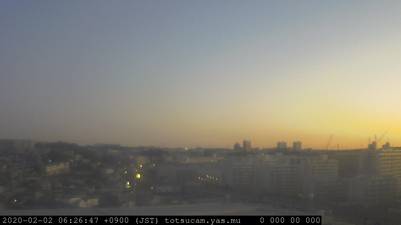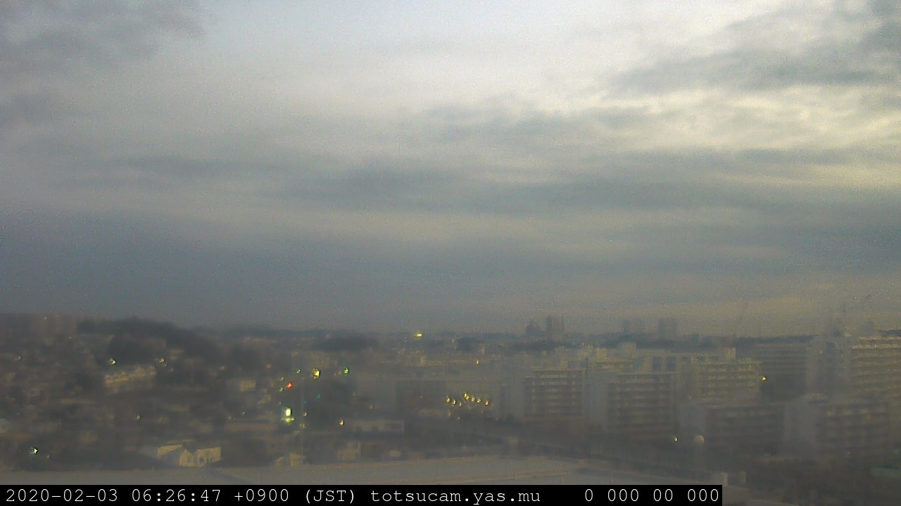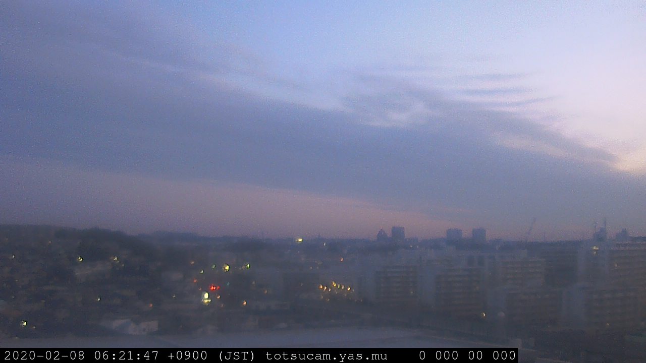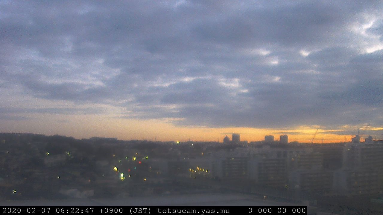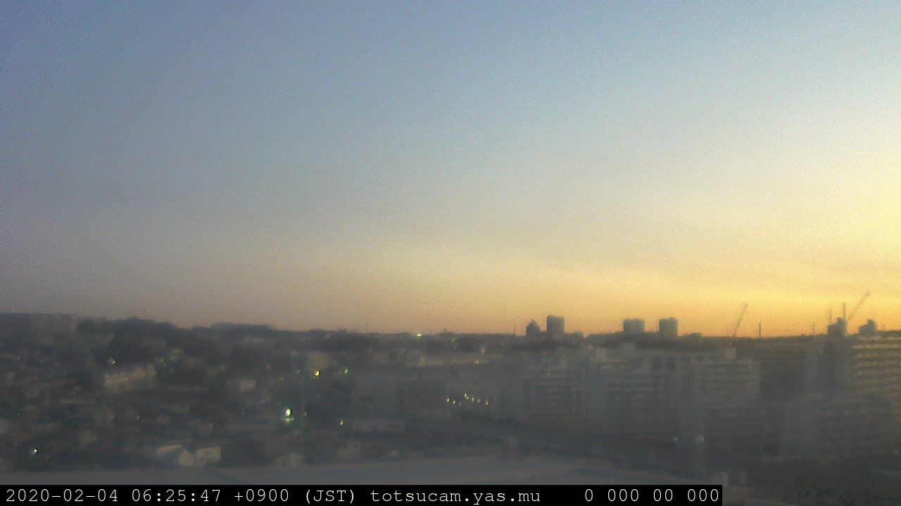 横浜市戸塚駅周辺から 東戸塚方面(北北東)を望む展望カメラの映像です。 左は現在の映像です。 下に並んでいるのは、 7日間に亘る日の出どき、昼間、夕暮れどきの写真(サムネイル)です。 それぞれ、日の出15分前、南中時、日没20分後の写真となっています。 各写真の下にはmpeg形式の動画へのリンクがあります。 それぞれ、日の出、南中、日没の前後1時間の画像です。 右欄にはその日24時間の動画へのリンクがあります。 この7日間以外は日付が一覧表示されています。 日付部分をクリックすると、 その日付から7日分が展開されて表示されます。