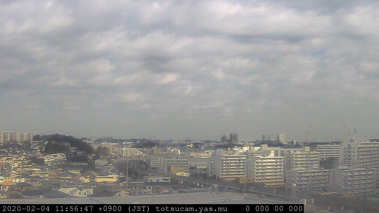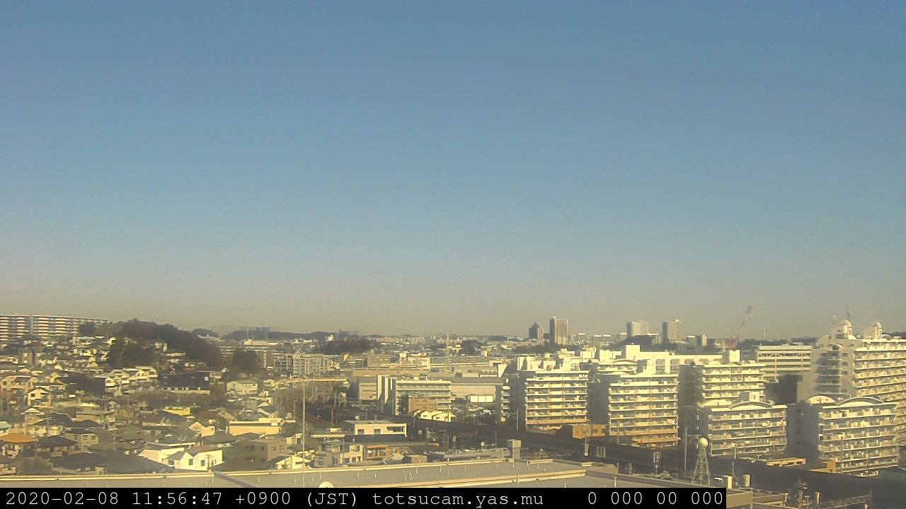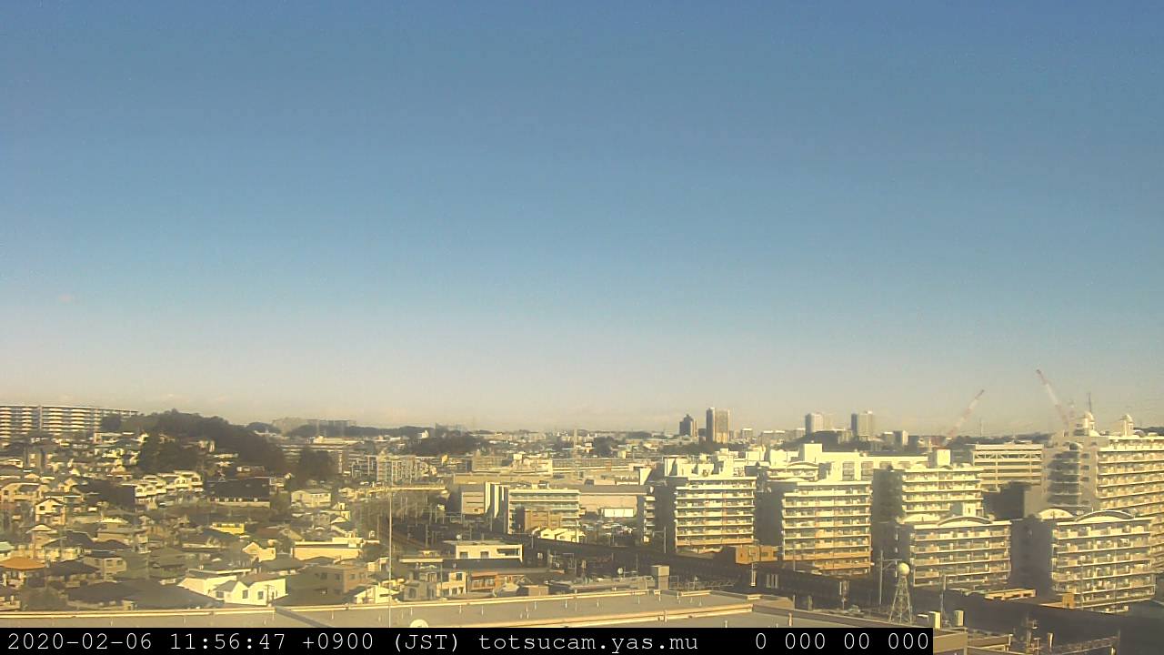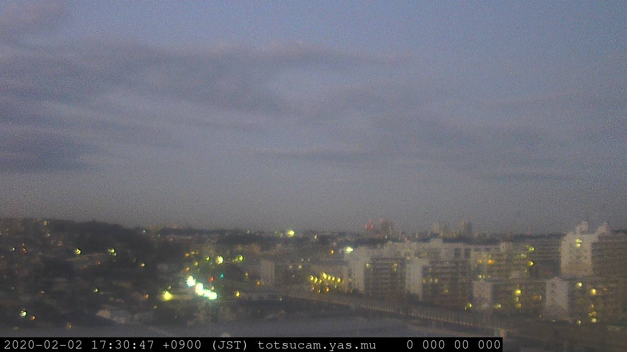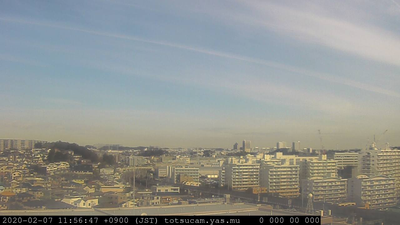 横浜市戸塚駅周辺から 東戸塚方面(北北東)を望む展望カメラの映像です。 左は現在の映像です。 下に並んでいるのは、 7日間に亘る日の出どき、昼間、夕暮れどきの写真(サムネイル)です。 それぞれ、日の出15分前、南中時、日没20分後の写真となっています。 各写真の下にはmpeg形式の動画へのリンクがあります。 それぞれ、日の出、南中、日没の前後1時間の画像です。 右欄にはその日24時間の動画へのリンクがあります。 この7日間以外は日付が一覧表示されています。 日付部分をクリックすると、 その日付から7日分が展開されて表示されます。