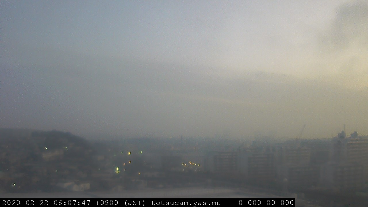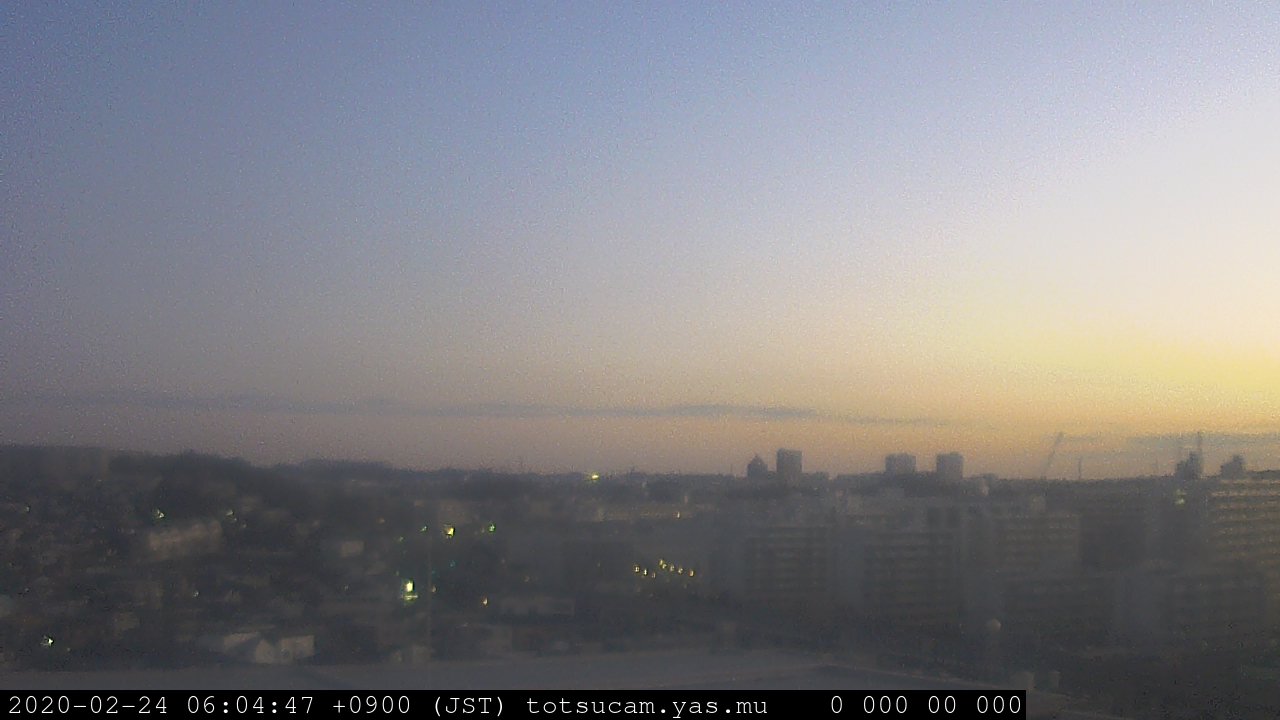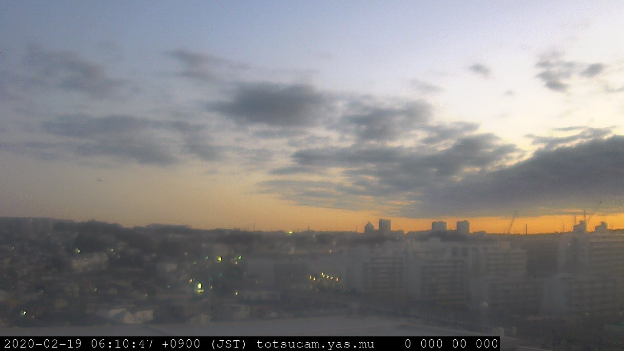 横浜市戸塚駅周辺から 東戸塚方面(北北東)を望む展望カメラの映像です。 左は現在の映像です。 下に並んでいるのは、 7日間に亘る日の出どき、昼間、夕暮れどきの写真(サムネイル)です。 それぞれ、日の出15分前、南中時、日没20分後の写真となっています。 各写真の下にはmpeg形式の動画へのリンクがあります。 それぞれ、日の出、南中、日没の前後1時間の画像です。 右欄にはその日24時間の動画へのリンクがあります。 この7日間以外は日付が一覧表示されています。 日付部分をクリックすると、 その日付から7日分が展開されて表示されます。