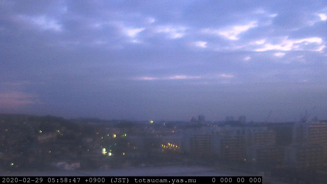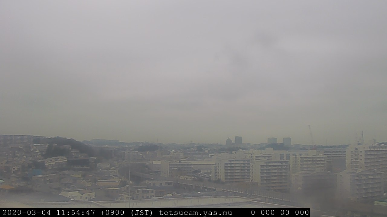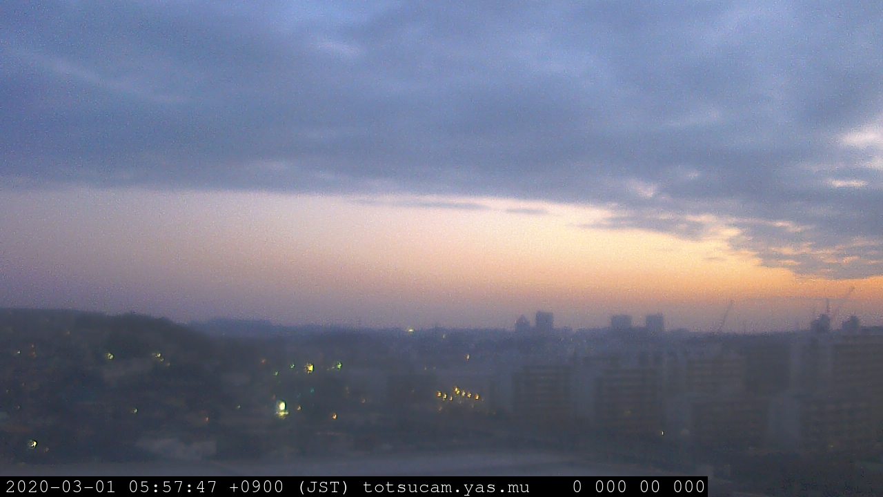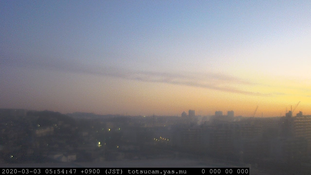 横浜市戸塚駅周辺から 東戸塚方面(北北東)を望む展望カメラの映像です。 左は現在の映像です。 下に並んでいるのは、 7日間に亘る日の出どき、昼間、夕暮れどきの写真(サムネイル)です。 それぞれ、日の出15分前、南中時、日没20分後の写真となっています。 各写真の下にはmpeg形式の動画へのリンクがあります。 それぞれ、日の出、南中、日没の前後1時間の画像です。 右欄にはその日24時間の動画へのリンクがあります。 この7日間以外は日付が一覧表示されています。 日付部分をクリックすると、 その日付から7日分が展開されて表示されます。