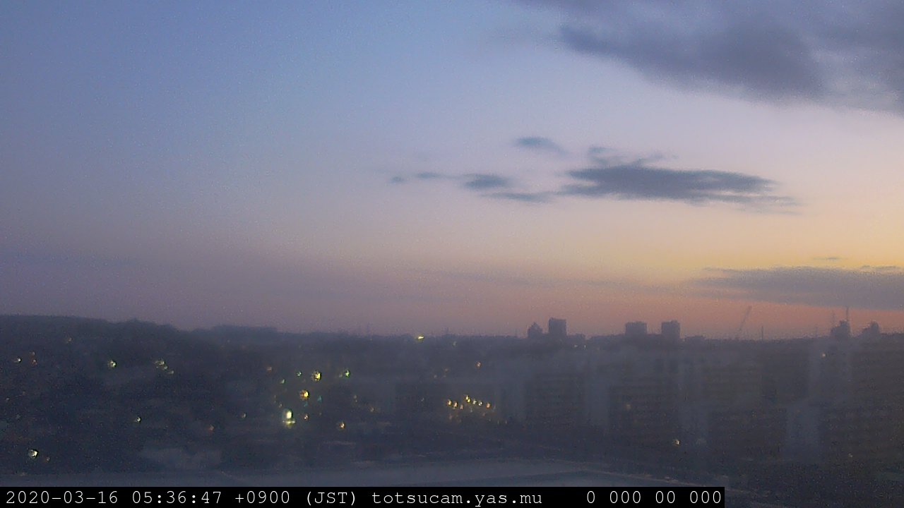 横浜市戸塚駅周辺から 東戸塚方面(北北東)を望む展望カメラの映像です。 左は現在の映像です。 下に並んでいるのは、 7日間に亘る日の出どき、昼間、夕暮れどきの写真(サムネイル)です。 それぞれ、日の出15分前、南中時、日没20分後の写真となっています。 各写真の下にはmpeg形式の動画へのリンクがあります。 それぞれ、日の出、南中、日没の前後1時間の画像です。 右欄にはその日24時間の動画へのリンクがあります。 この7日間以外は日付が一覧表示されています。 日付部分をクリックすると、 その日付から7日分が展開されて表示されます。