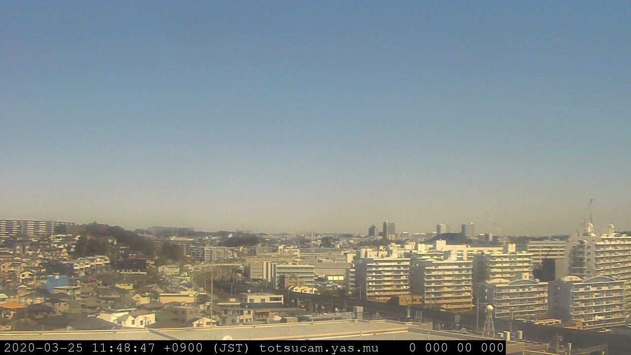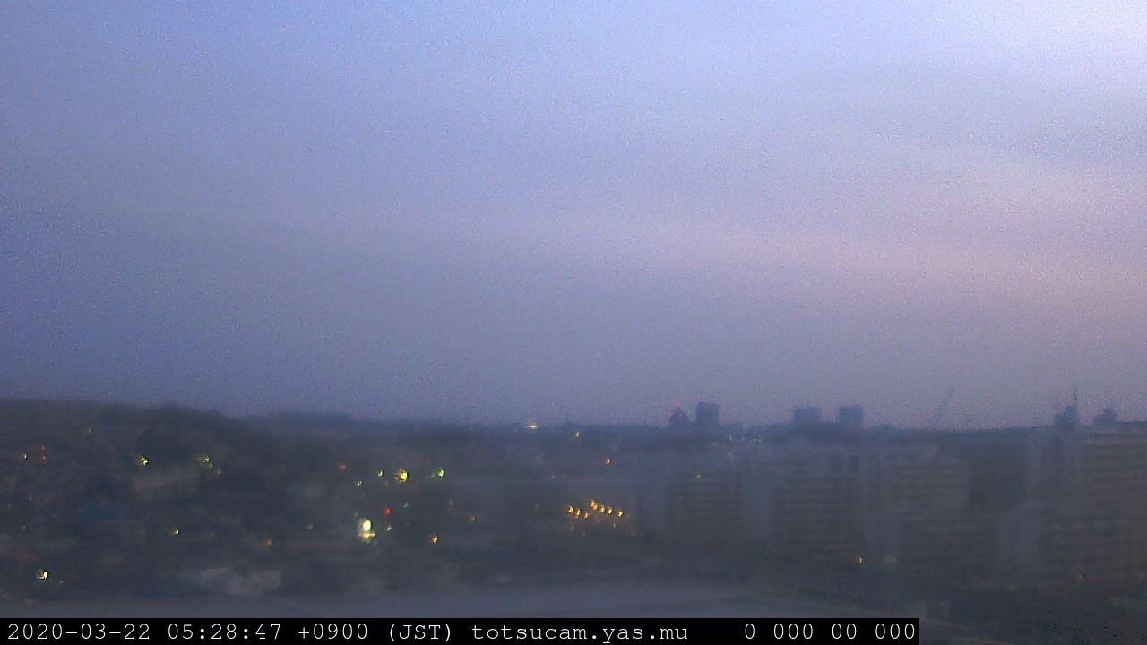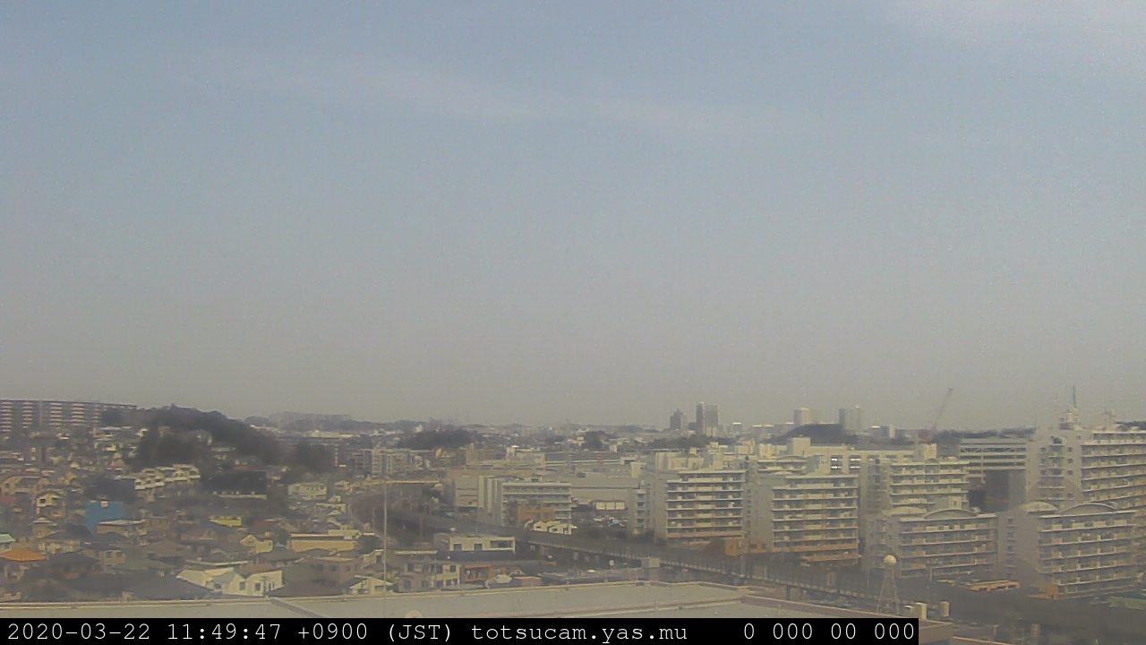 横浜市戸塚駅周辺から 東戸塚方面(北北東)を望む展望カメラの映像です。 左は現在の映像です。 下に並んでいるのは、 7日間に亘る日の出どき、昼間、夕暮れどきの写真(サムネイル)です。 それぞれ、日の出15分前、南中時、日没20分後の写真となっています。 各写真の下にはmpeg形式の動画へのリンクがあります。 それぞれ、日の出、南中、日没の前後1時間の画像です。 右欄にはその日24時間の動画へのリンクがあります。 この7日間以外は日付が一覧表示されています。 日付部分をクリックすると、 その日付から7日分が展開されて表示されます。