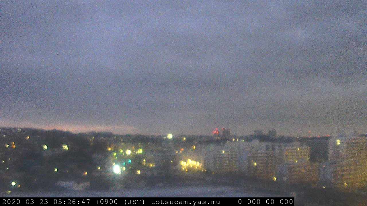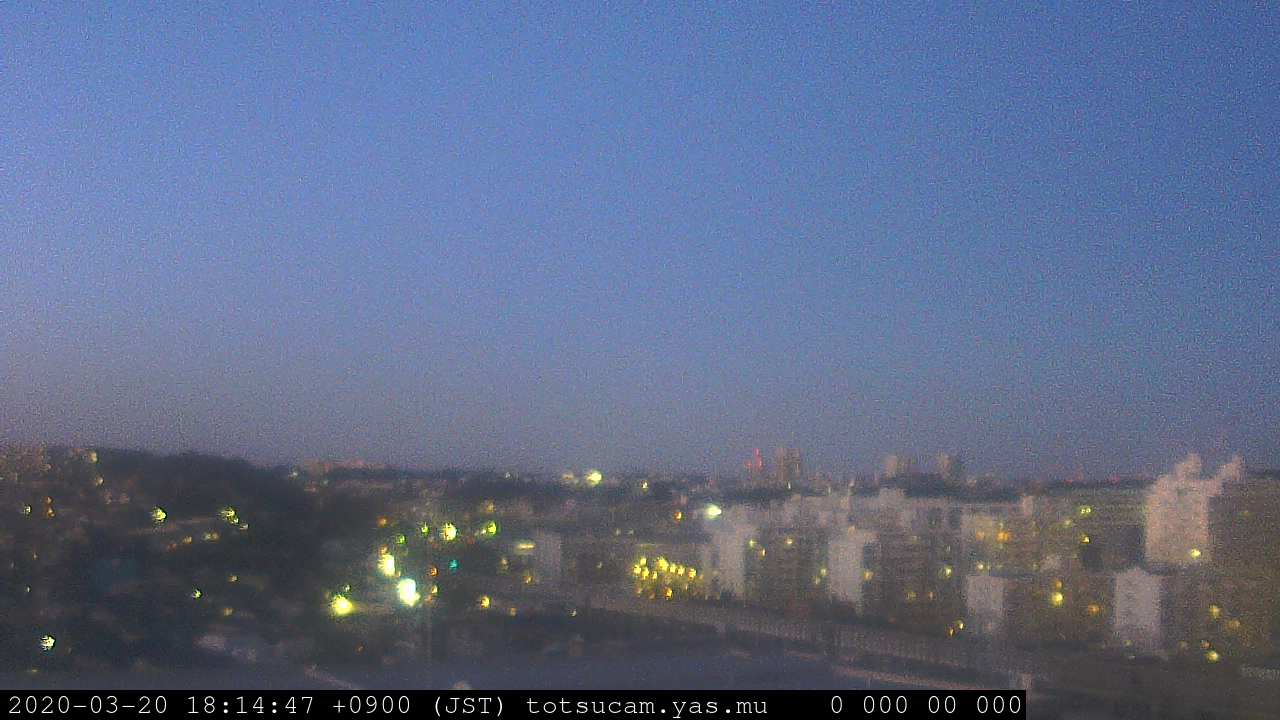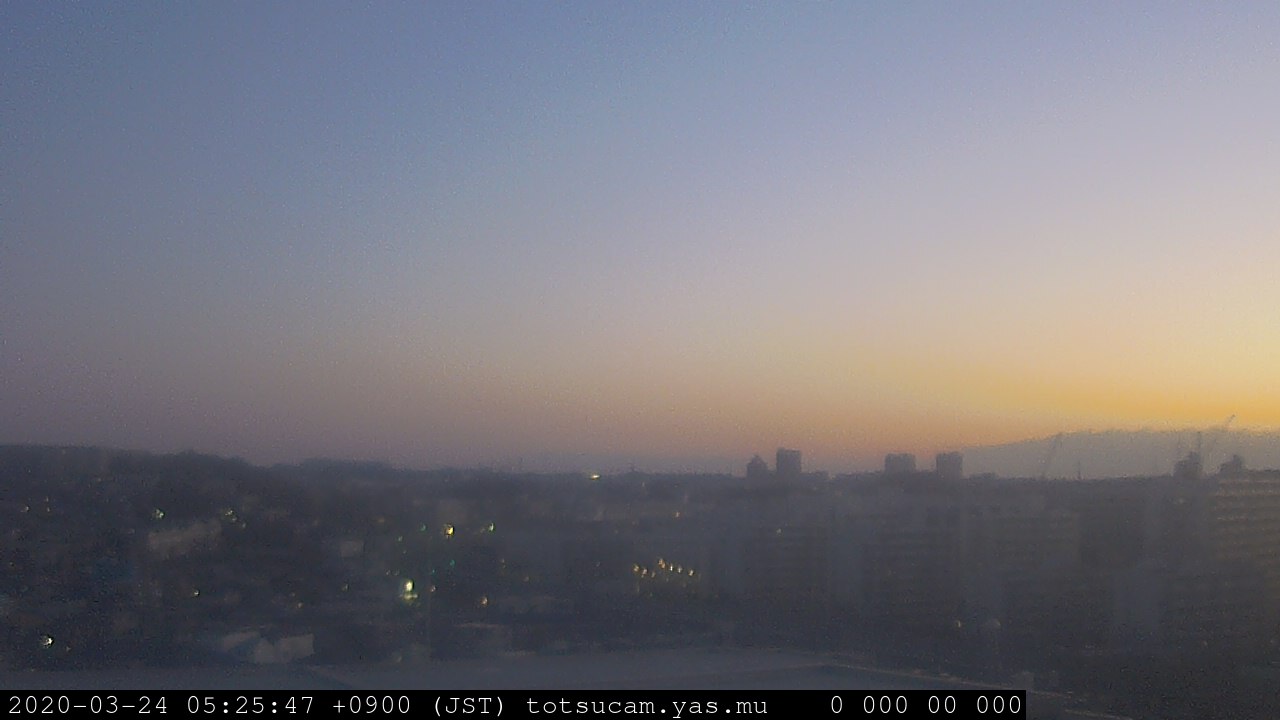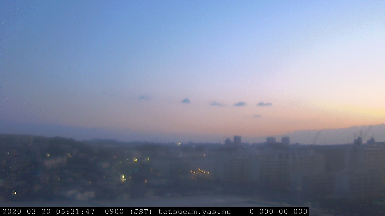 横浜市戸塚駅周辺から 東戸塚方面(北北東)を望む展望カメラの映像です。 左は現在の映像です。 下に並んでいるのは、 7日間に亘る日の出どき、昼間、夕暮れどきの写真(サムネイル)です。 それぞれ、日の出15分前、南中時、日没20分後の写真となっています。 各写真の下にはmpeg形式の動画へのリンクがあります。 それぞれ、日の出、南中、日没の前後1時間の画像です。 右欄にはその日24時間の動画へのリンクがあります。 この7日間以外は日付が一覧表示されています。 日付部分をクリックすると、 その日付から7日分が展開されて表示されます。