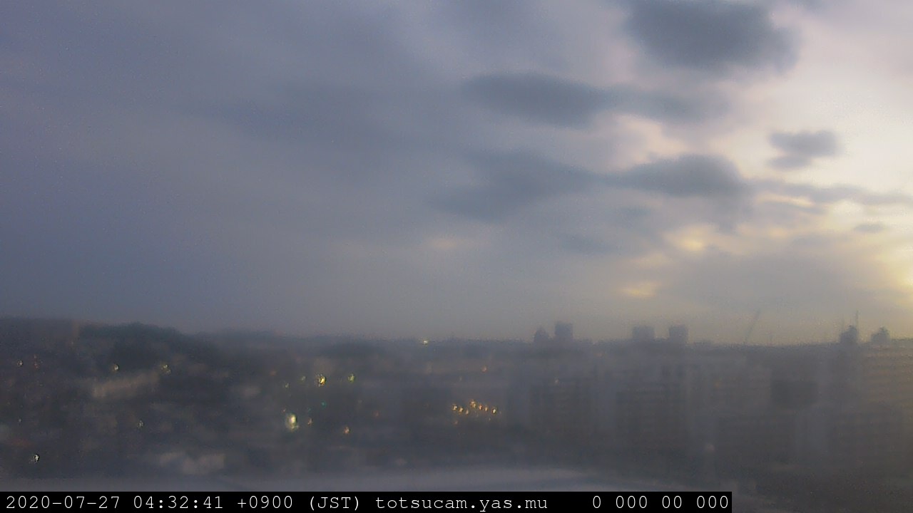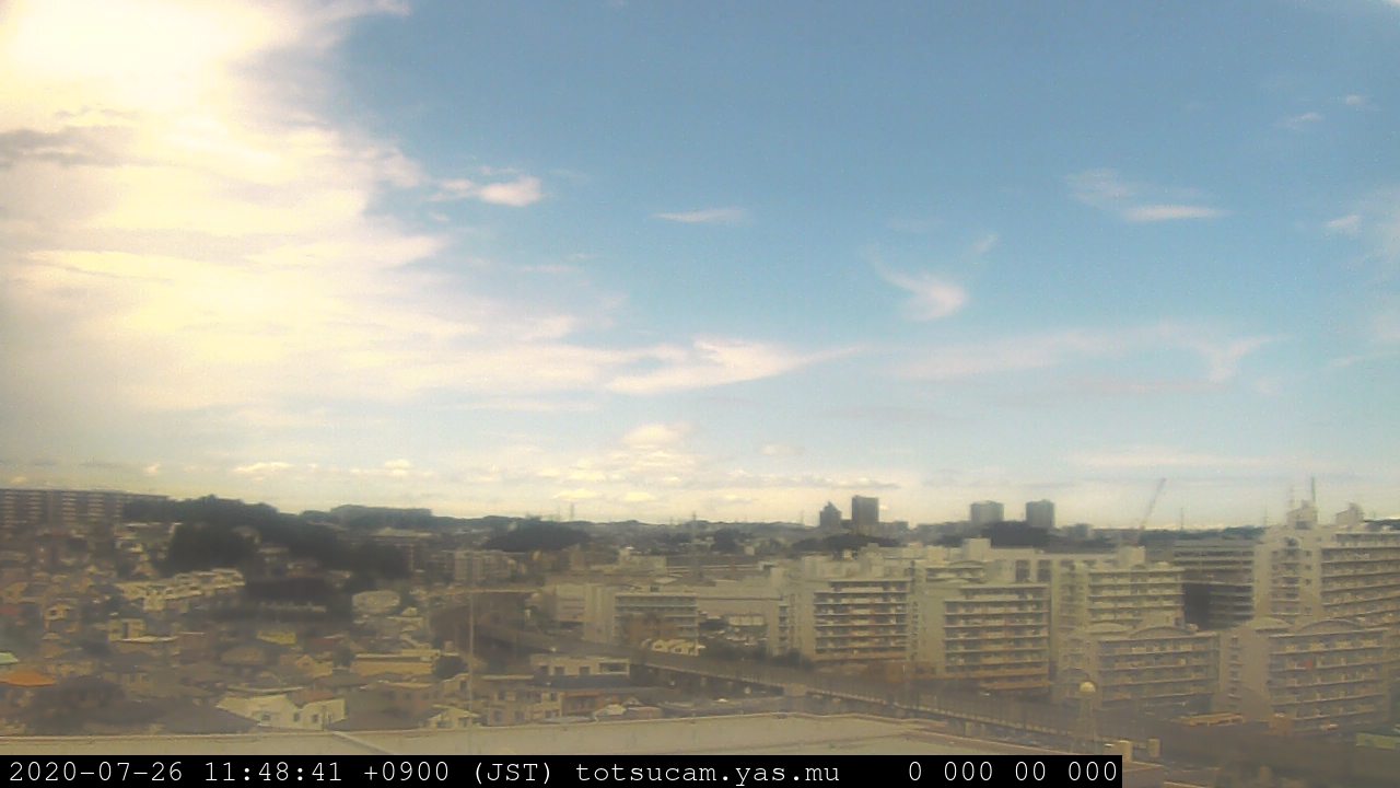 横浜市戸塚駅周辺から 東戸塚方面(北北東)を望む展望カメラの映像です。 左は現在の映像です。 下に並んでいるのは、 7日間に亘る日の出どき、昼間、夕暮れどきの写真(サムネイル)です。 それぞれ、日の出15分前、南中時、日没20分後の写真となっています。 各写真の下にはmpeg形式の動画へのリンクがあります。 それぞれ、日の出、南中、日没の前後1時間の画像です。 右欄にはその日24時間の動画へのリンクがあります。 この7日間以外は日付が一覧表示されています。 日付部分をクリックすると、 その日付から7日分が展開されて表示されます。