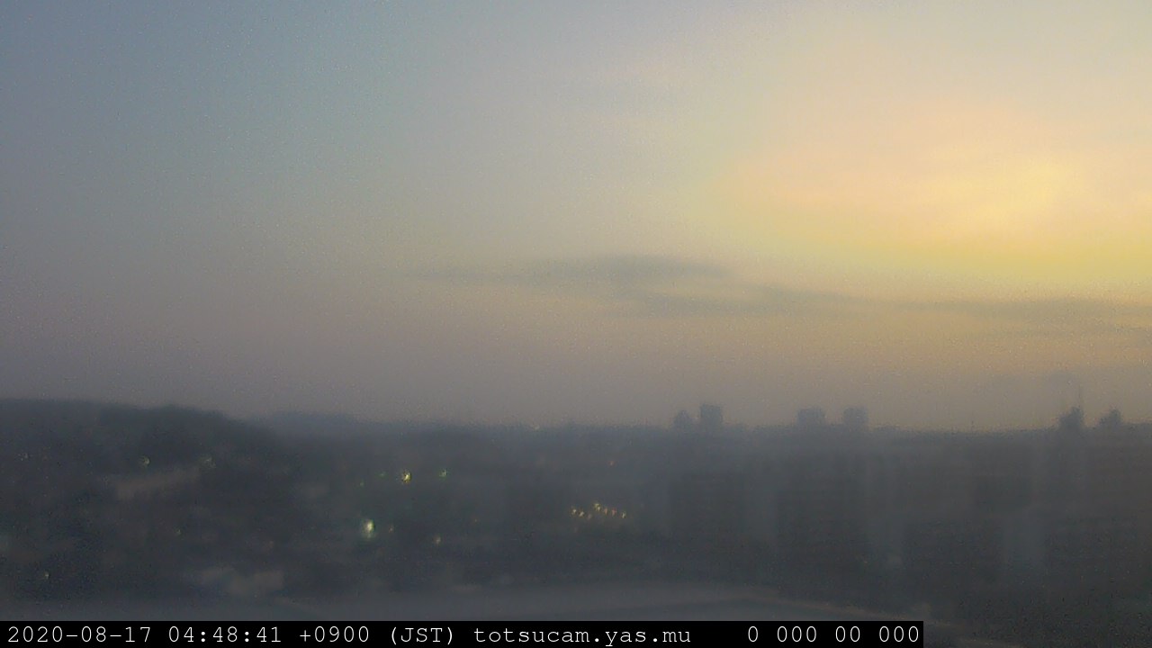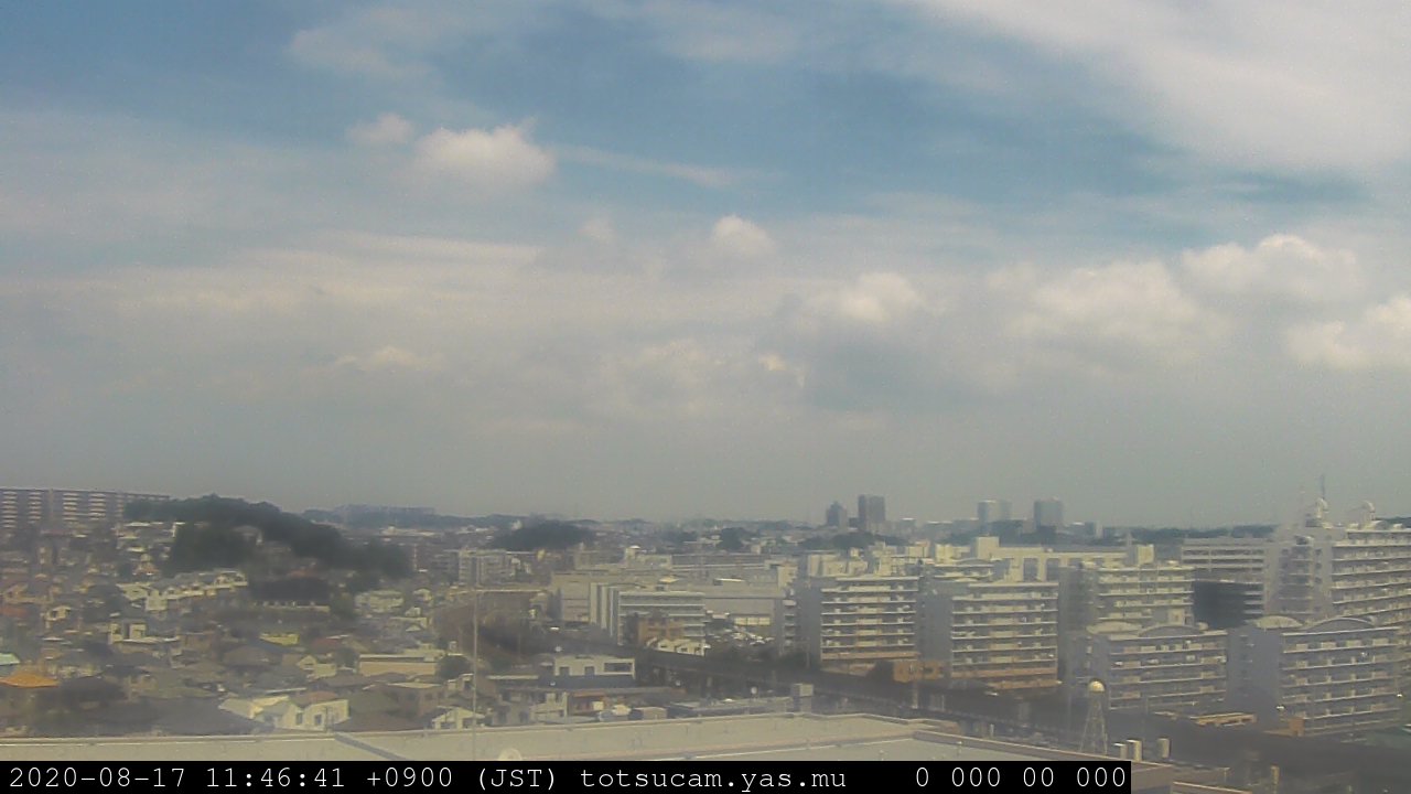 横浜市戸塚駅周辺から 東戸塚方面(北北東)を望む展望カメラの映像です。 左は現在の映像です。 下に並んでいるのは、 7日間に亘る日の出どき、昼間、夕暮れどきの写真(サムネイル)です。 それぞれ、日の出15分前、南中時、日没20分後の写真となっています。 各写真の下にはmpeg形式の動画へのリンクがあります。 それぞれ、日の出、南中、日没の前後1時間の画像です。 右欄にはその日24時間の動画へのリンクがあります。 この7日間以外は日付が一覧表示されています。 日付部分をクリックすると、 その日付から7日分が展開されて表示されます。