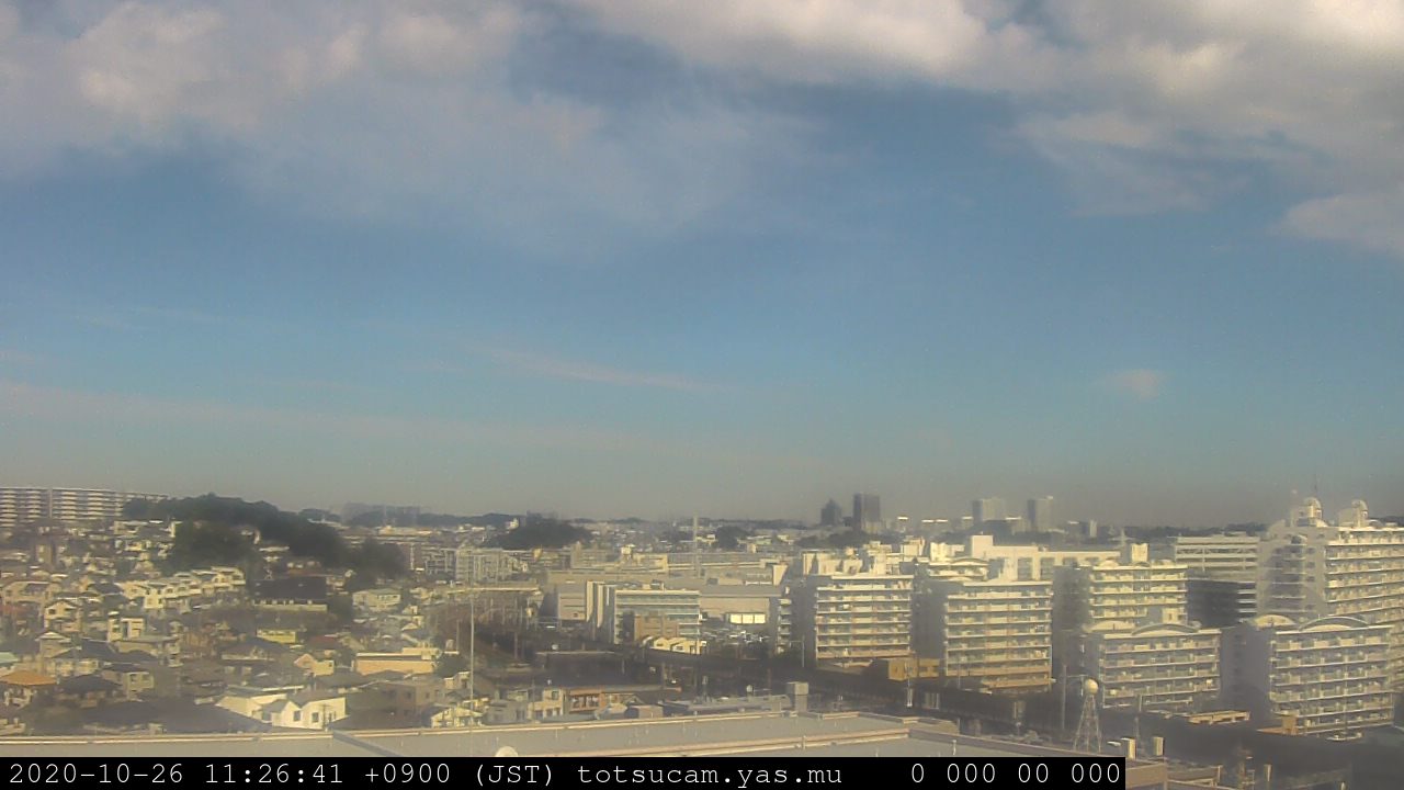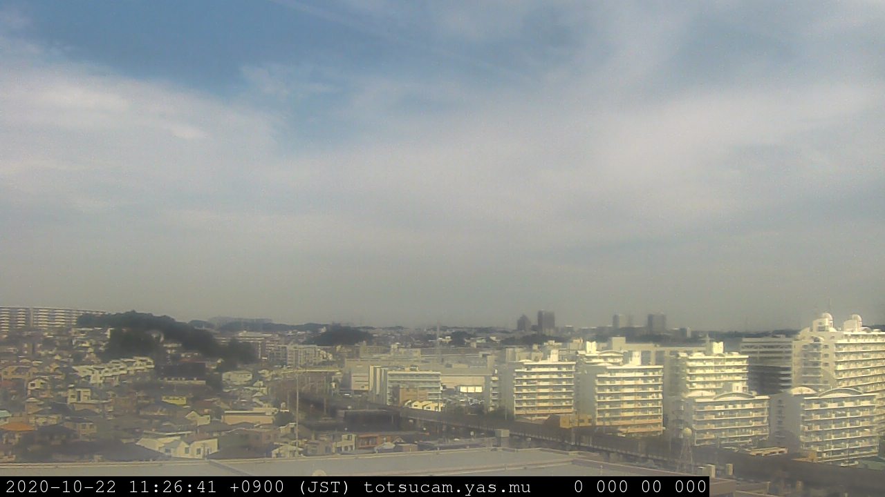 適度に曇った日の雲の動き (例: 2005-10-24) がとても楽しめます。 正面を横切っている高架は横須賀線下りです。 その下に横須賀線上り、東海道線、同貨物線が走っていますが、 高架に隠れていてよく見えません。 夜間は特に中央左寄りの車の動きがよく見えます。