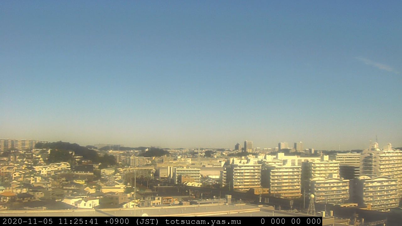 横浜市戸塚駅周辺から 東戸塚方面(北北東)を望む展望カメラの映像です。 左は現在の映像です。 下に並んでいるのは、 7日間に亘る日の出どき、昼間、夕暮れどきの写真(サムネイル)です。 それぞれ、日の出15分前、南中時、日没20分後の写真となっています。 各写真の下にはmpeg形式の動画へのリンクがあります。 それぞれ、日の出、南中、日没の前後1時間の画像です。 右欄にはその日24時間の動画へのリンクがあります。 この7日間以外は日付が一覧表示されています。 日付部分をクリックすると、 その日付から7日分が展開されて表示されます。