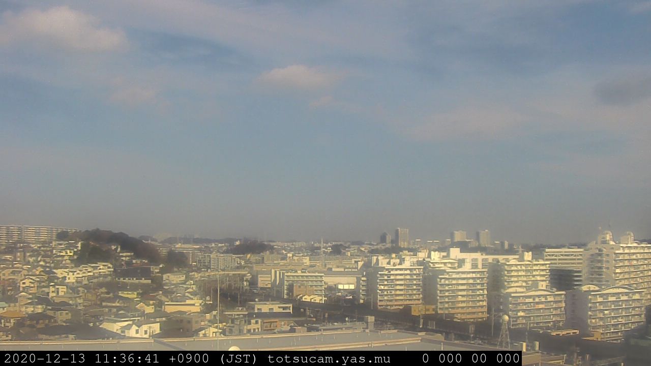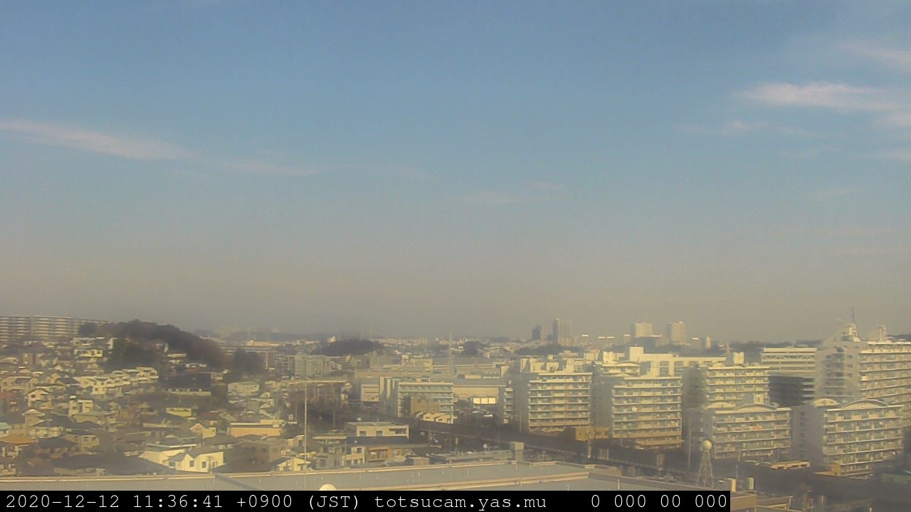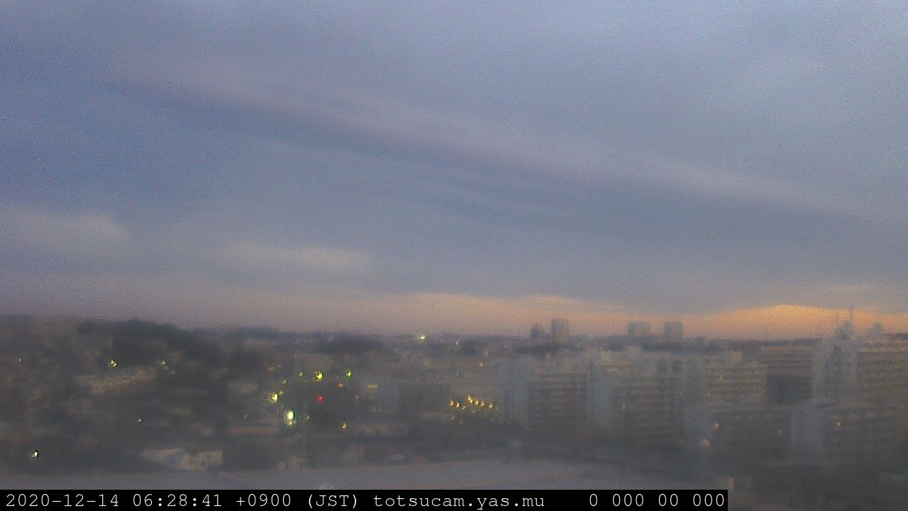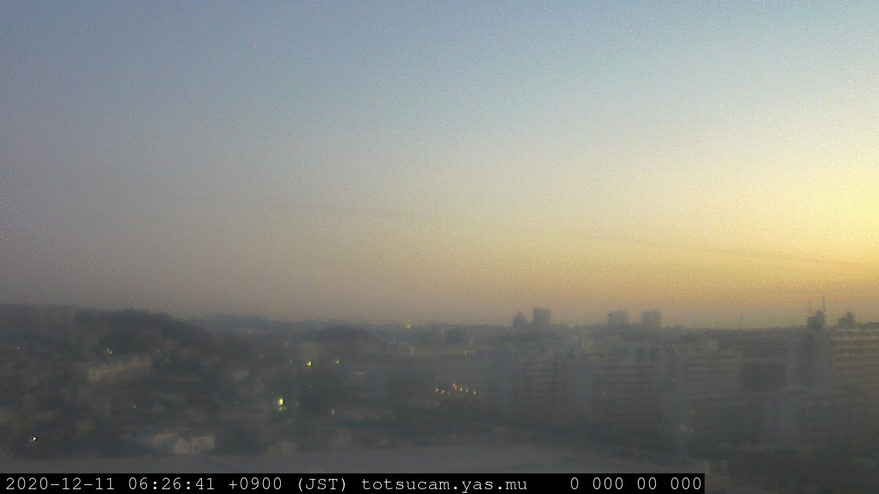 横浜市戸塚駅周辺から 東戸塚方面(北北東)を望む展望カメラの映像です。 左は現在の映像です。 下に並んでいるのは、 7日間に亘る日の出どき、昼間、夕暮れどきの写真(サムネイル)です。 それぞれ、日の出15分前、南中時、日没20分後の写真となっています。 各写真の下にはmpeg形式の動画へのリンクがあります。 それぞれ、日の出、南中、日没の前後1時間の画像です。 右欄にはその日24時間の動画へのリンクがあります。 この7日間以外は日付が一覧表示されています。 日付部分をクリックすると、 その日付から7日分が展開されて表示されます。