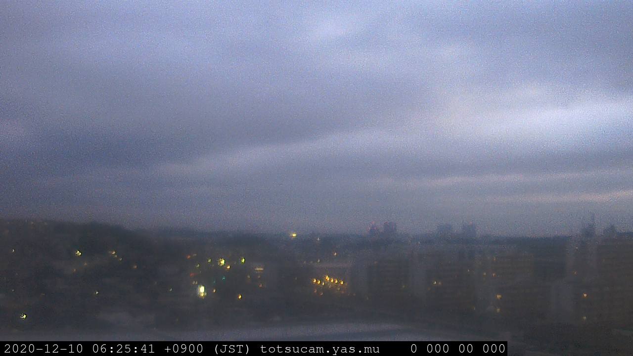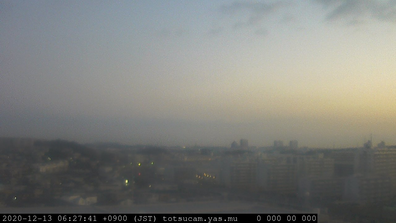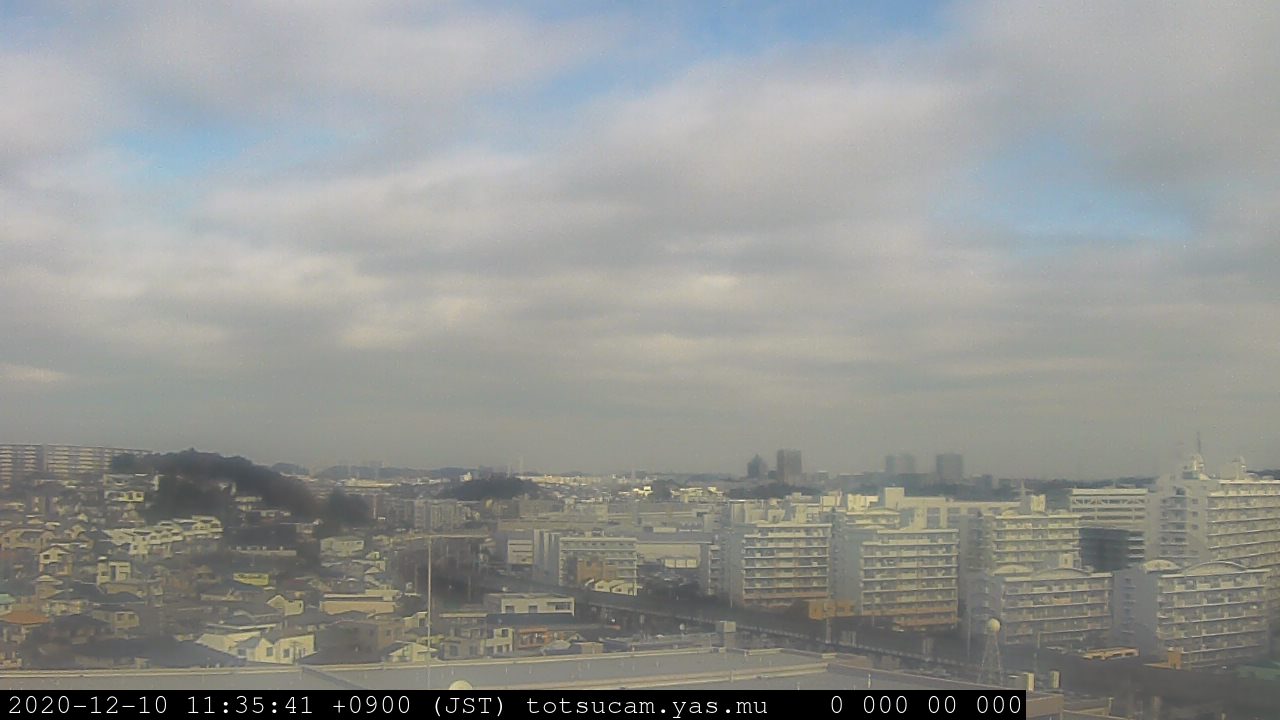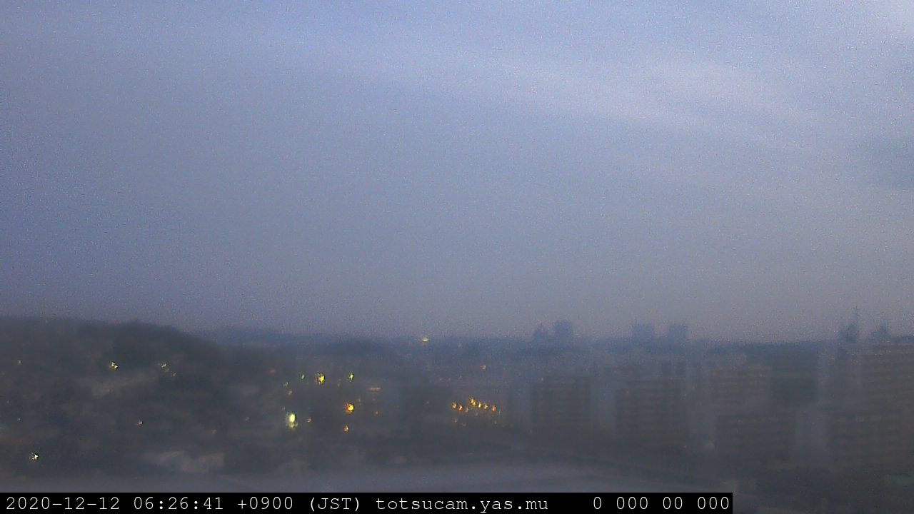 横浜市戸塚駅周辺から 東戸塚方面(北北東)を望む展望カメラの映像です。 左は現在の映像です。 下に並んでいるのは、 7日間に亘る日の出どき、昼間、夕暮れどきの写真(サムネイル)です。 それぞれ、日の出15分前、南中時、日没20分後の写真となっています。 各写真の下にはmpeg形式の動画へのリンクがあります。 それぞれ、日の出、南中、日没の前後1時間の画像です。 右欄にはその日24時間の動画へのリンクがあります。 この7日間以外は日付が一覧表示されています。 日付部分をクリックすると、 その日付から7日分が展開されて表示されます。