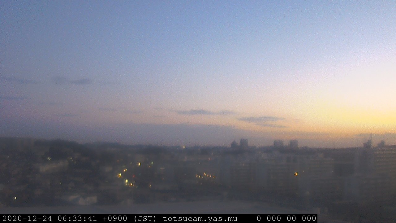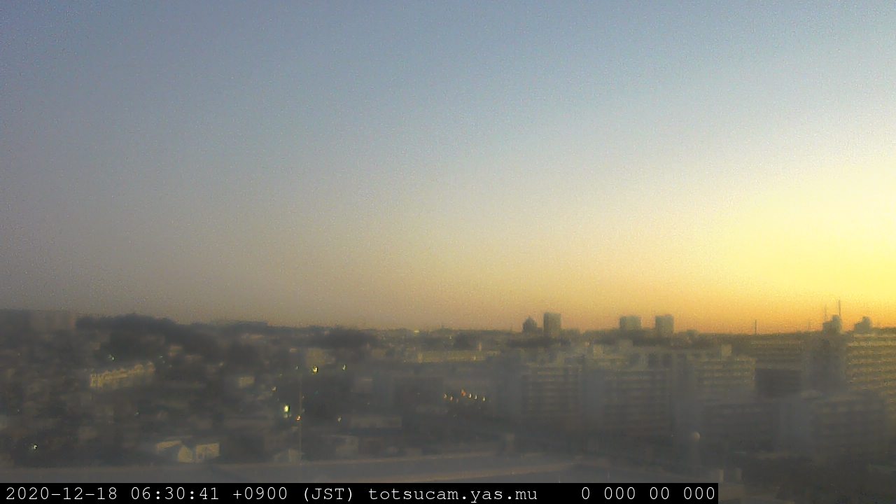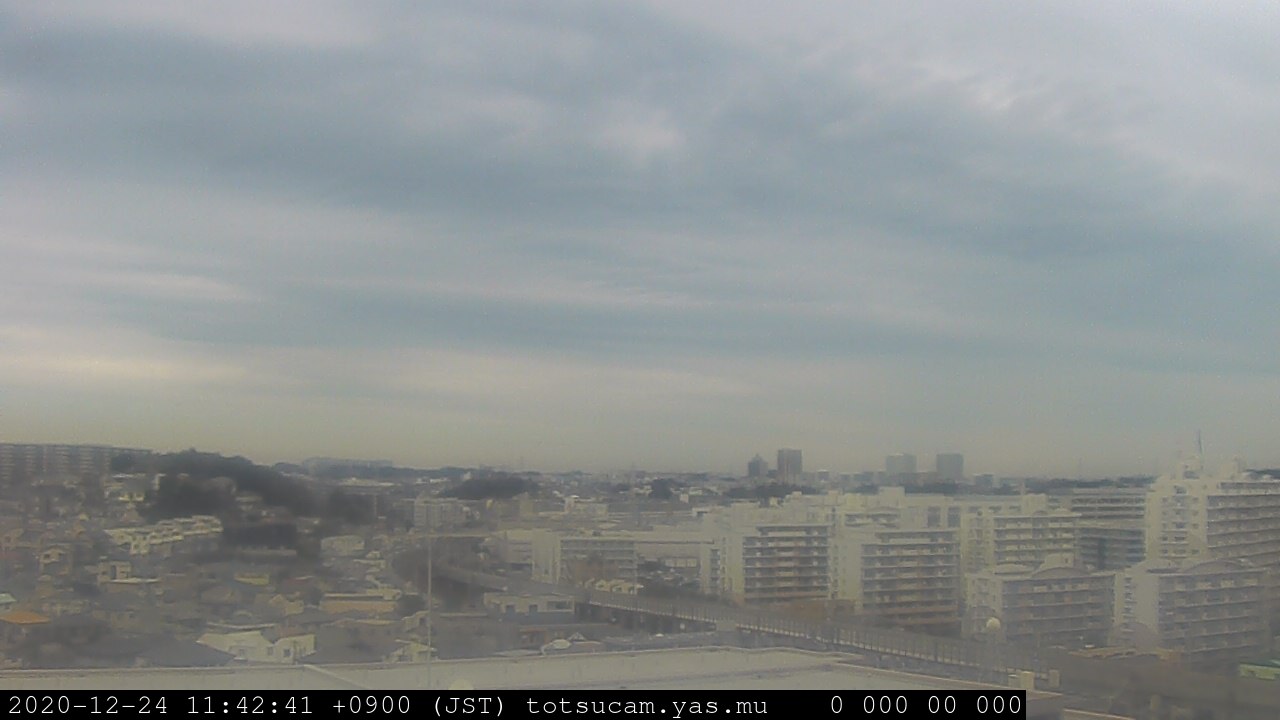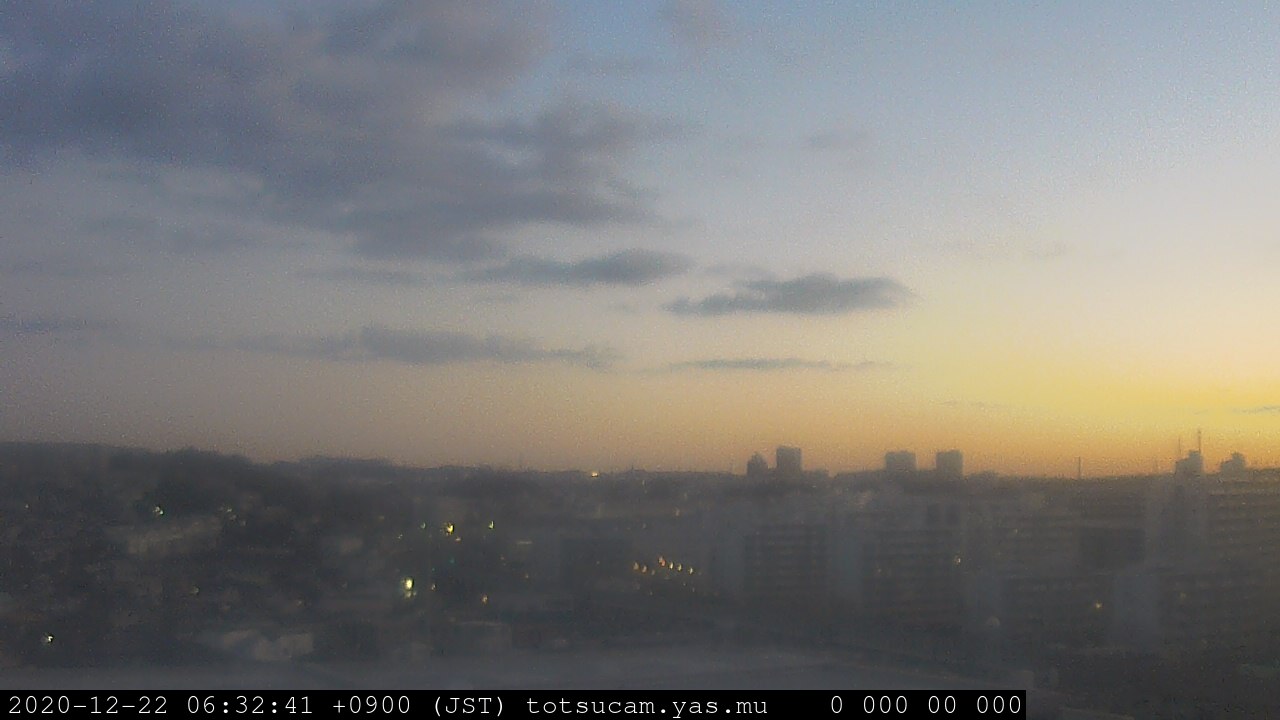 横浜市戸塚駅周辺から 東戸塚方面(北北東)を望む展望カメラの映像です。 左は現在の映像です。 下に並んでいるのは、 7日間に亘る日の出どき、昼間、夕暮れどきの写真(サムネイル)です。 それぞれ、日の出15分前、南中時、日没20分後の写真となっています。 各写真の下にはmpeg形式の動画へのリンクがあります。 それぞれ、日の出、南中、日没の前後1時間の画像です。 右欄にはその日24時間の動画へのリンクがあります。 この7日間以外は日付が一覧表示されています。 日付部分をクリックすると、 その日付から7日分が展開されて表示されます。