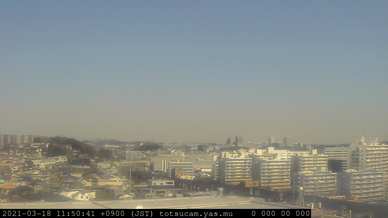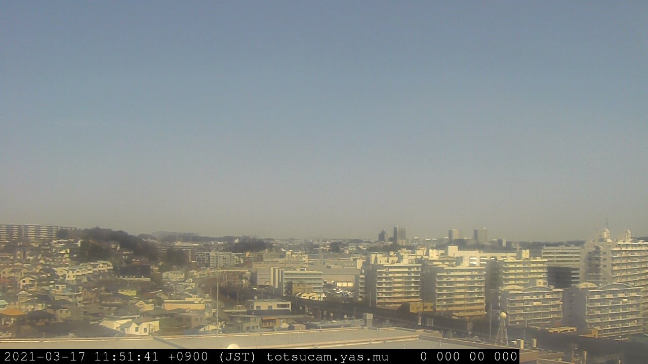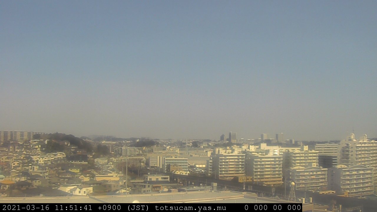 横浜市戸塚駅周辺から 東戸塚方面(北北東)を望む展望カメラの映像です。 左は現在の映像です。 下に並んでいるのは、 7日間に亘る日の出どき、昼間、夕暮れどきの写真(サムネイル)です。 それぞれ、日の出15分前、南中時、日没20分後の写真となっています。 各写真の下にはmpeg形式の動画へのリンクがあります。 それぞれ、日の出、南中、日没の前後1時間の画像です。 右欄にはその日24時間の動画へのリンクがあります。 この7日間以外は日付が一覧表示されています。 日付部分をクリックすると、 その日付から7日分が展開されて表示されます。
